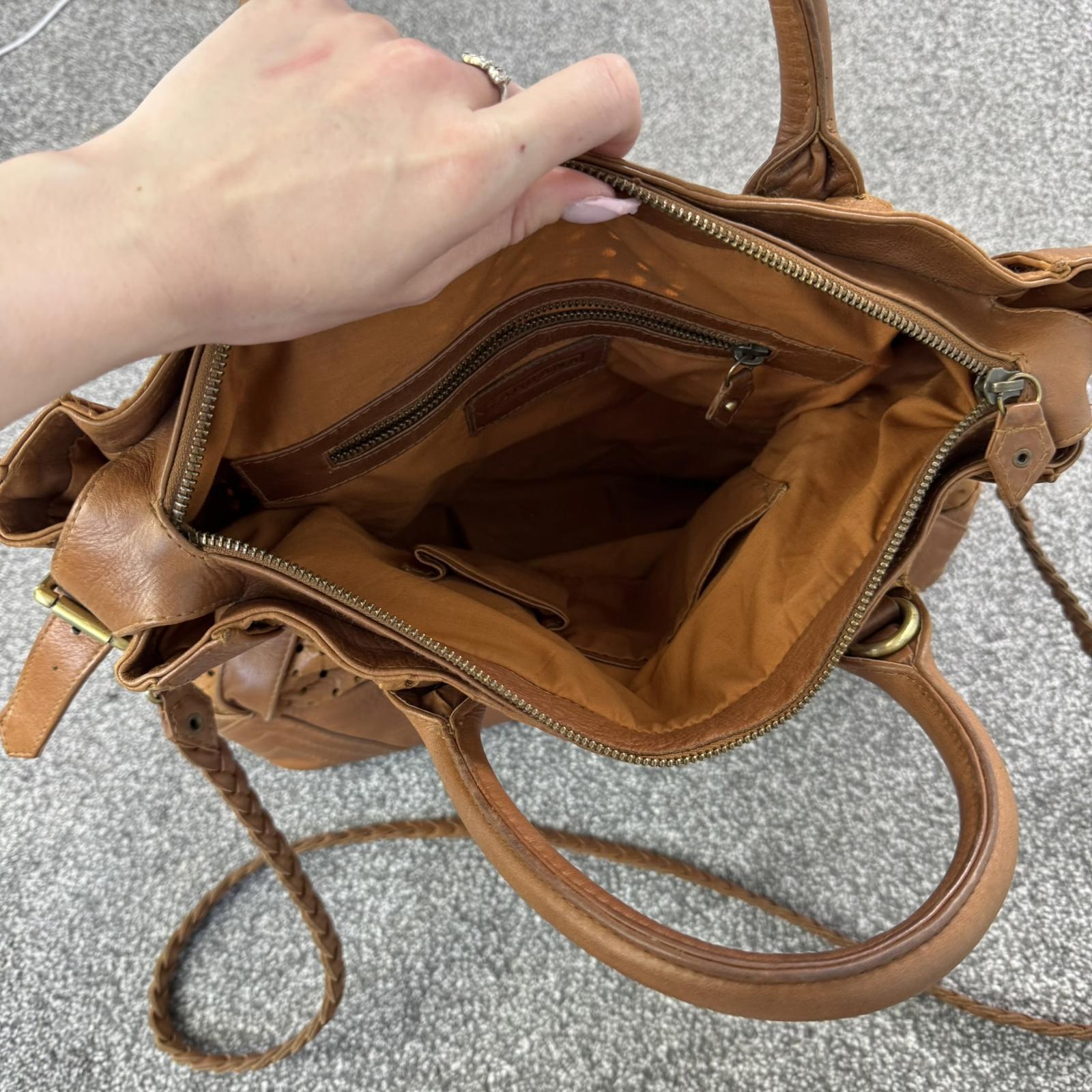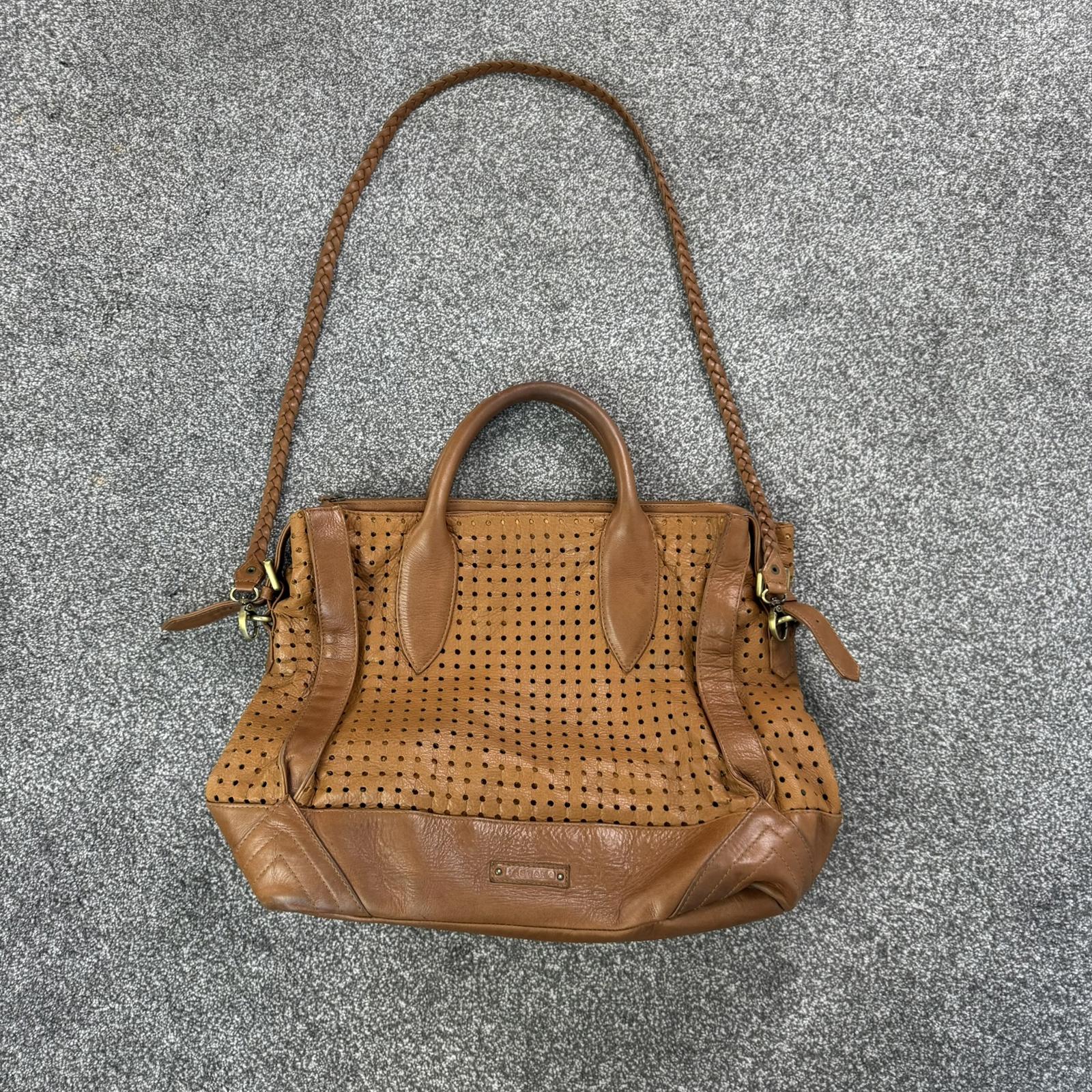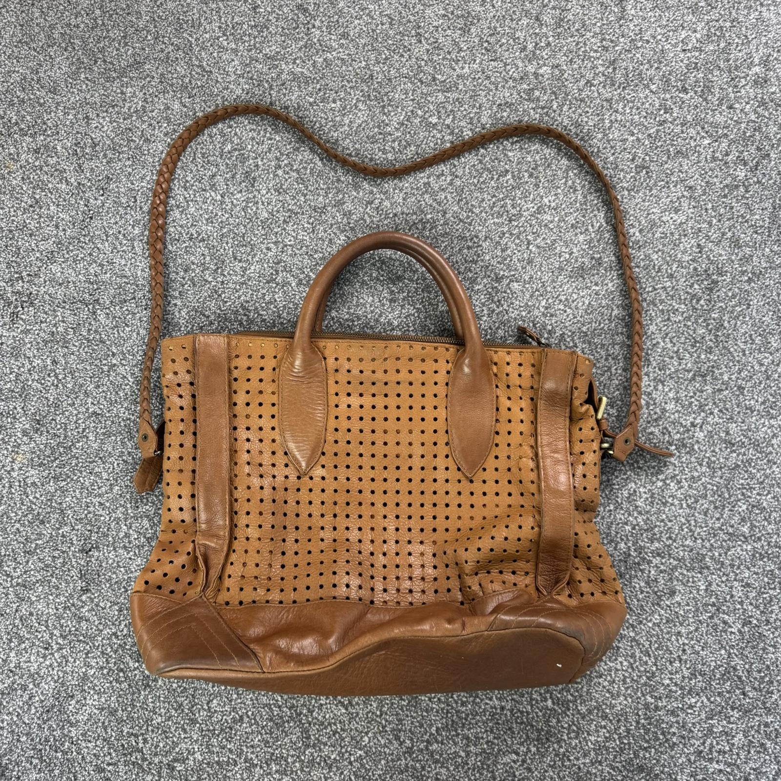 Perforated leather pattern- spotted/ cut out holes, includes a detachable braided shoulder/ crossbody strap, zipper closure, zip compartment and pockets on inside, gold hardware buckles, stitching pattern, tan light brown colour