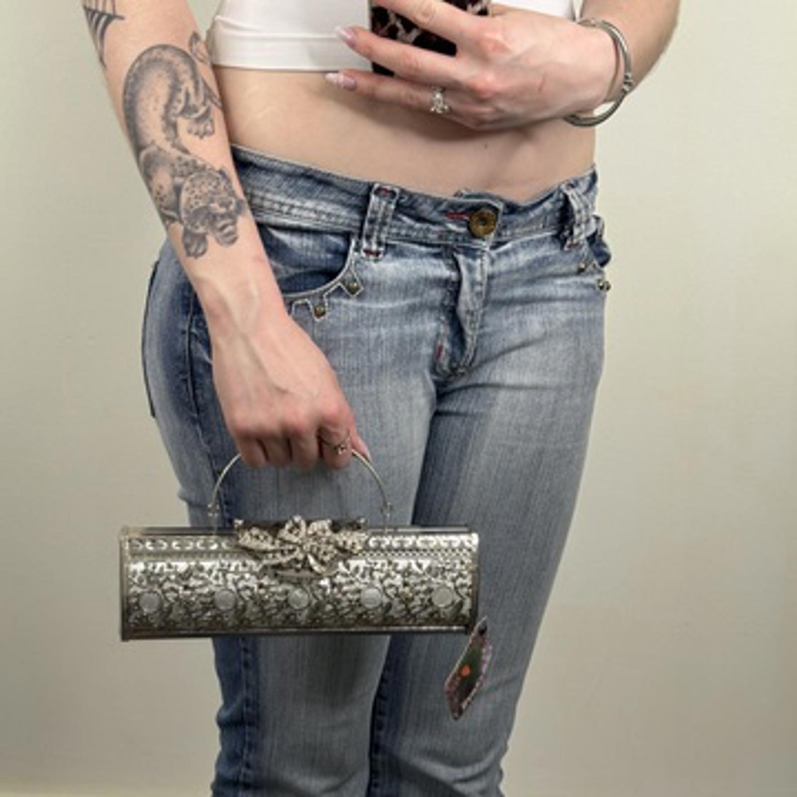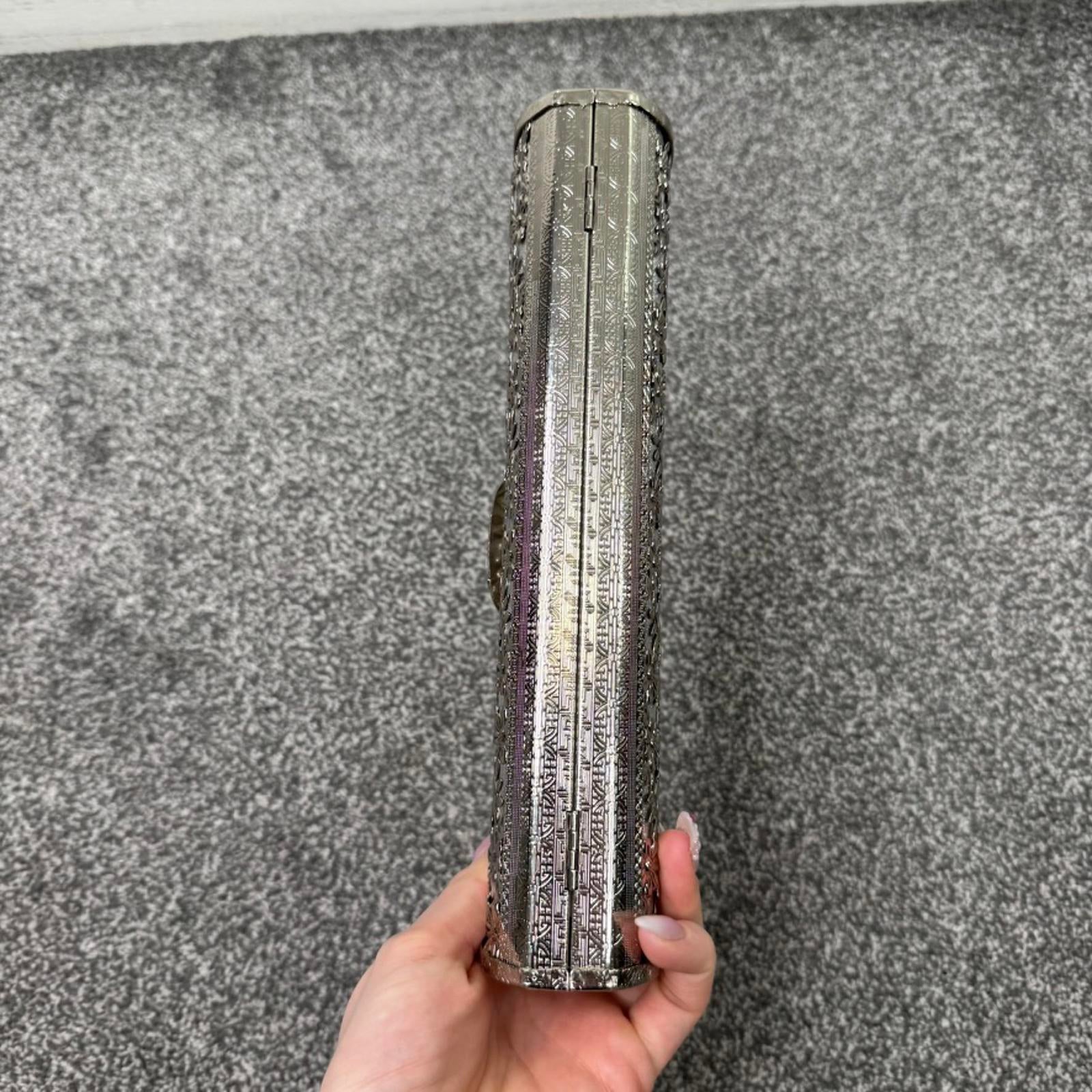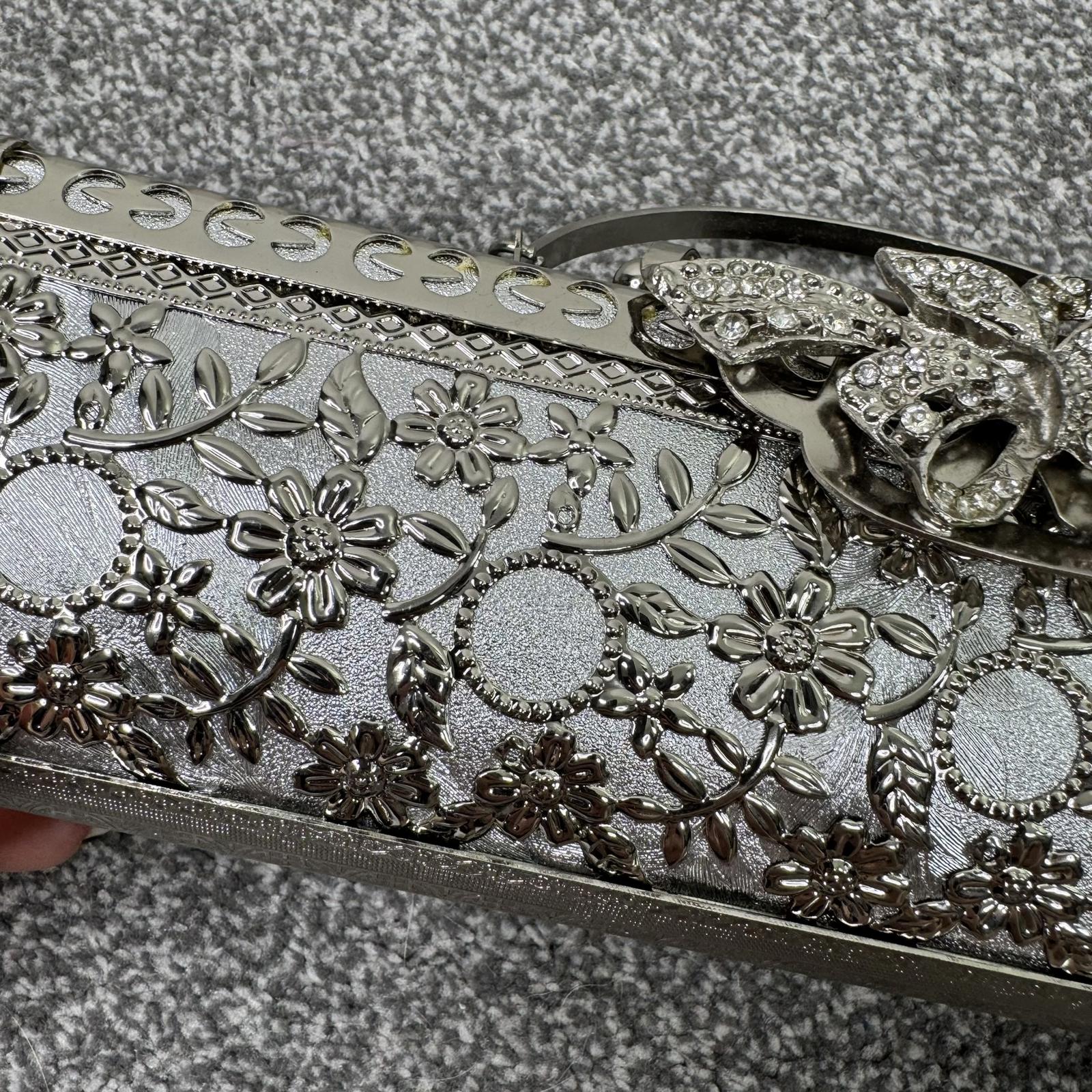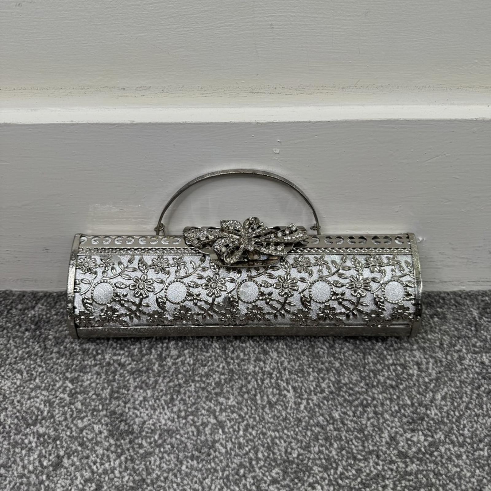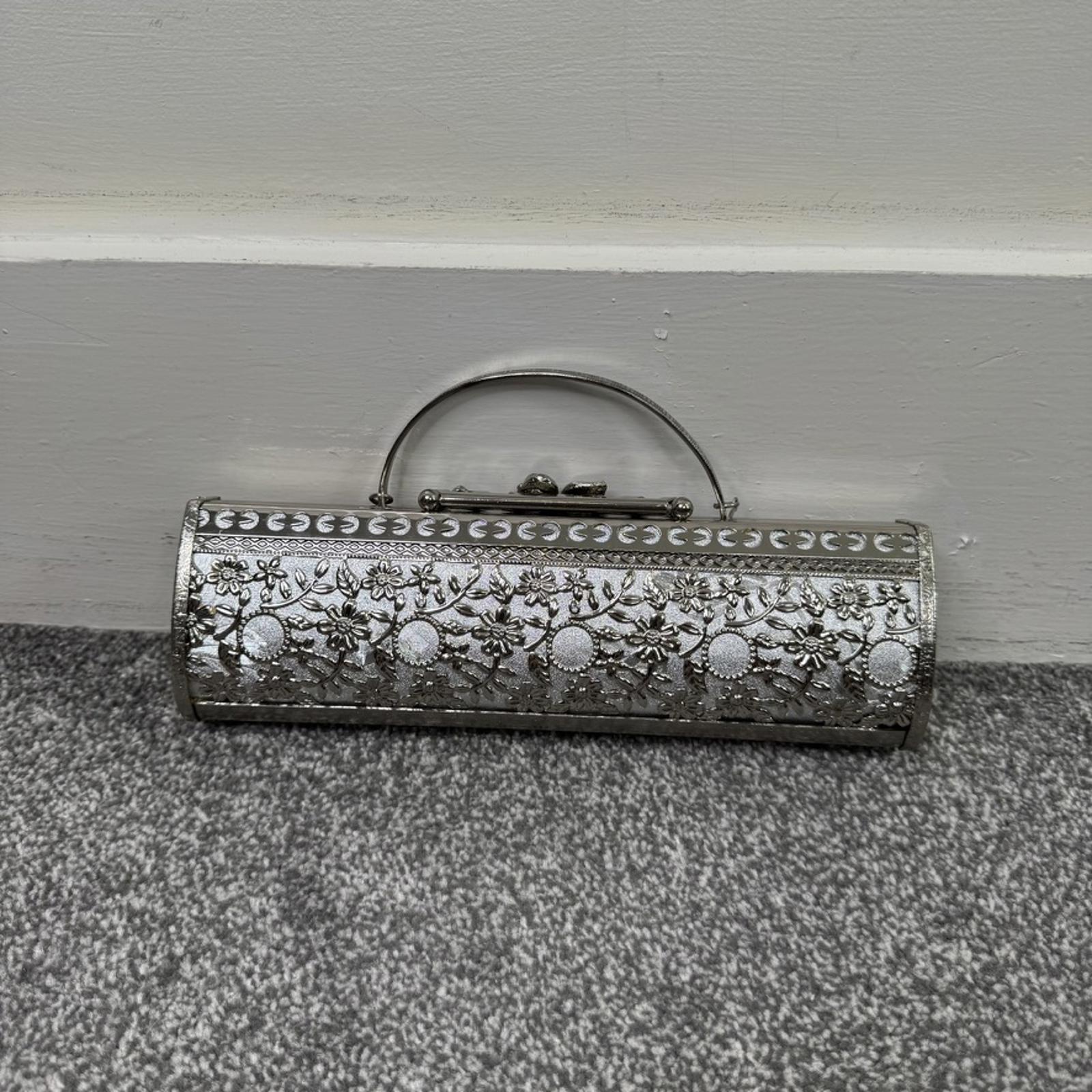 Silver tone ornate metal evening clutch bag with handle baguette long small