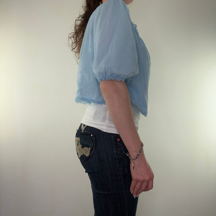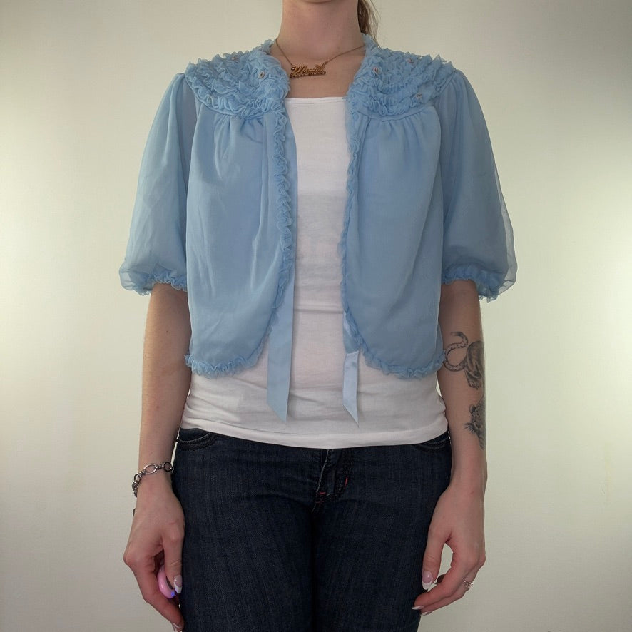 Lingerie nightwear cape, tie bow front, short puff sleeves, baby blue, cape throw over, true vintage piece