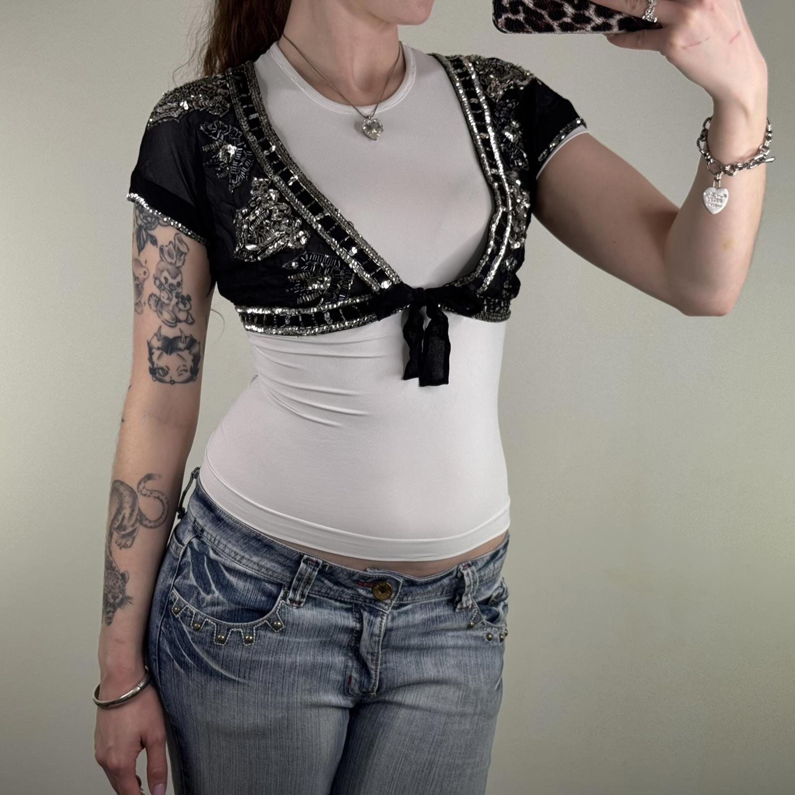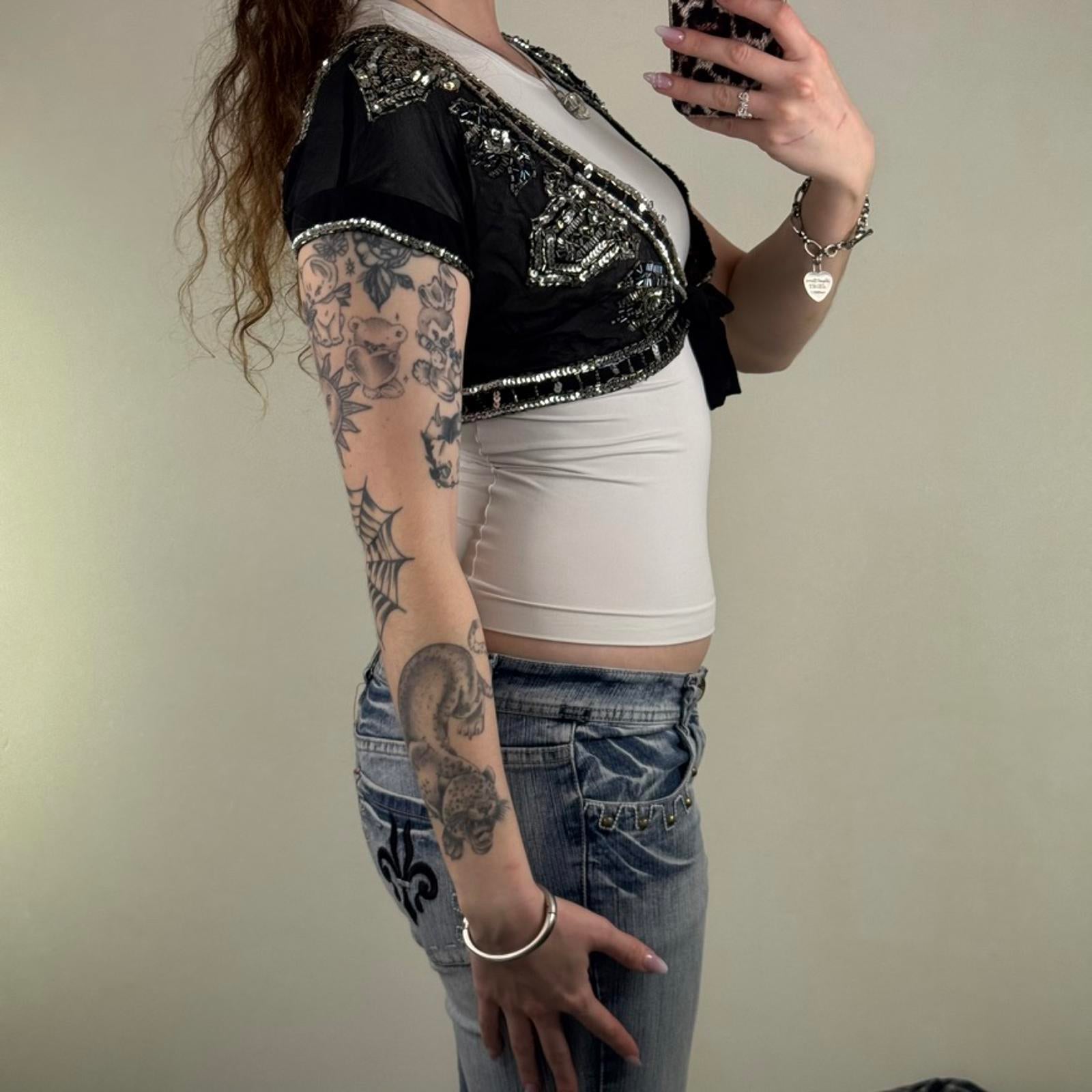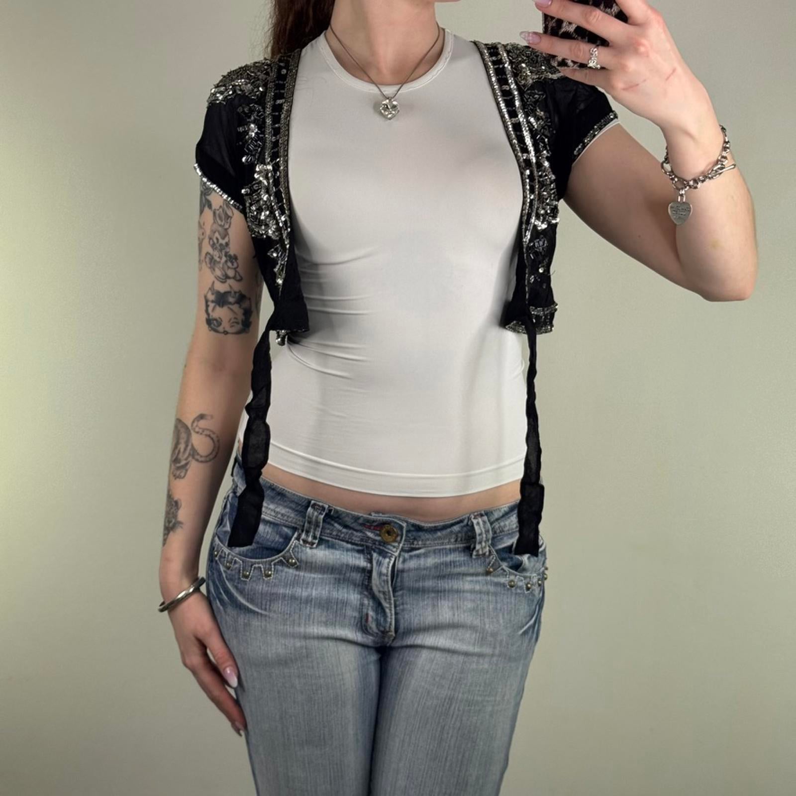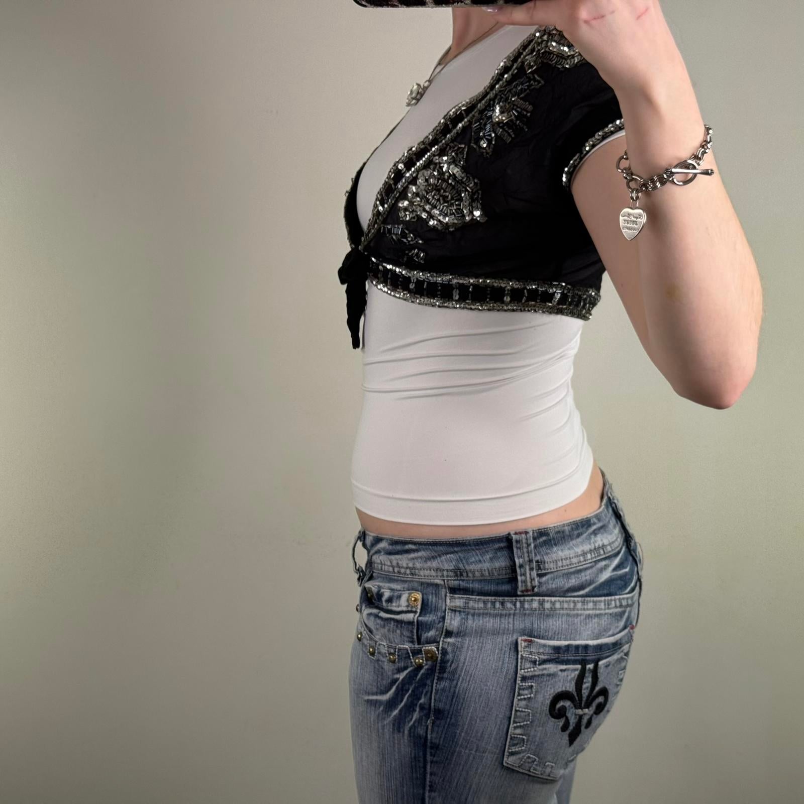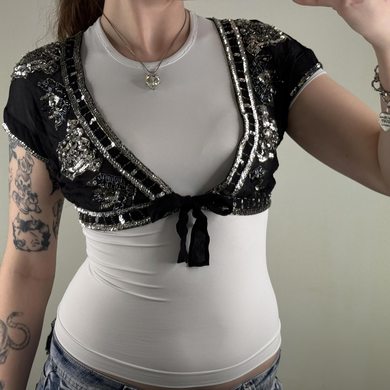 Y2K vintage 100% pure silk cropped bolero cardigan shawl sequin bow sheer v neck