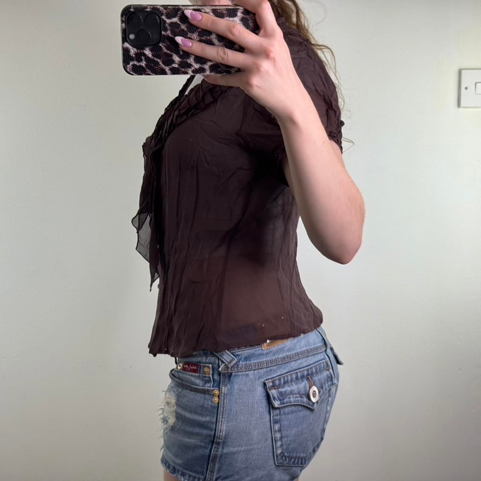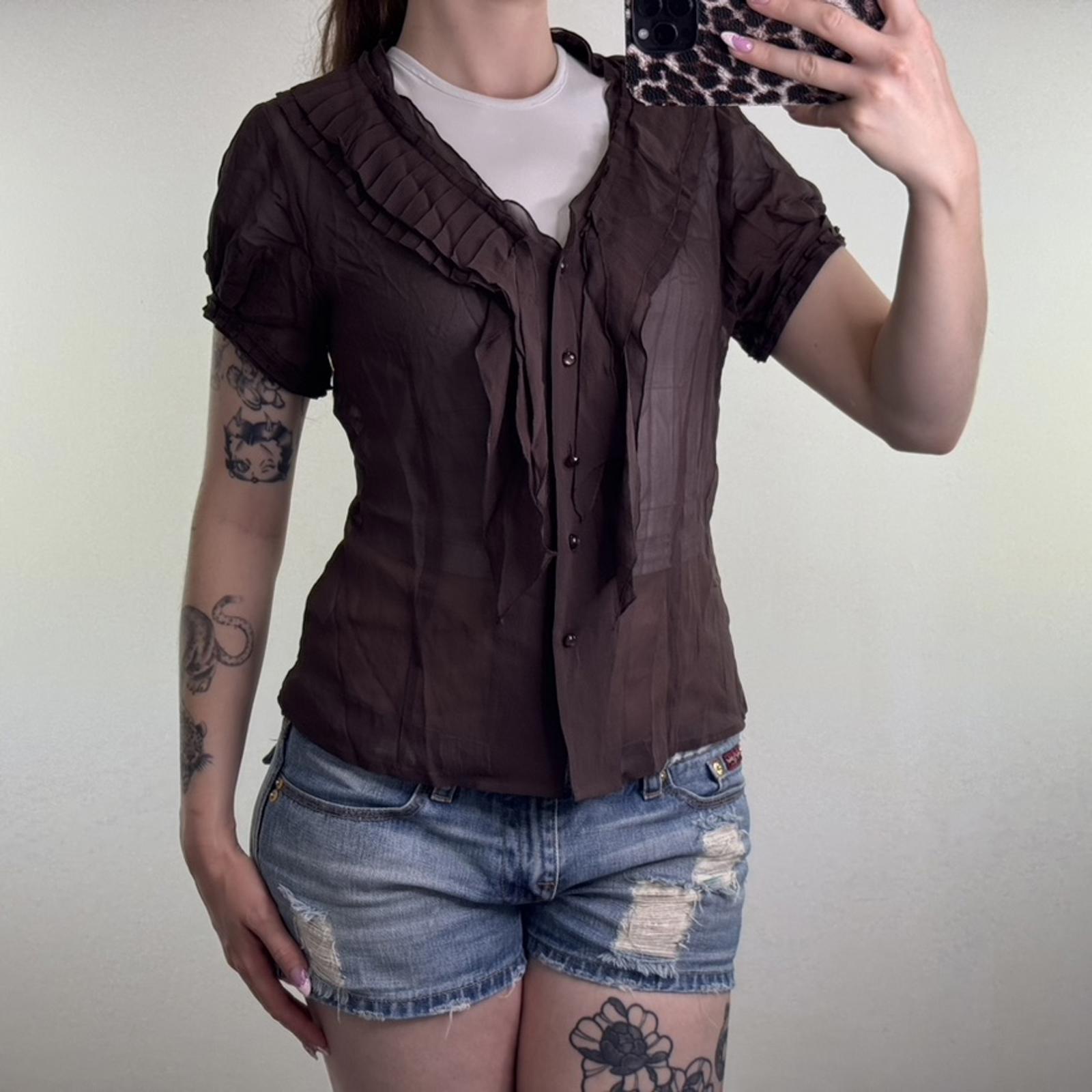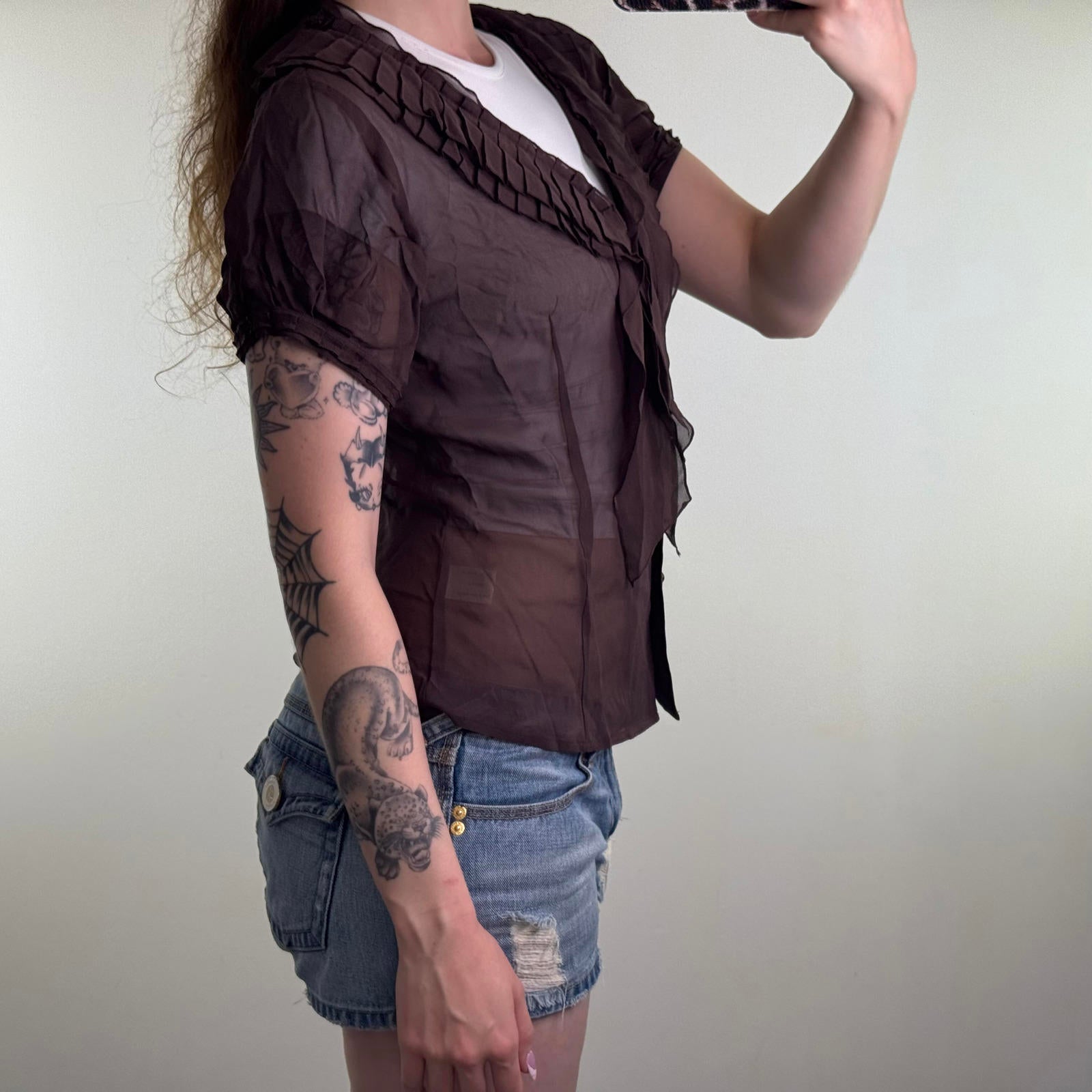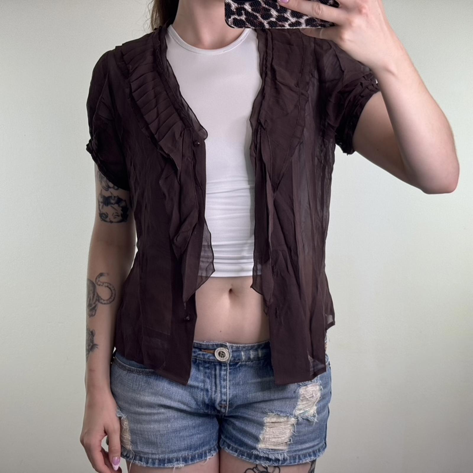 Y2K vintage 100% pure silk short sleeve blouse v neck pleated ruffle frill sheer