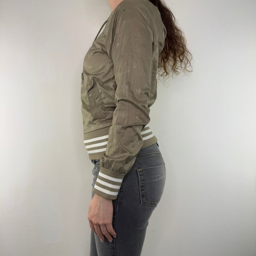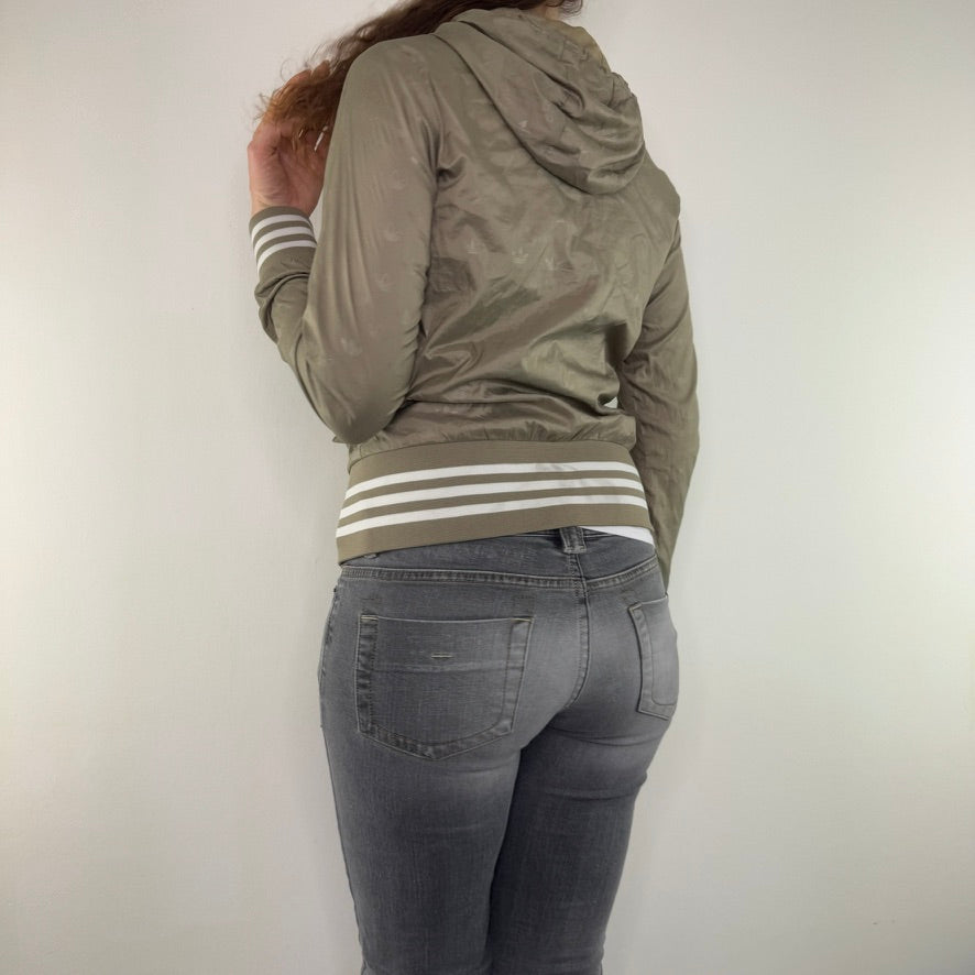 Lightweight, light khaki green, shiny material with Trefoil print all over, knit striped cuffs and waist, drawstring hood, side pockets, track jacket streetwear style