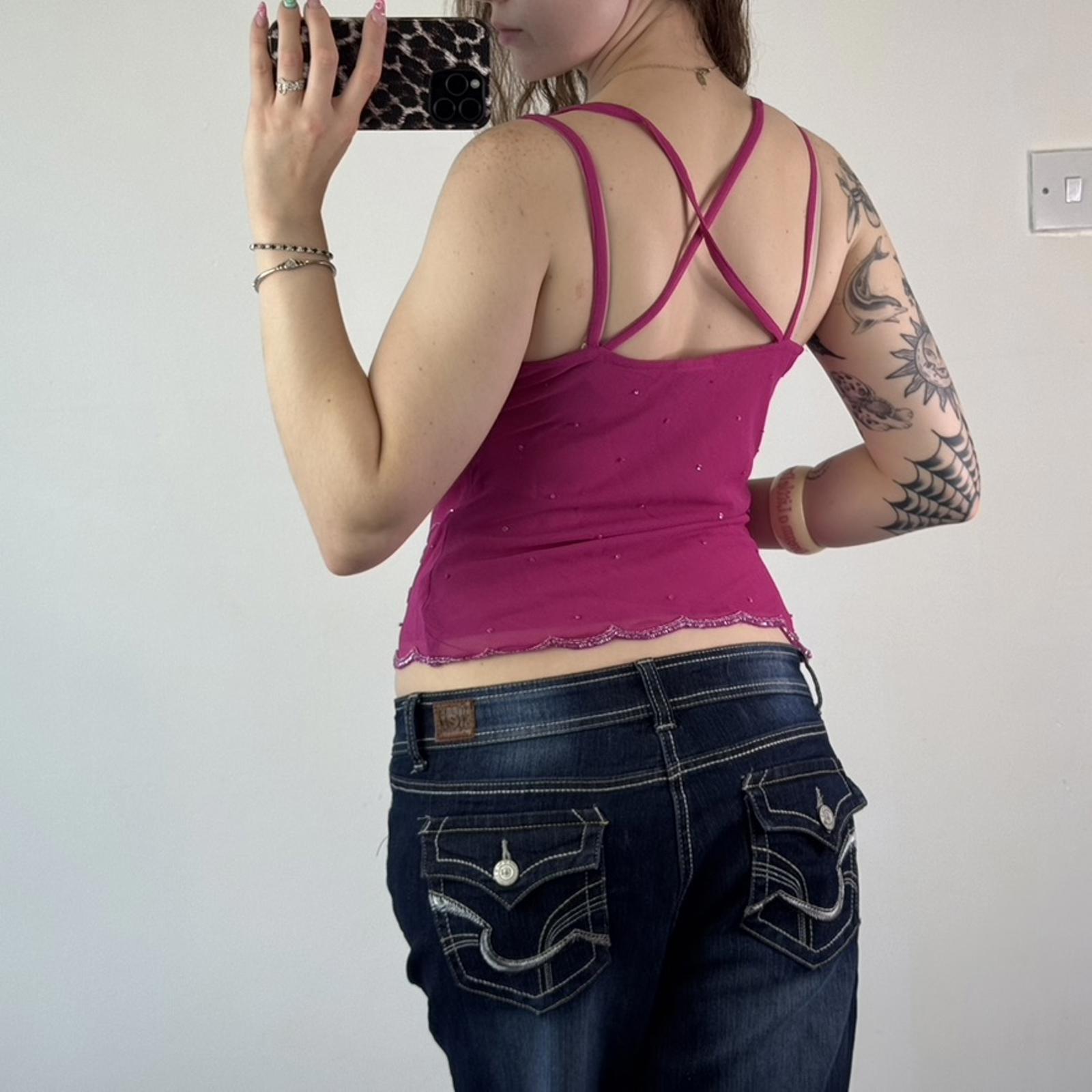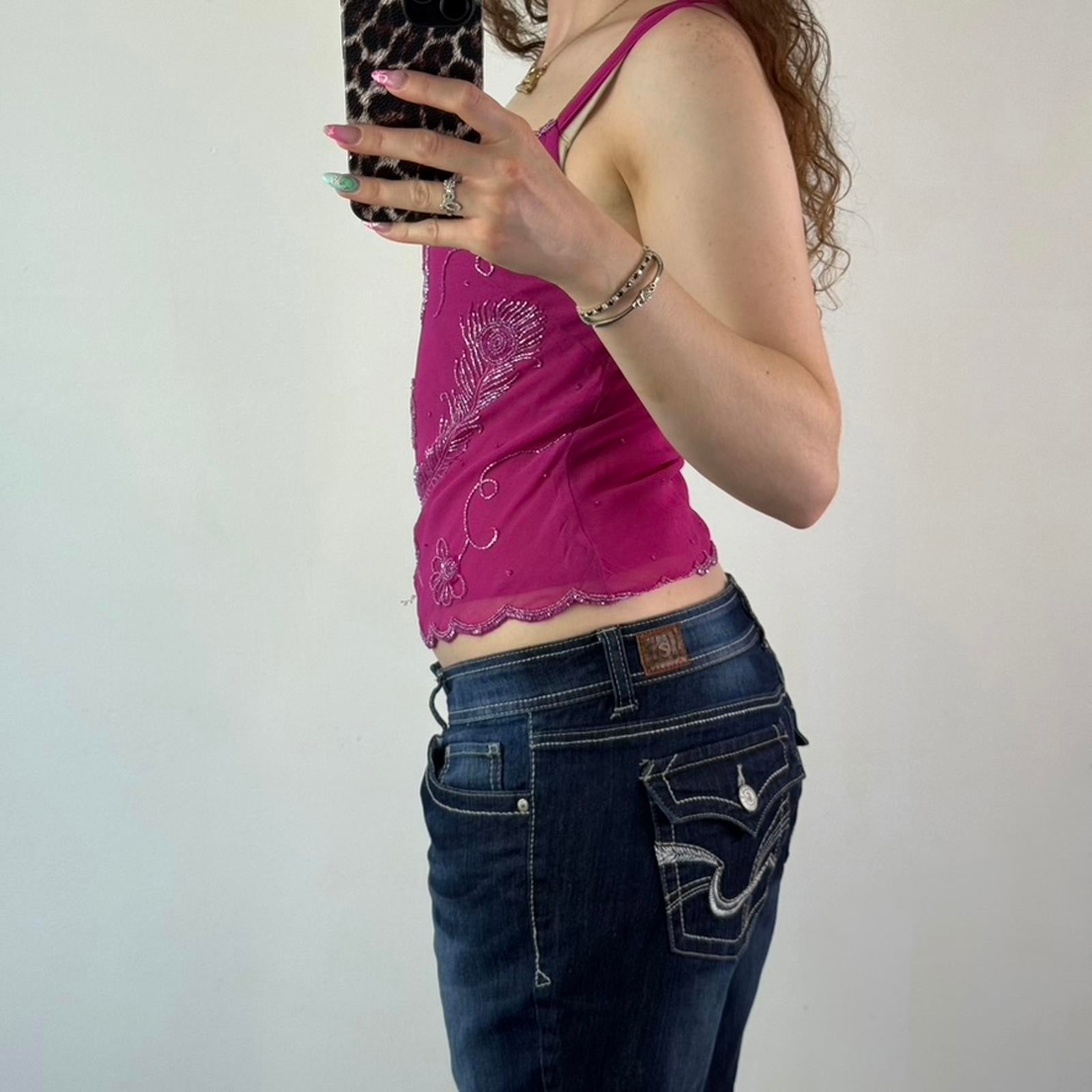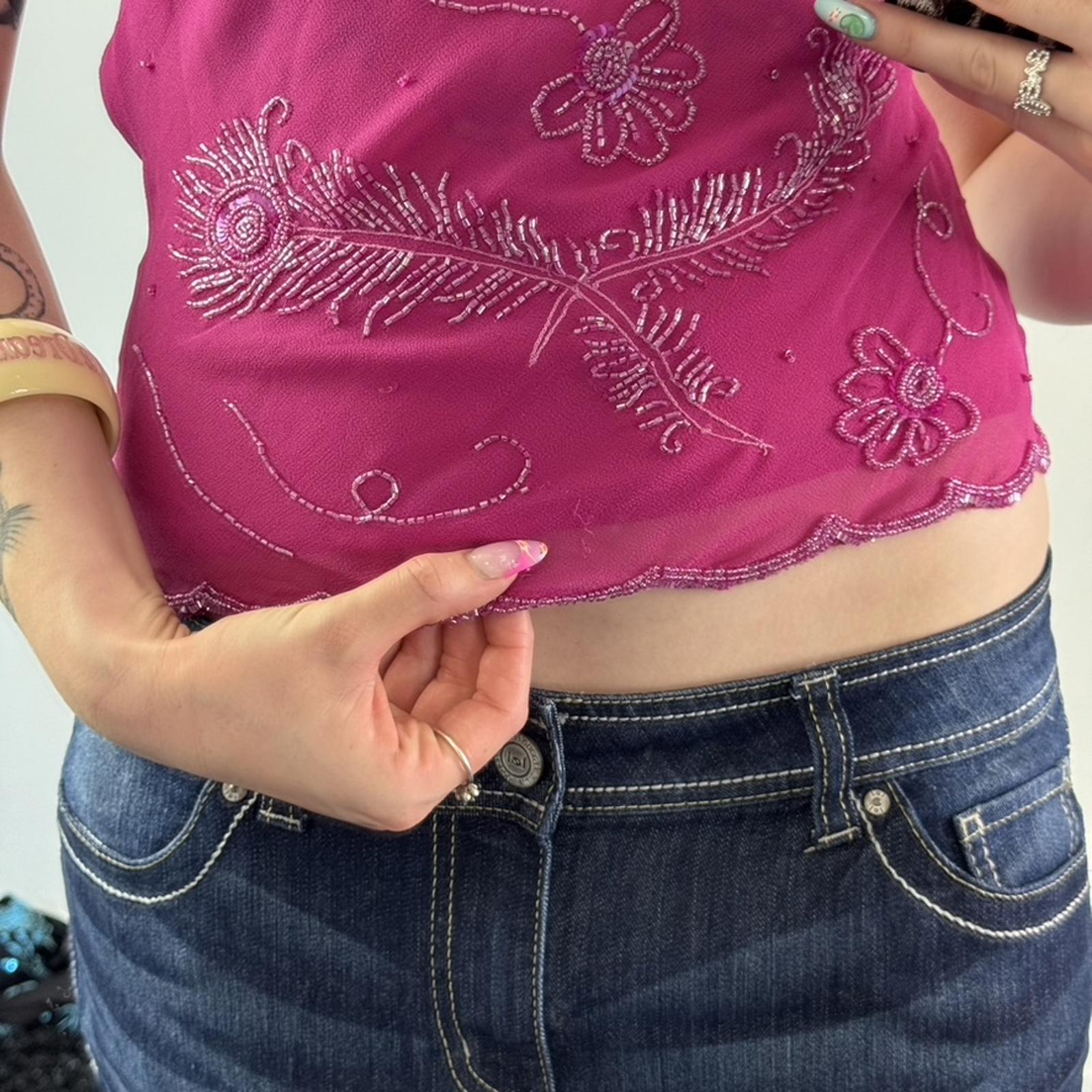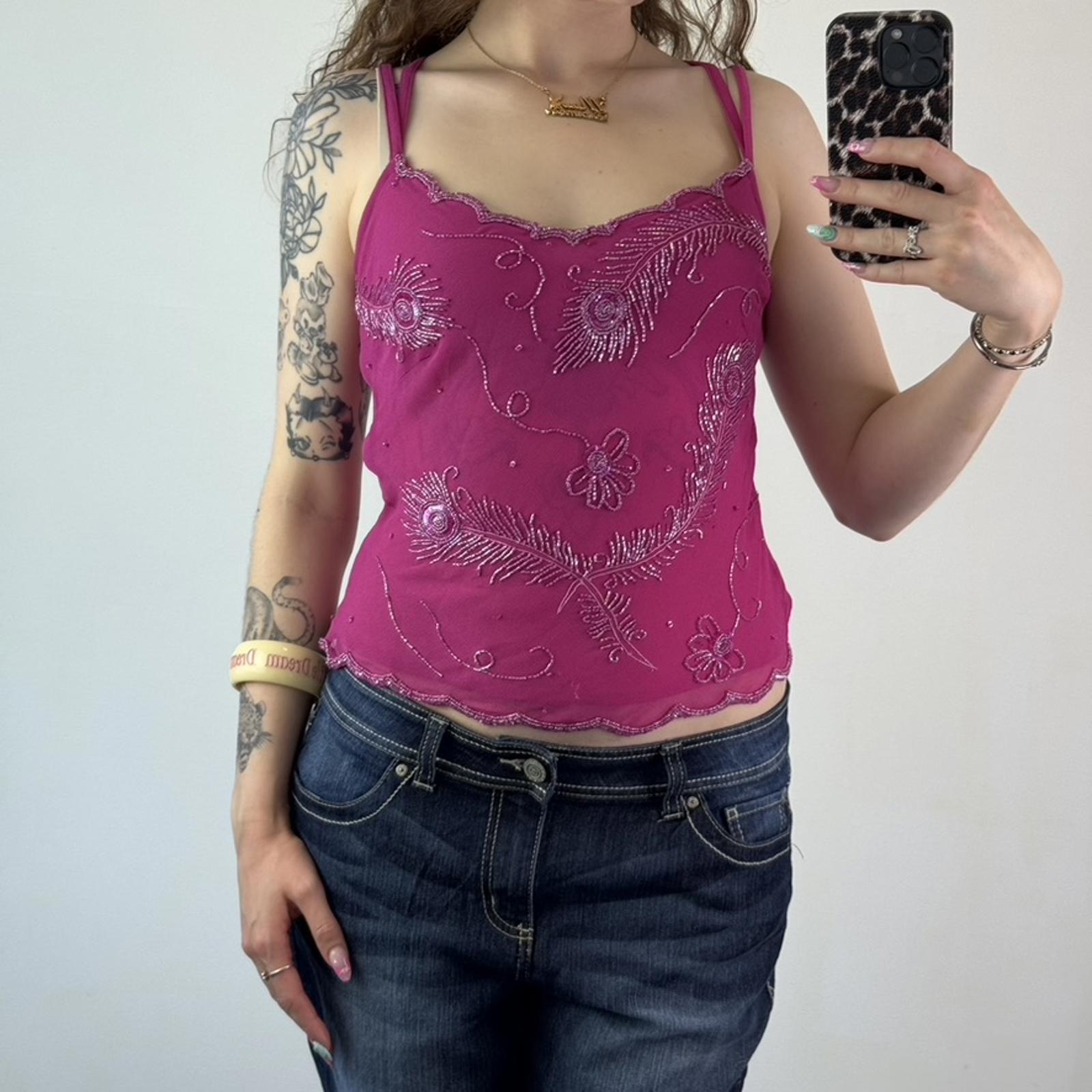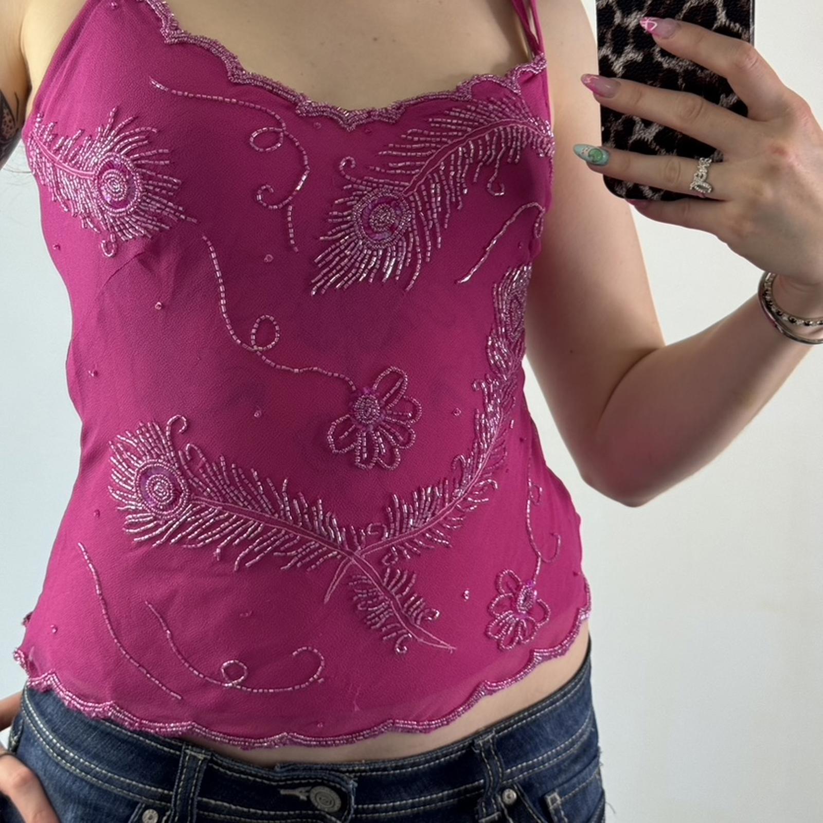 Y2K vintage Bay embellished strappy top floral feather racerback beaded pink