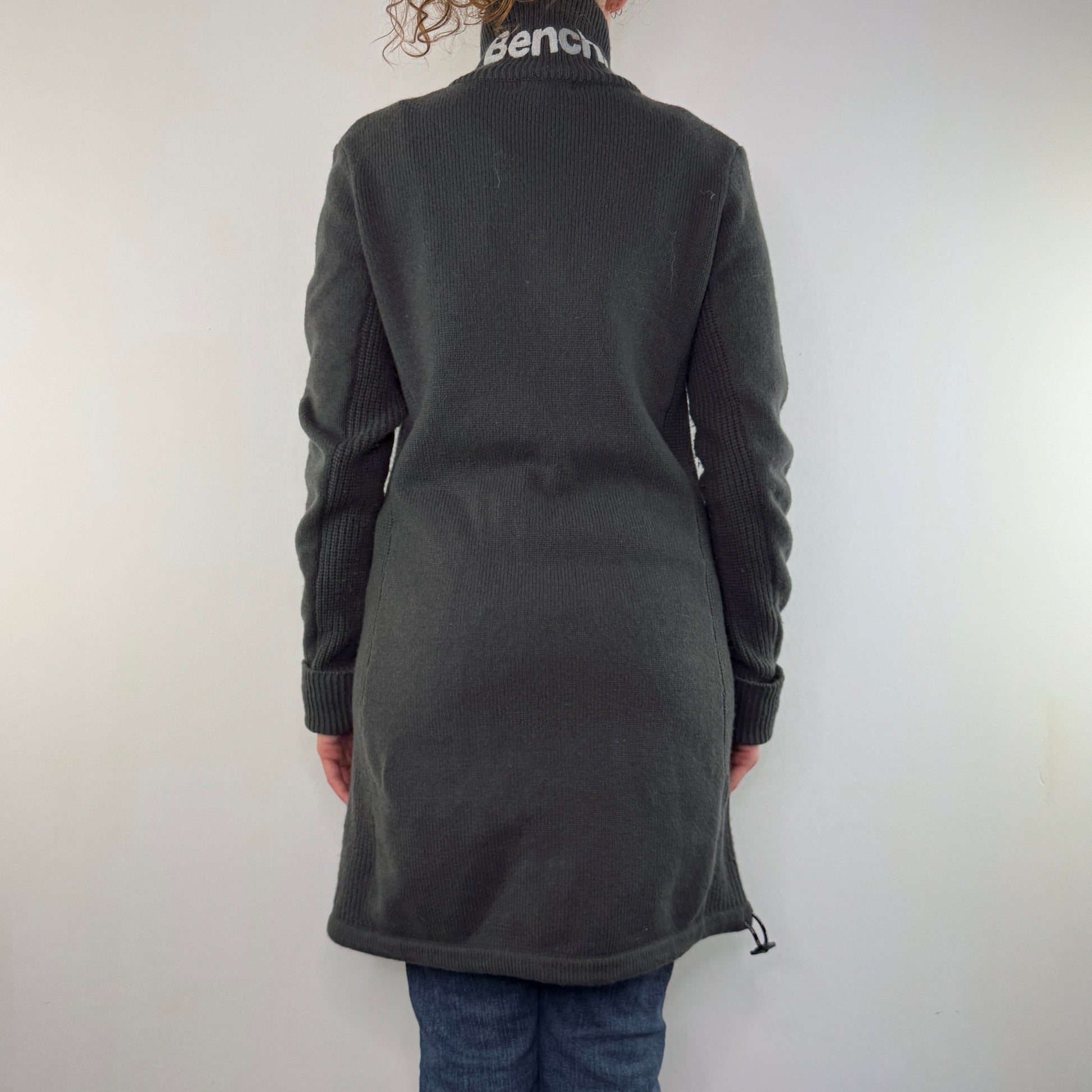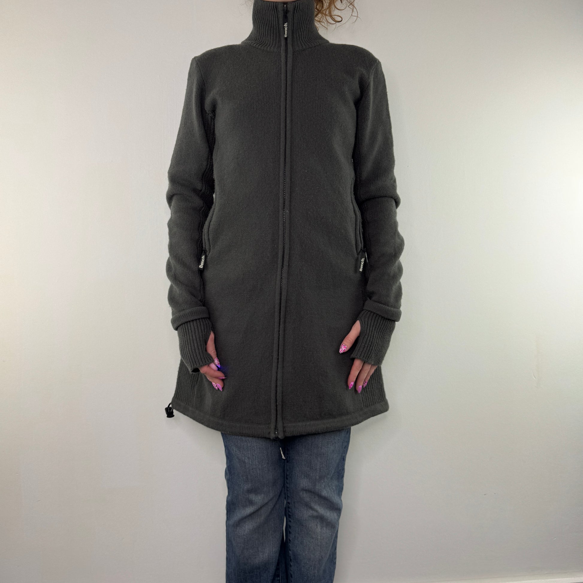 Thumb holes, double dual zipper, high neck, long line full length cardigan, Bench logo spell out on back of neck, pockets, toggles, fitted cinched look