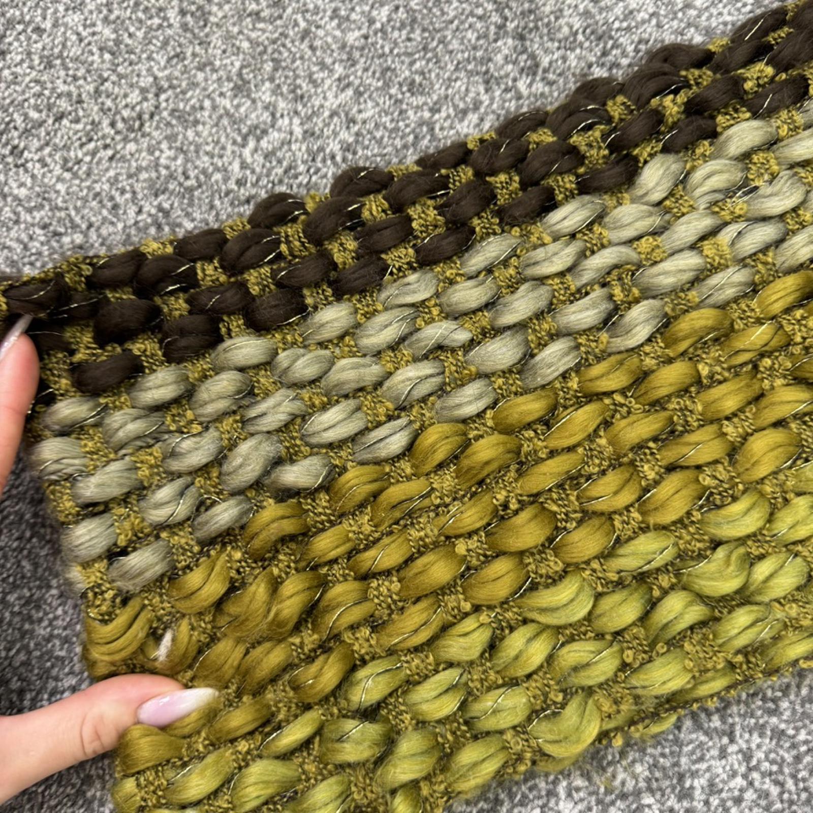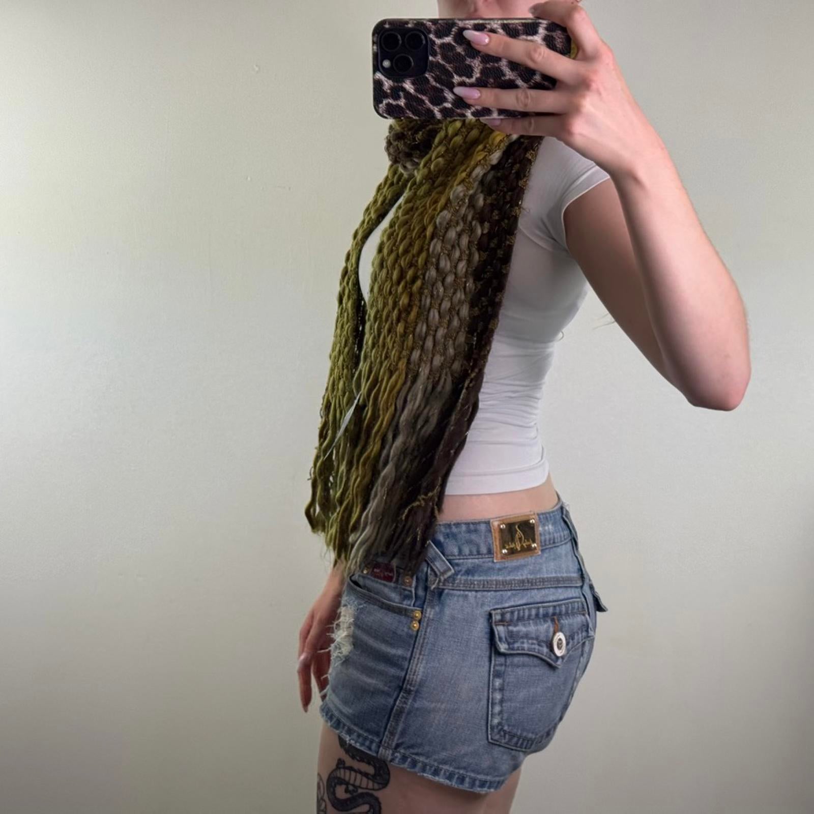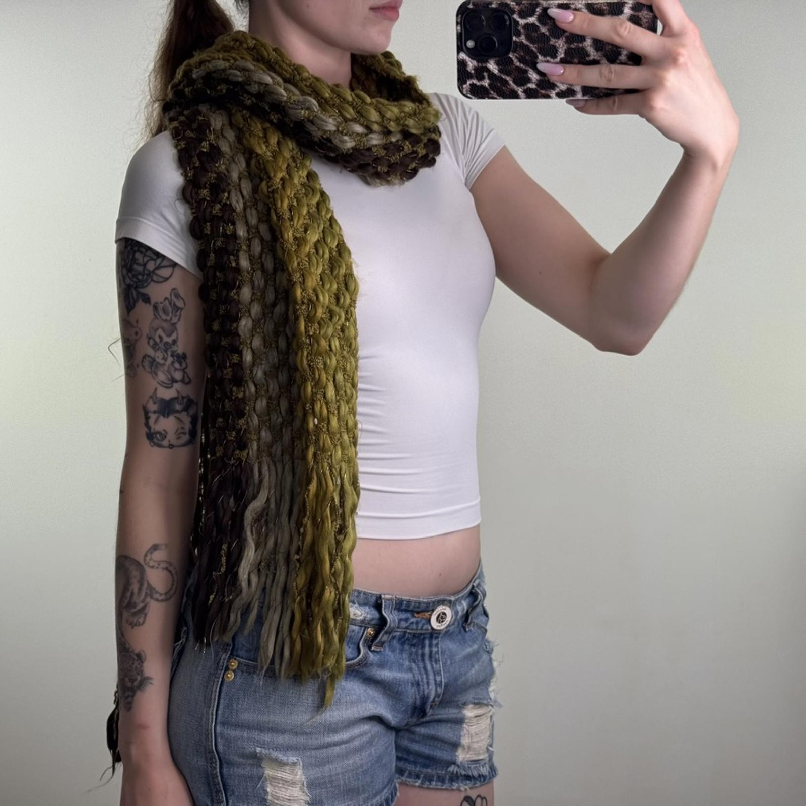 Y2K vintage chunky knit sparkly scarf two tone green brown tassel thick