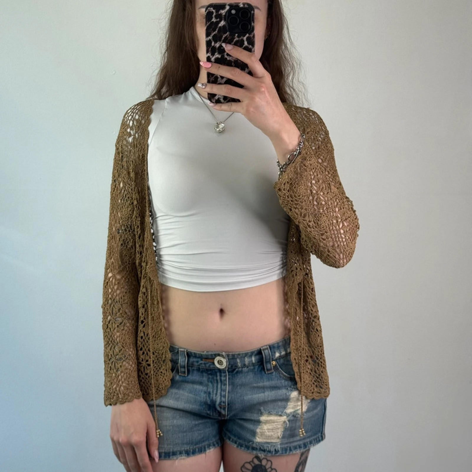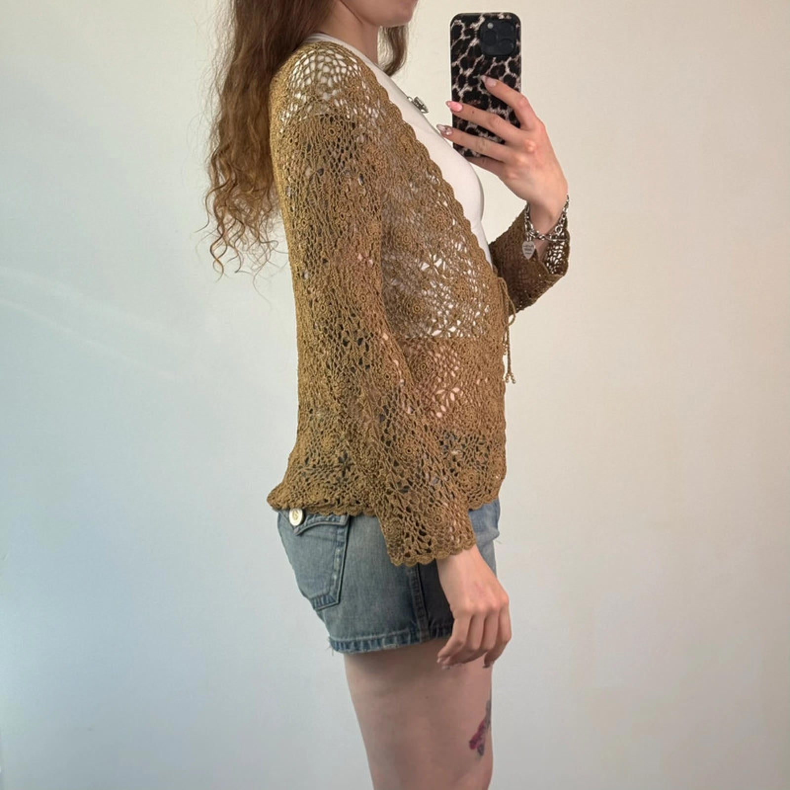 Y2K vintage crochet floral long sleeve cardigan boho tie bow front sheer summer
