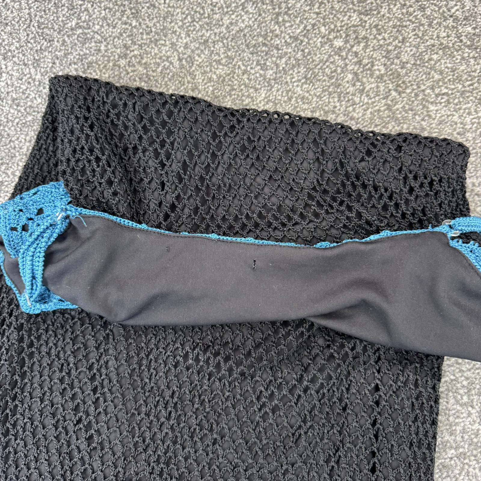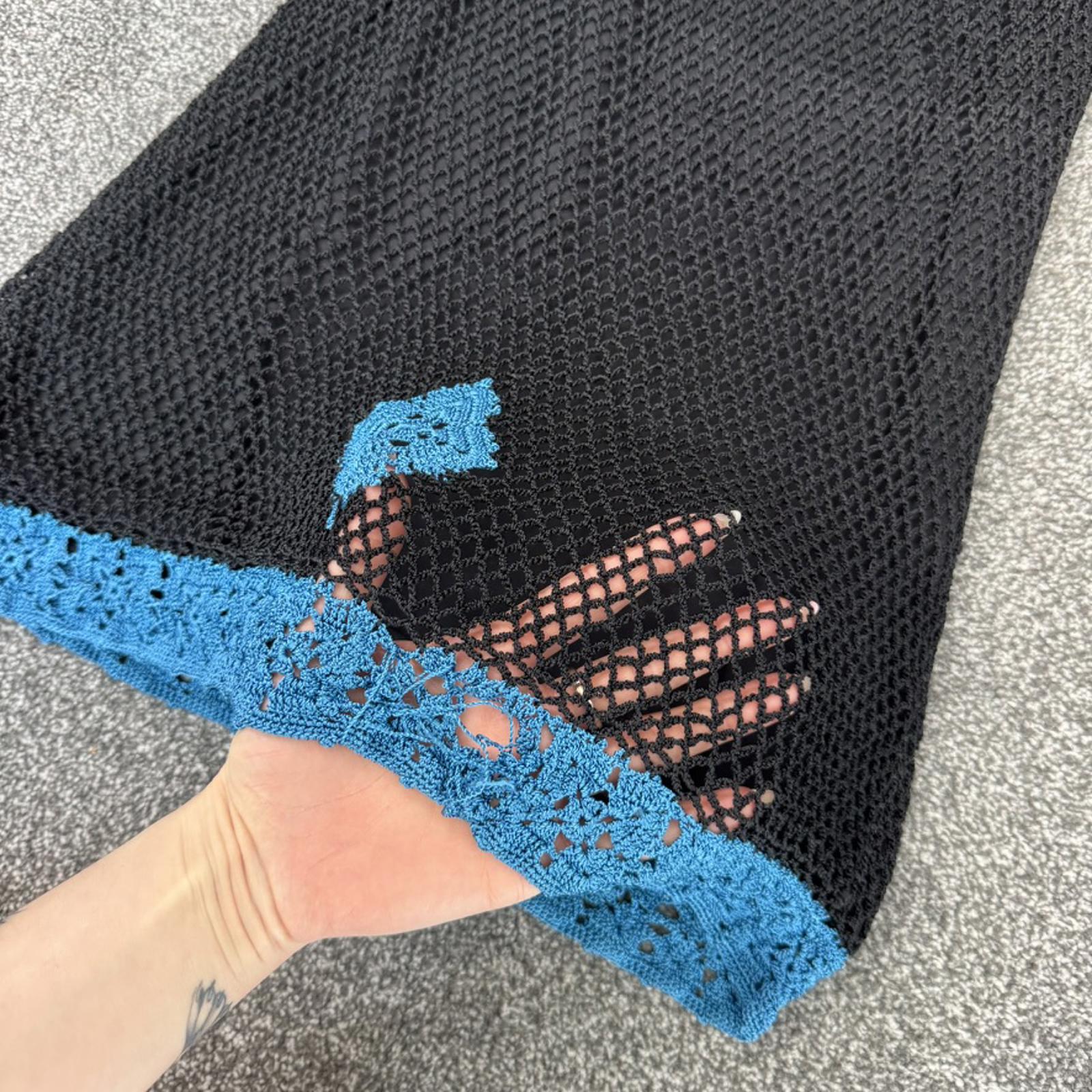 Black crochet design with blue diamond square pattern, adjustable straps