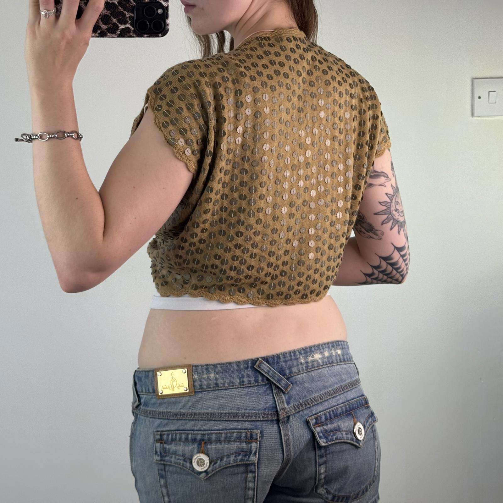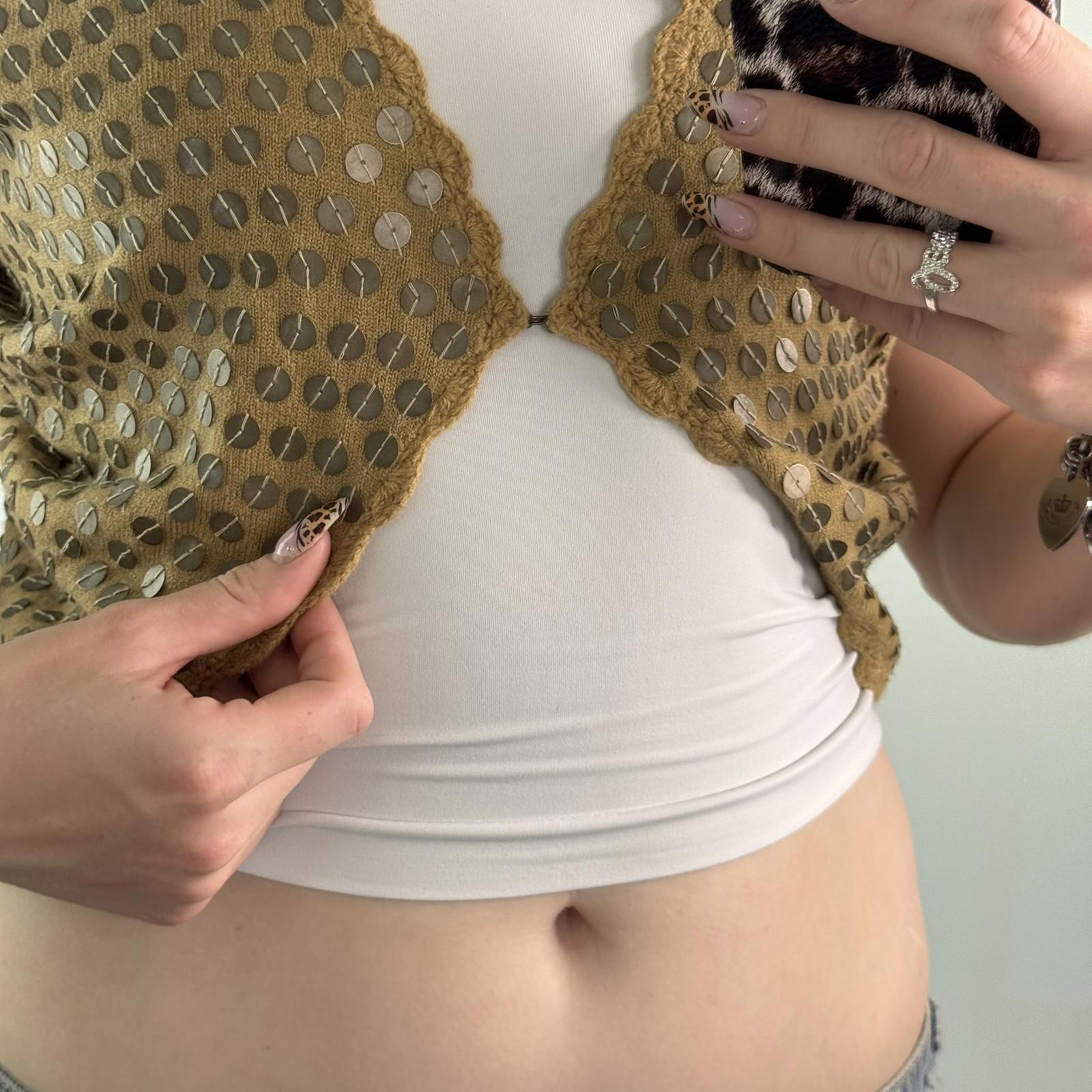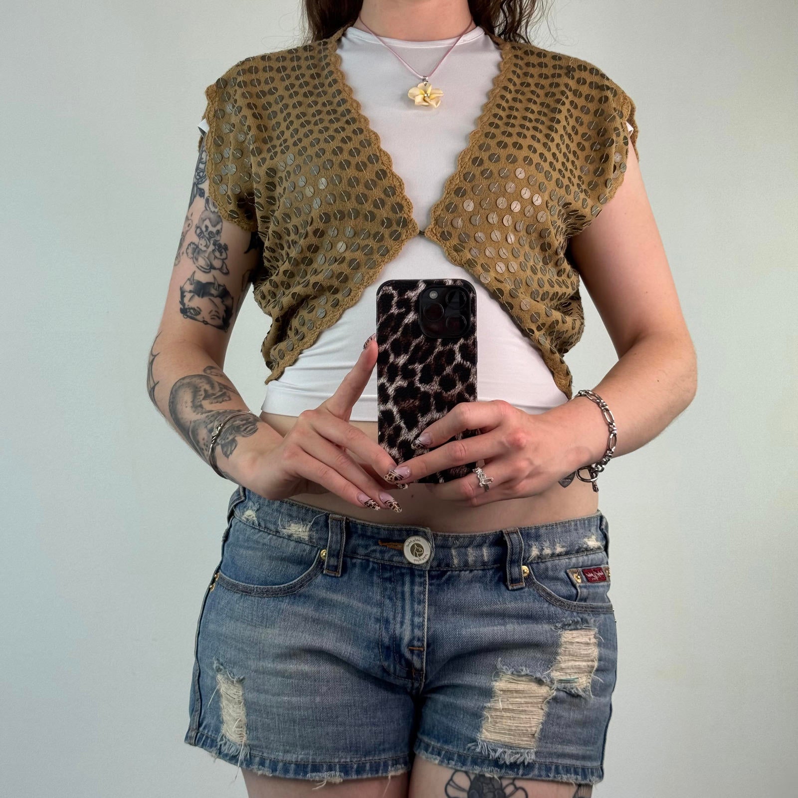 Y2K vintage cropped cardigan metal disc embellished short sleeve knitted beige