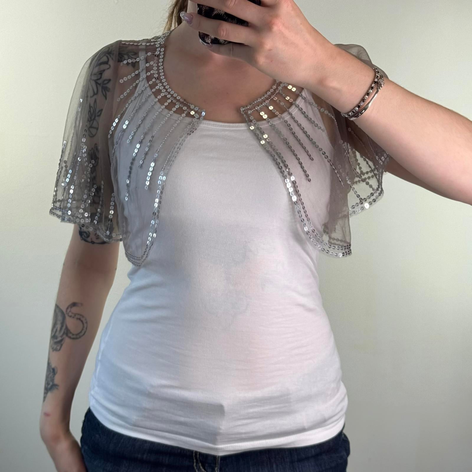 Y2K vintage cropped mesh shawl cape sequin embellished sheer boho festival chic