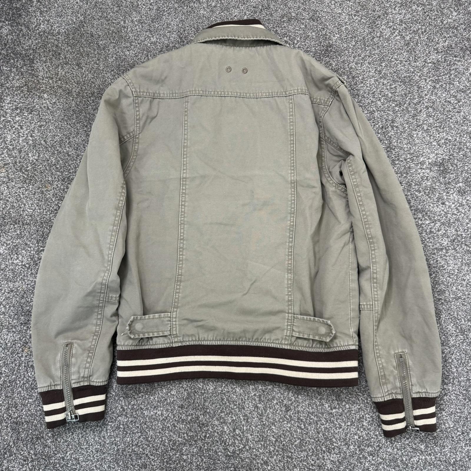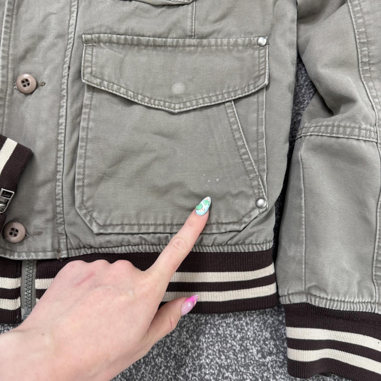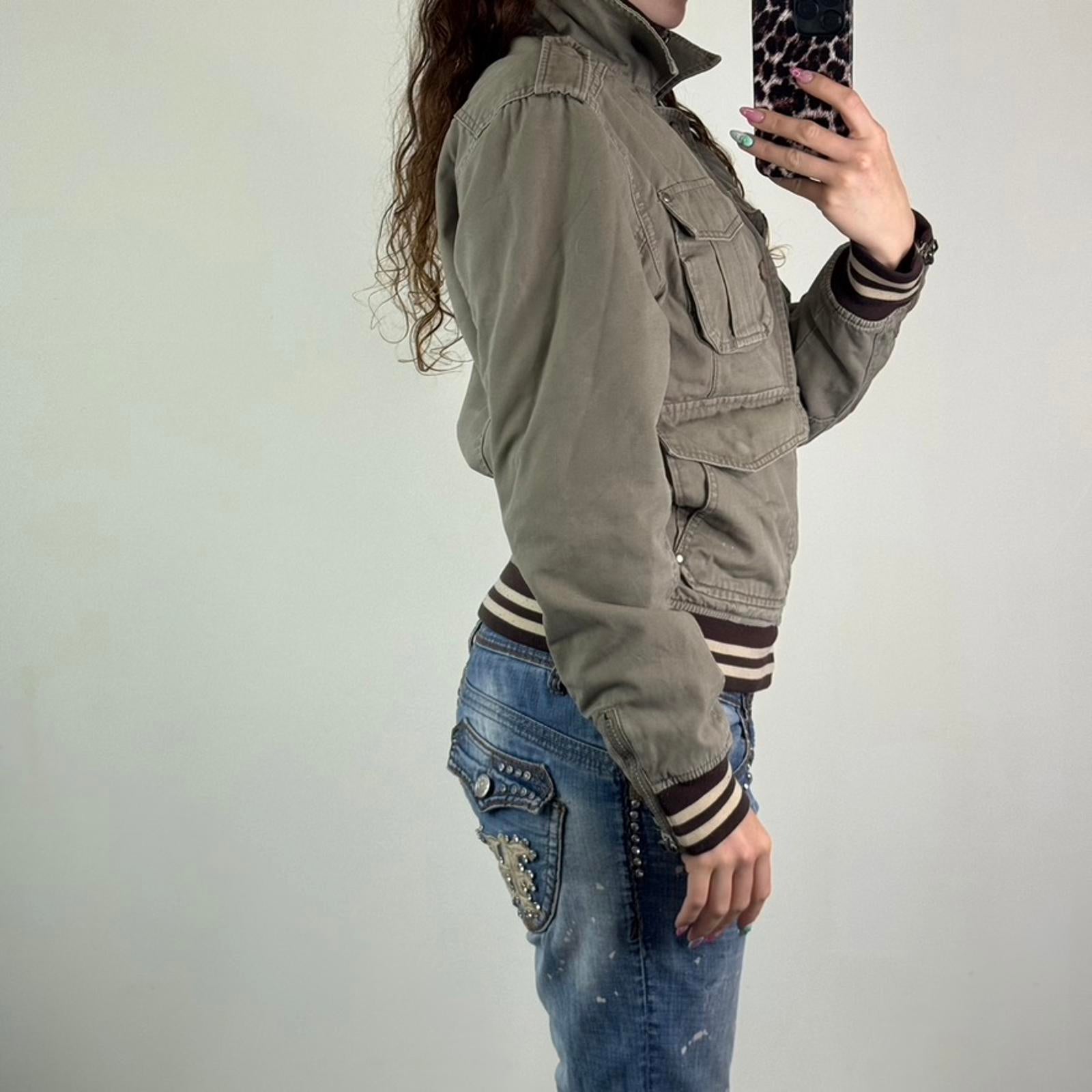 Archive biker style jacket, cream/ brown knitted stretchy cuffs collar waistband, khaki green denim colour, cargo pockets, utility