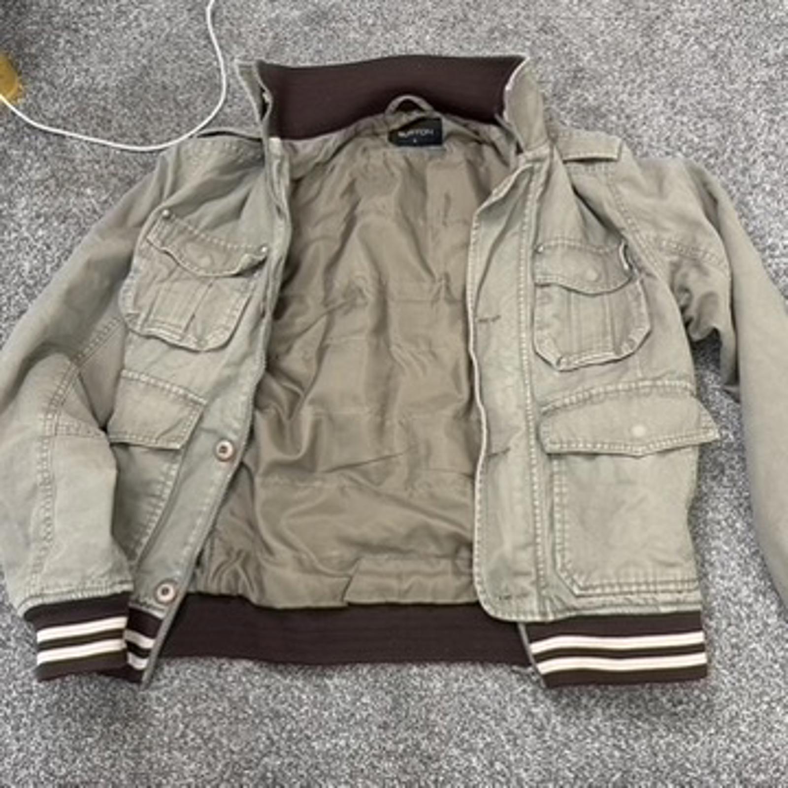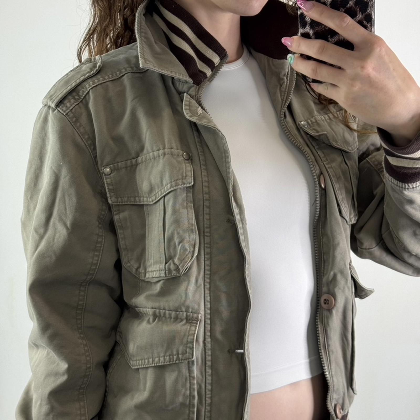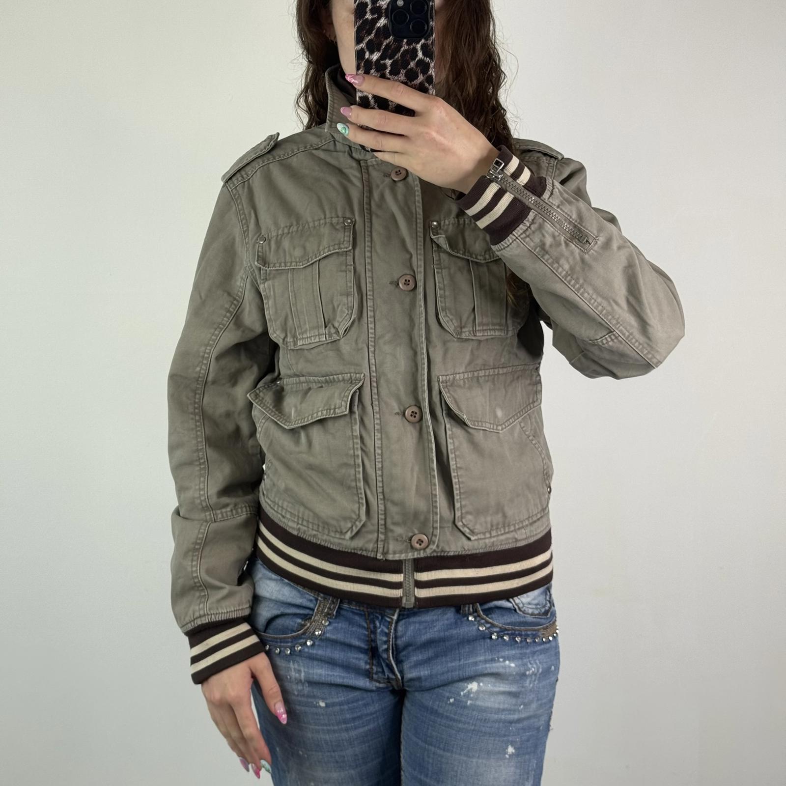 Archive biker style jacket, cream/ brown knitted stretchy cuffs collar waistband, khaki green denim colour, cargo pockets, utility