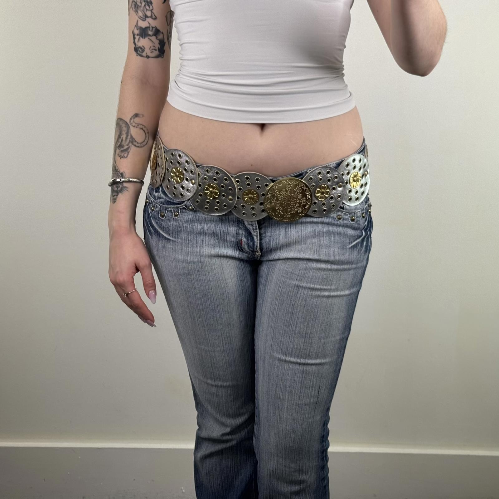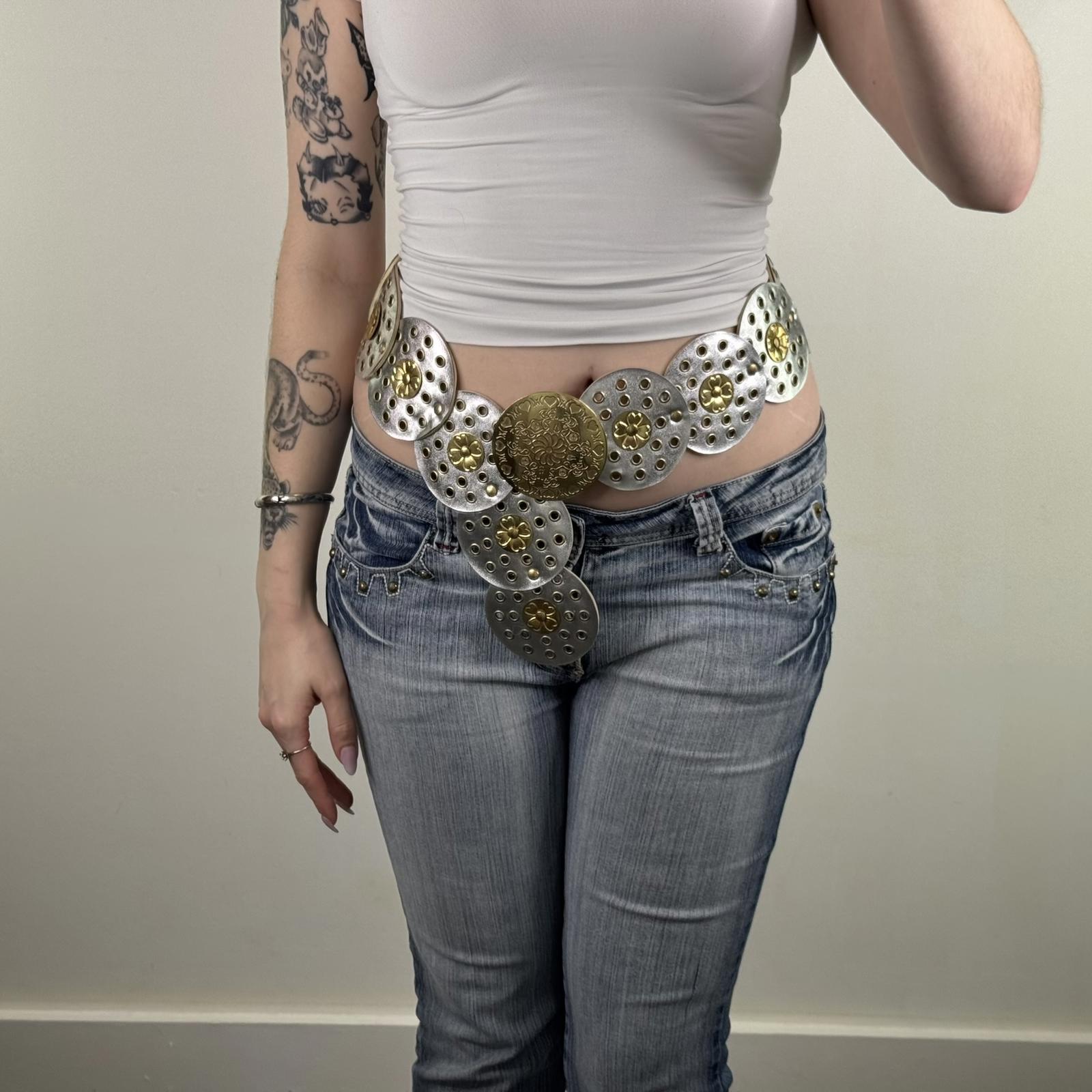 Y2K vintage disc circle belt boho silver gold chunky faux leather shiny