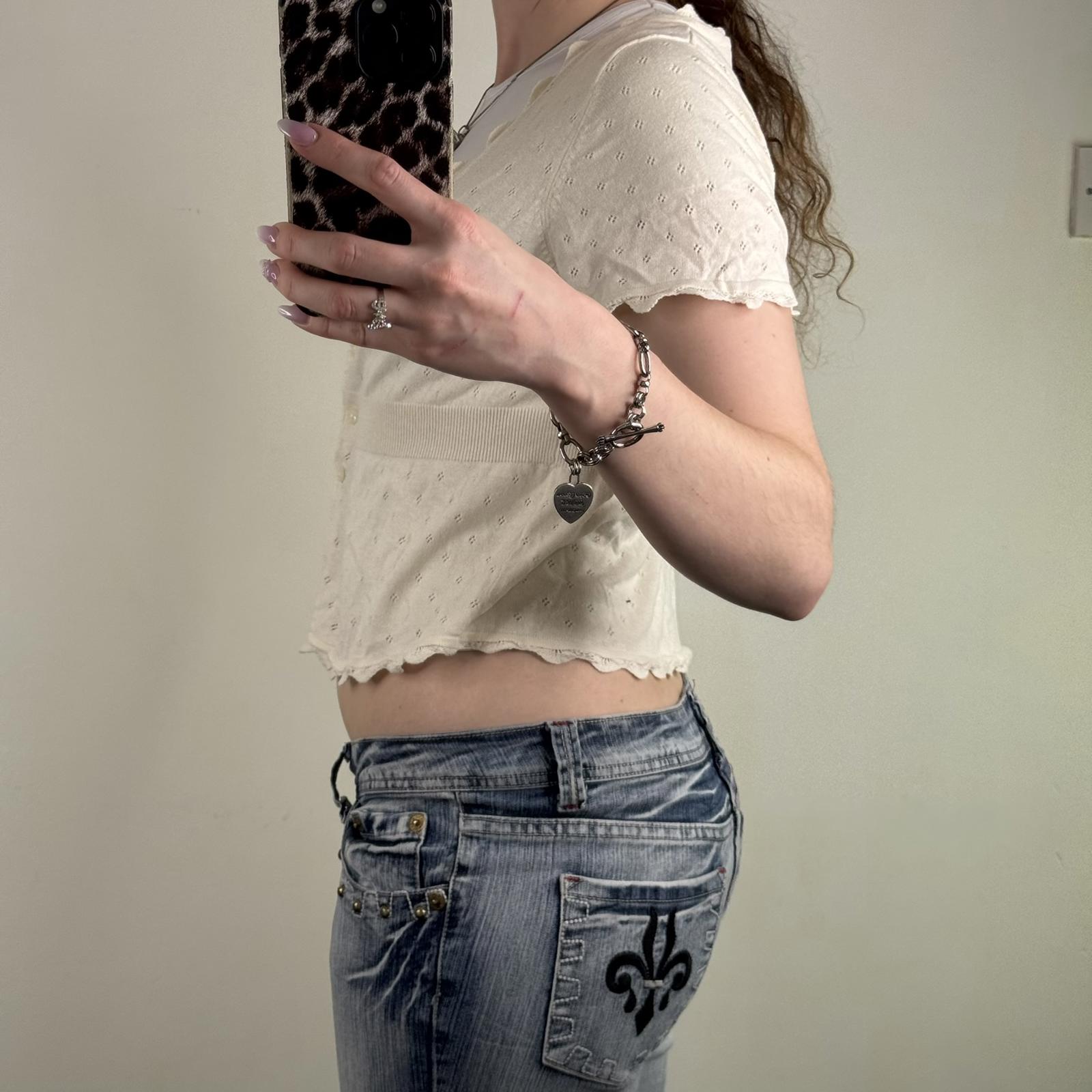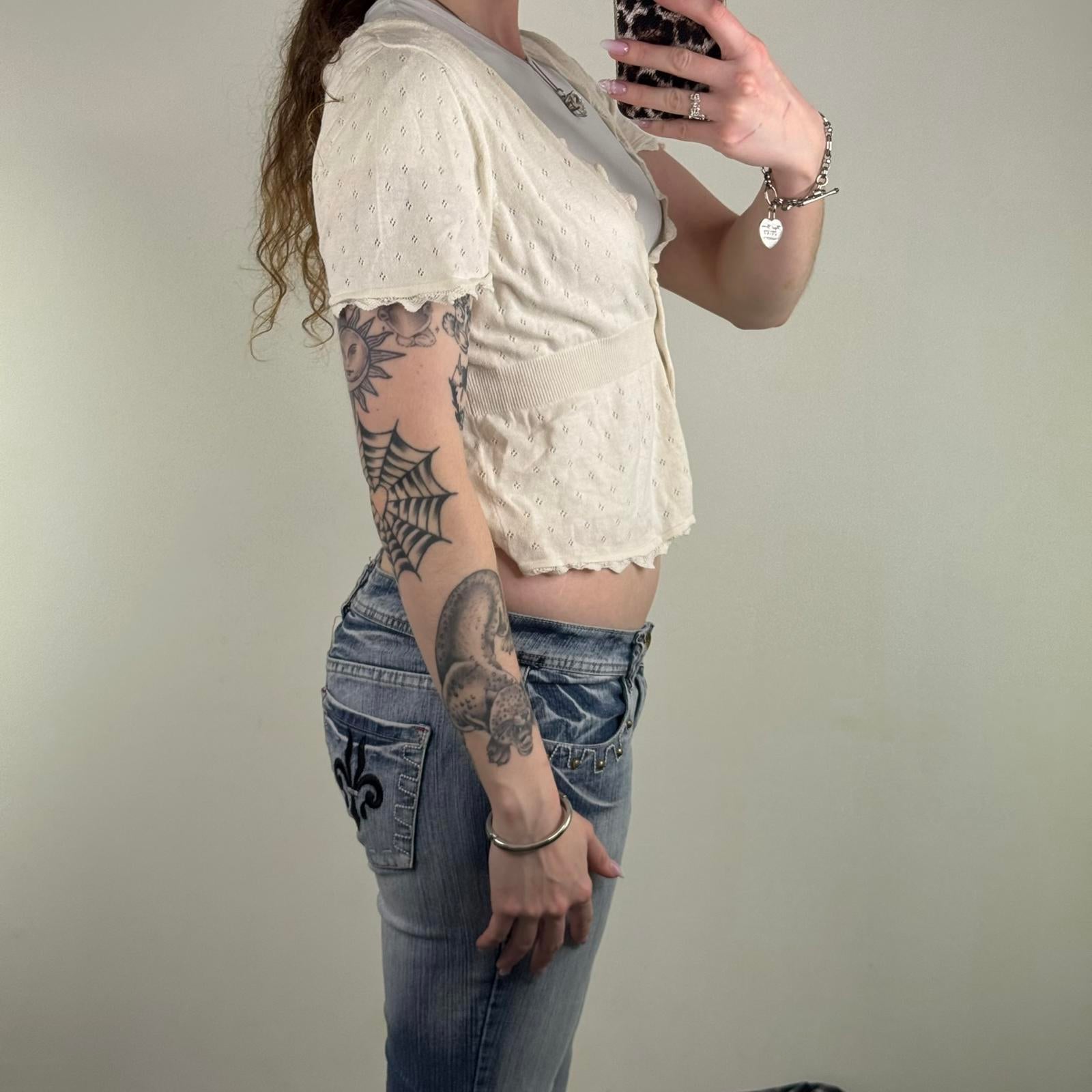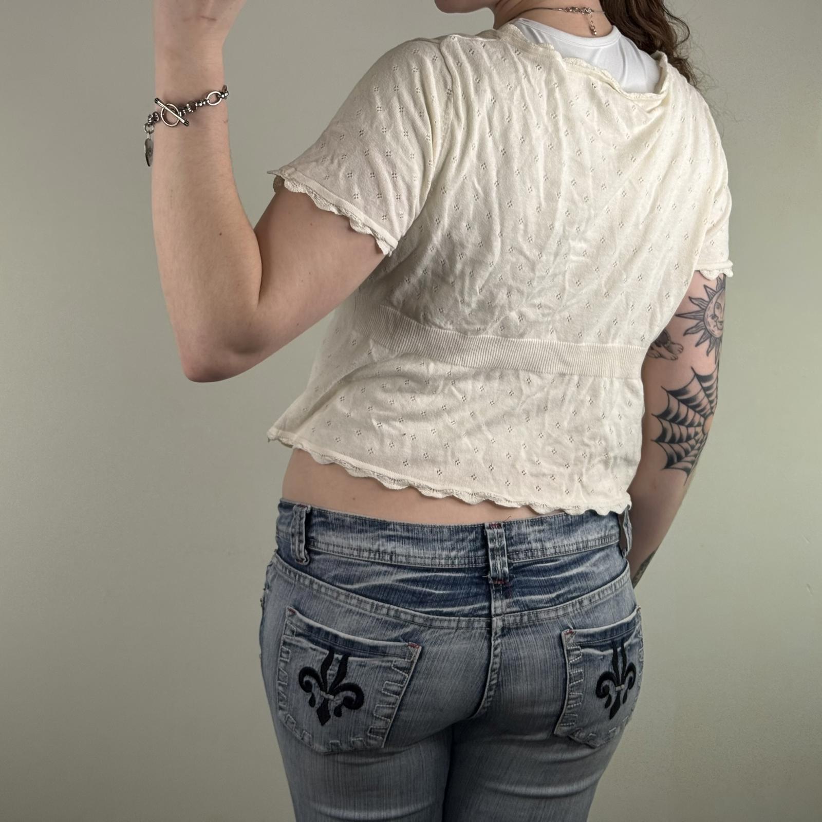 Y2K vintage fine knit short sleeve button up cardigan v neck scallop hem fitted