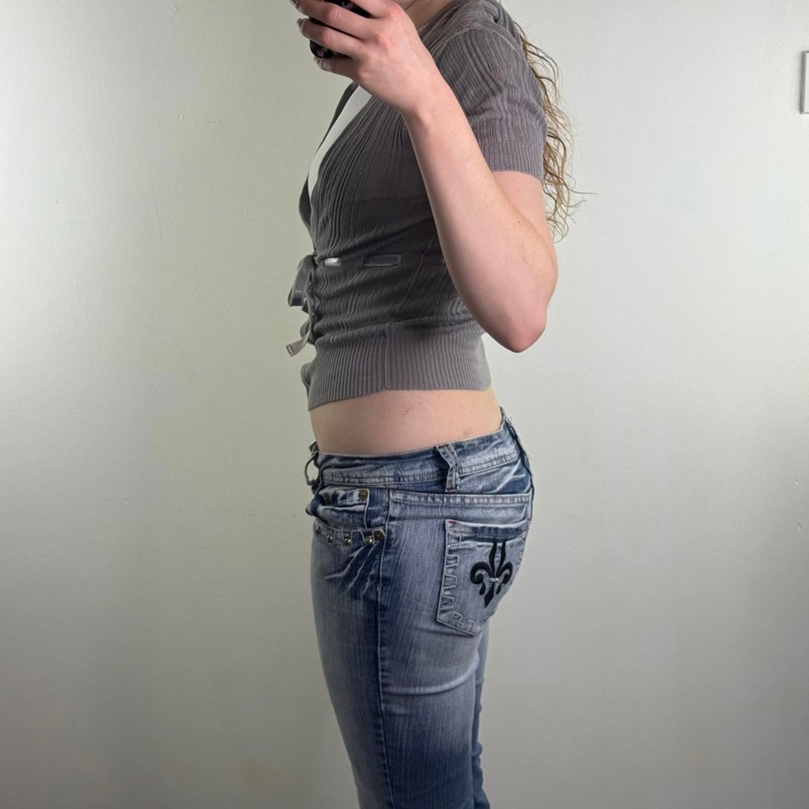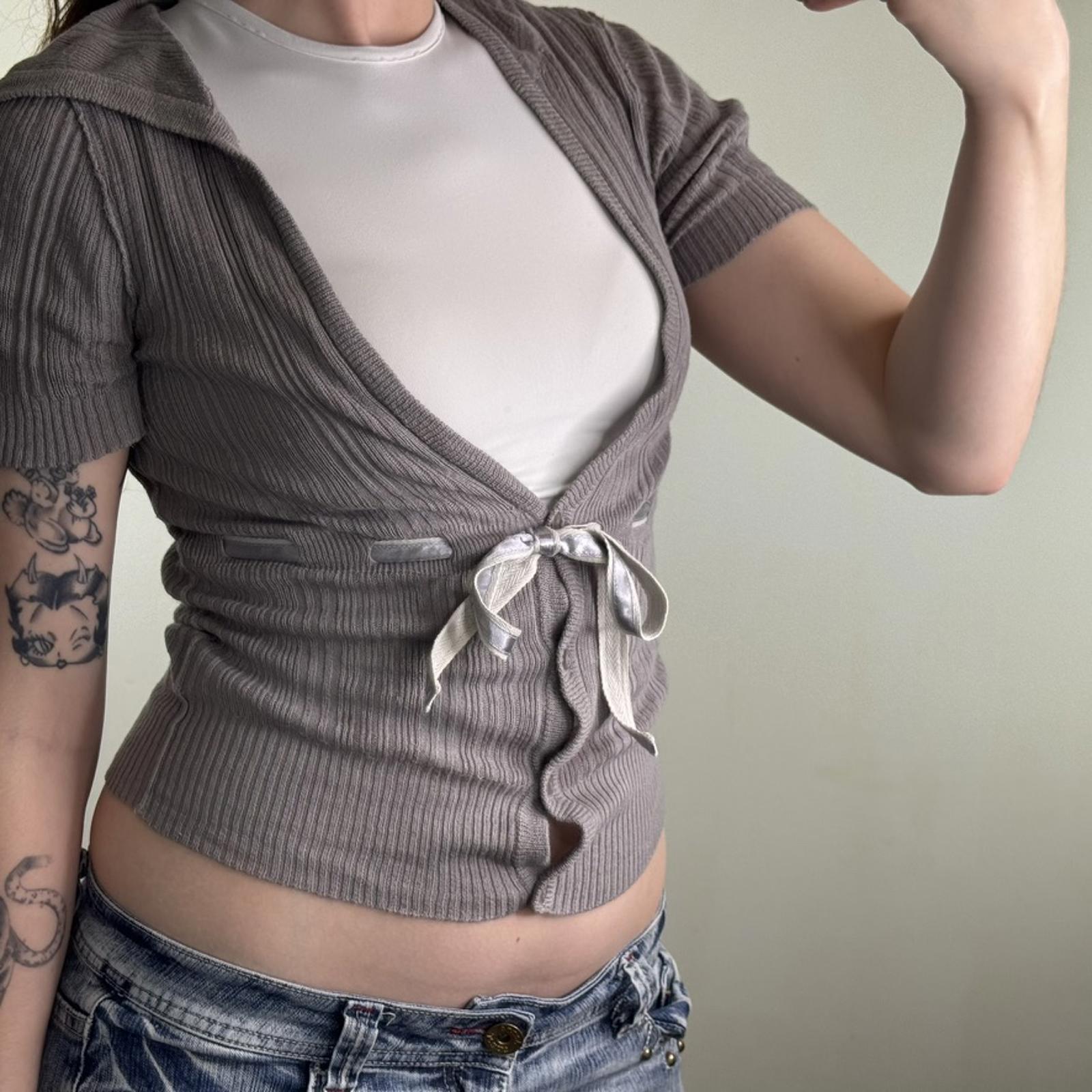 Y2K vintage fine knit short sleeve hoodie bow deep v neck low cut button up