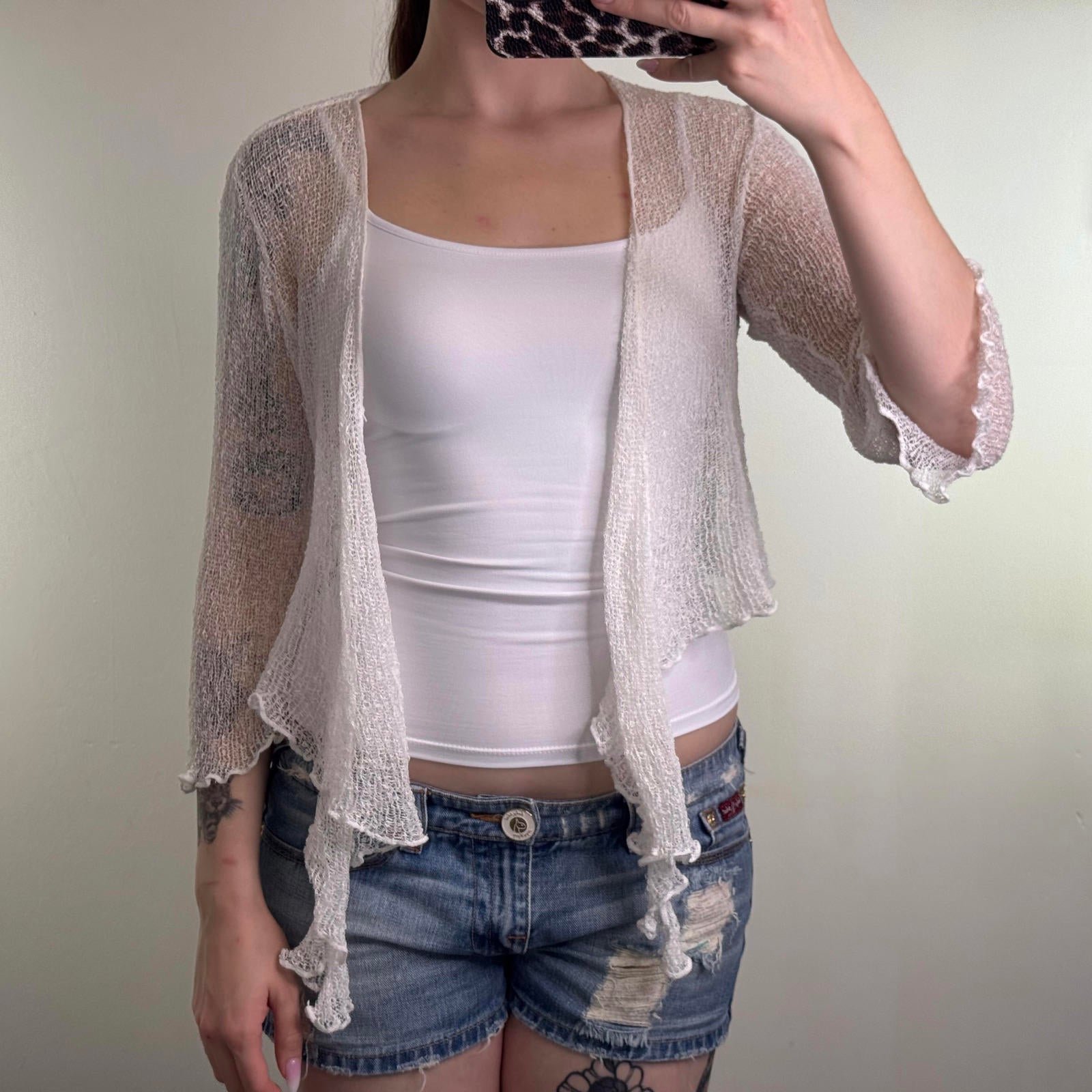 Y2K vintage fine knit shrug cardigan tie front bow 3/4 sleeve sheer cover up