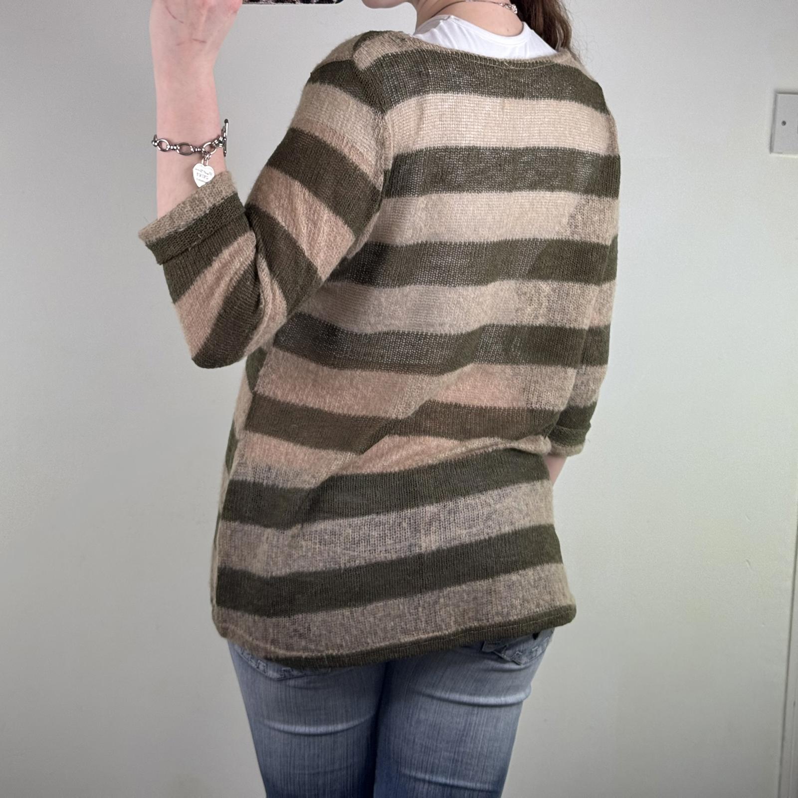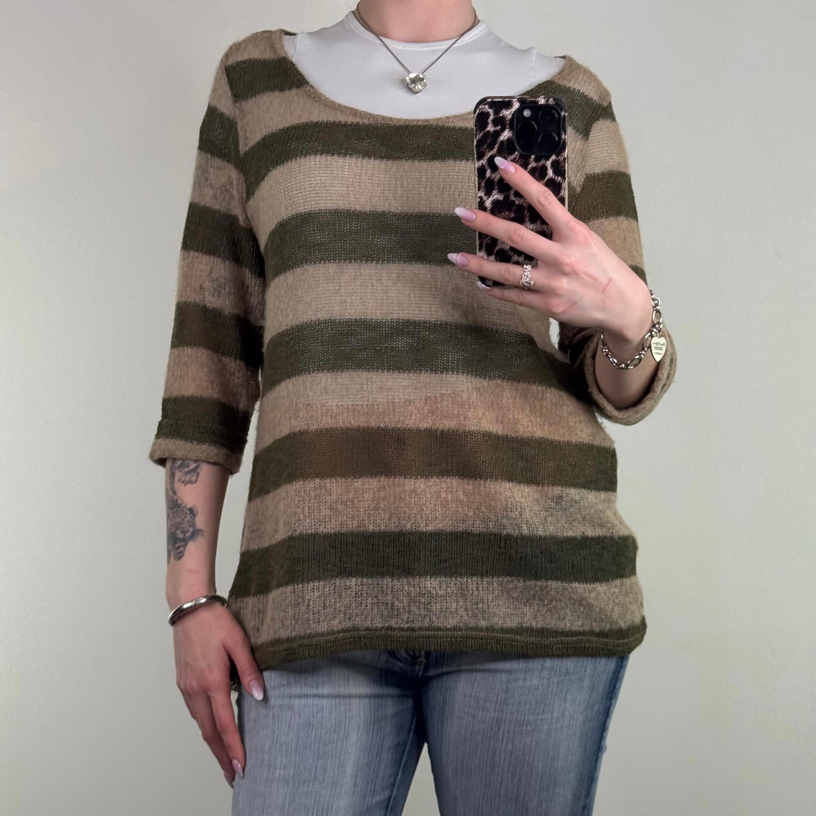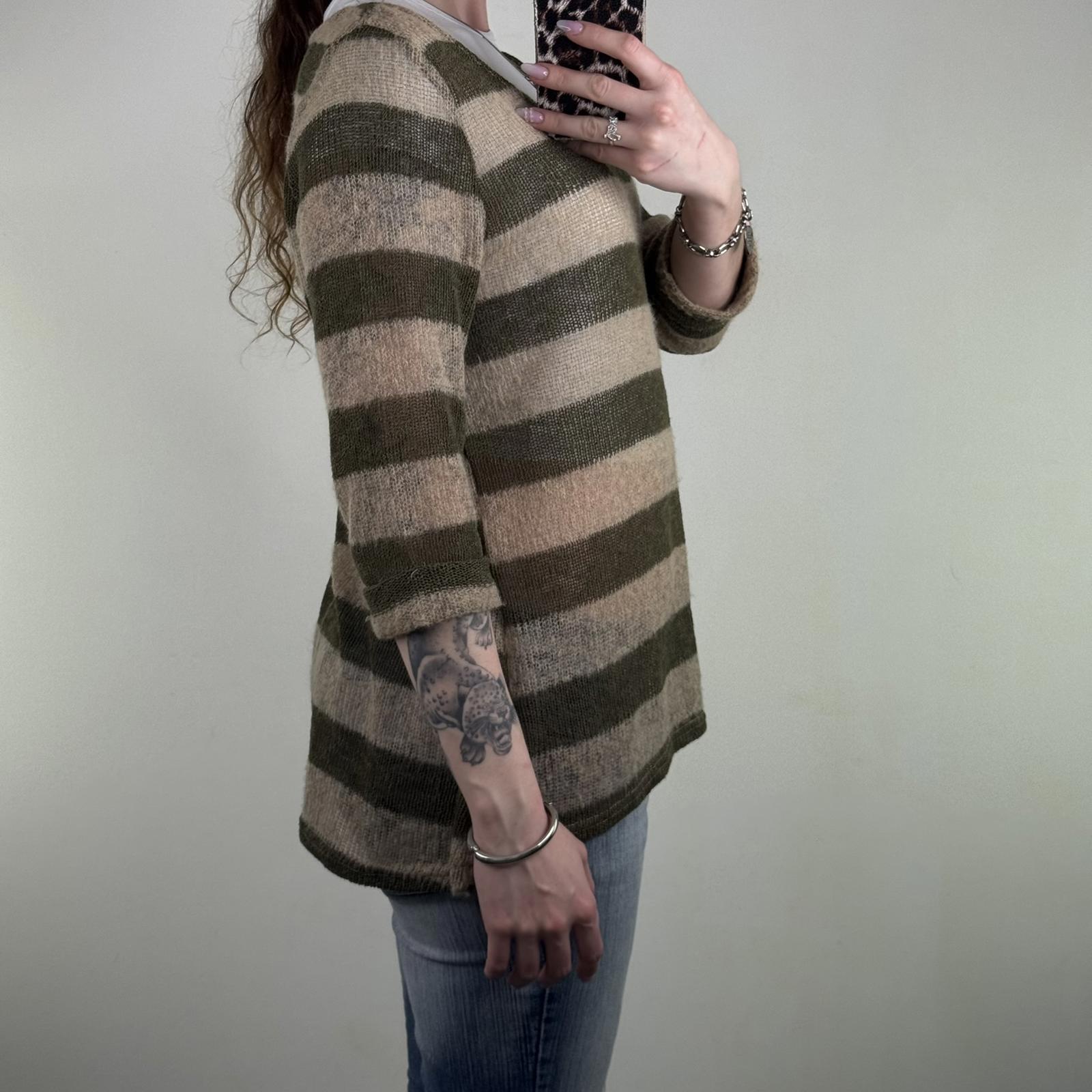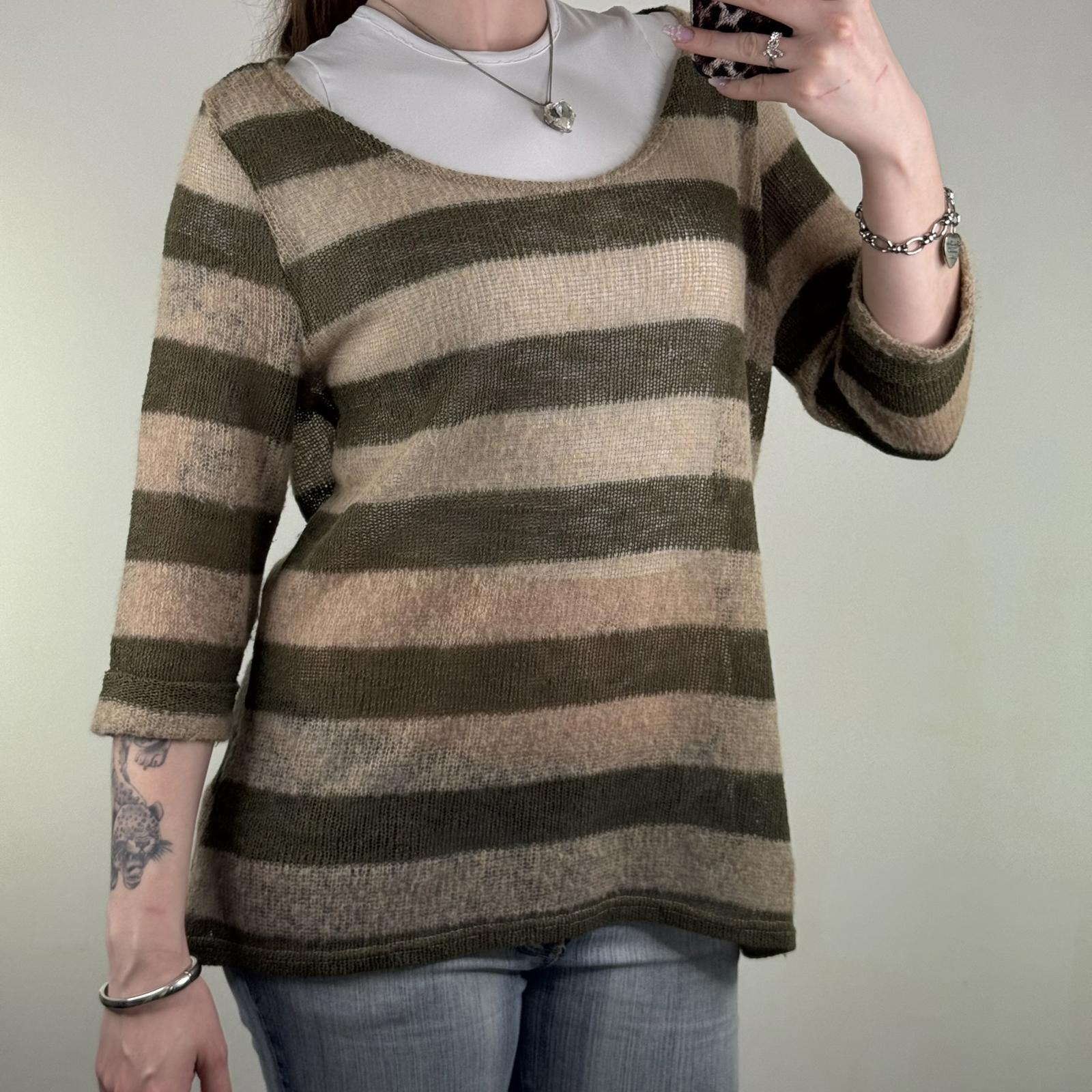 Y2K vintage fine knit stripe 3/4 sleeve top round neckline khaki sheer knitted