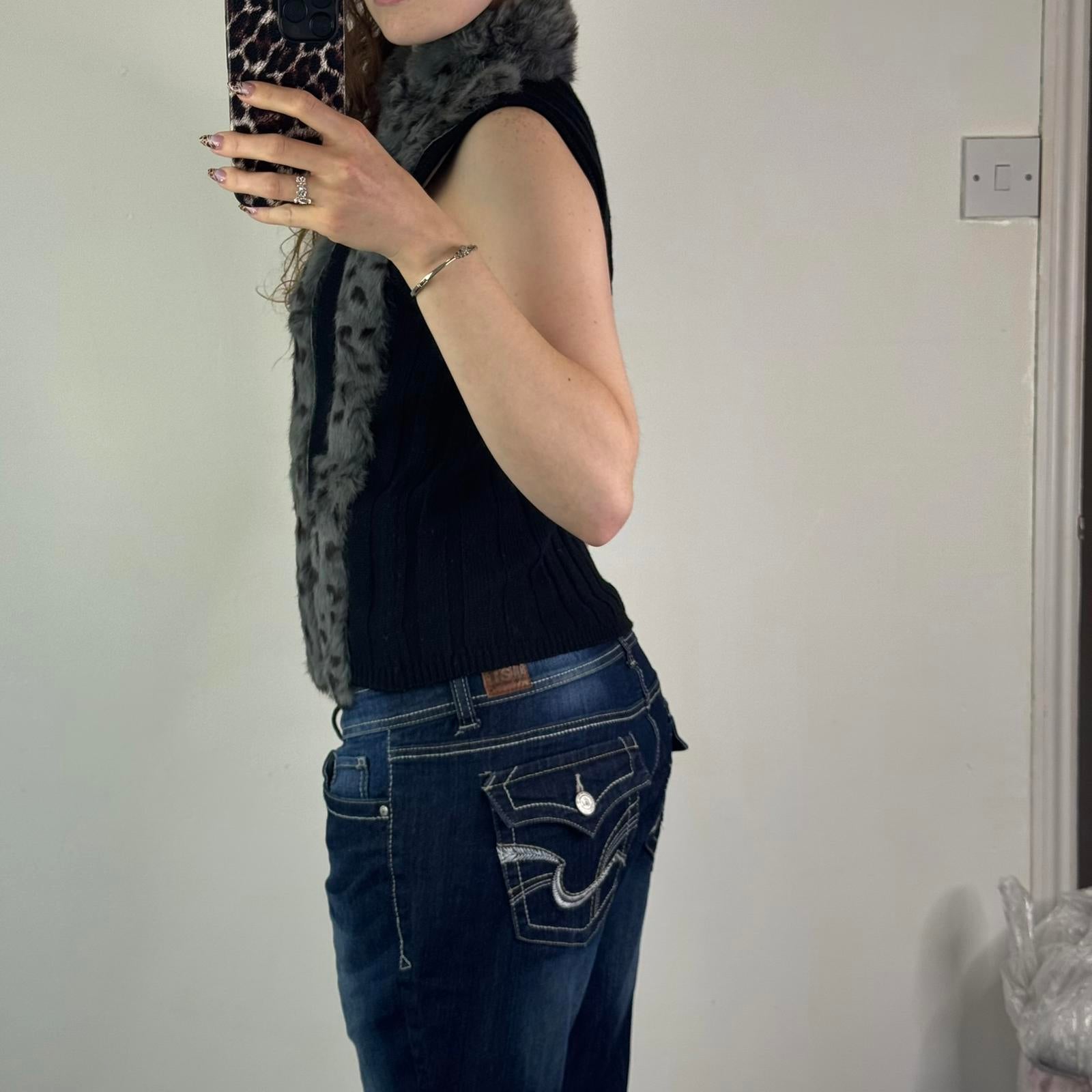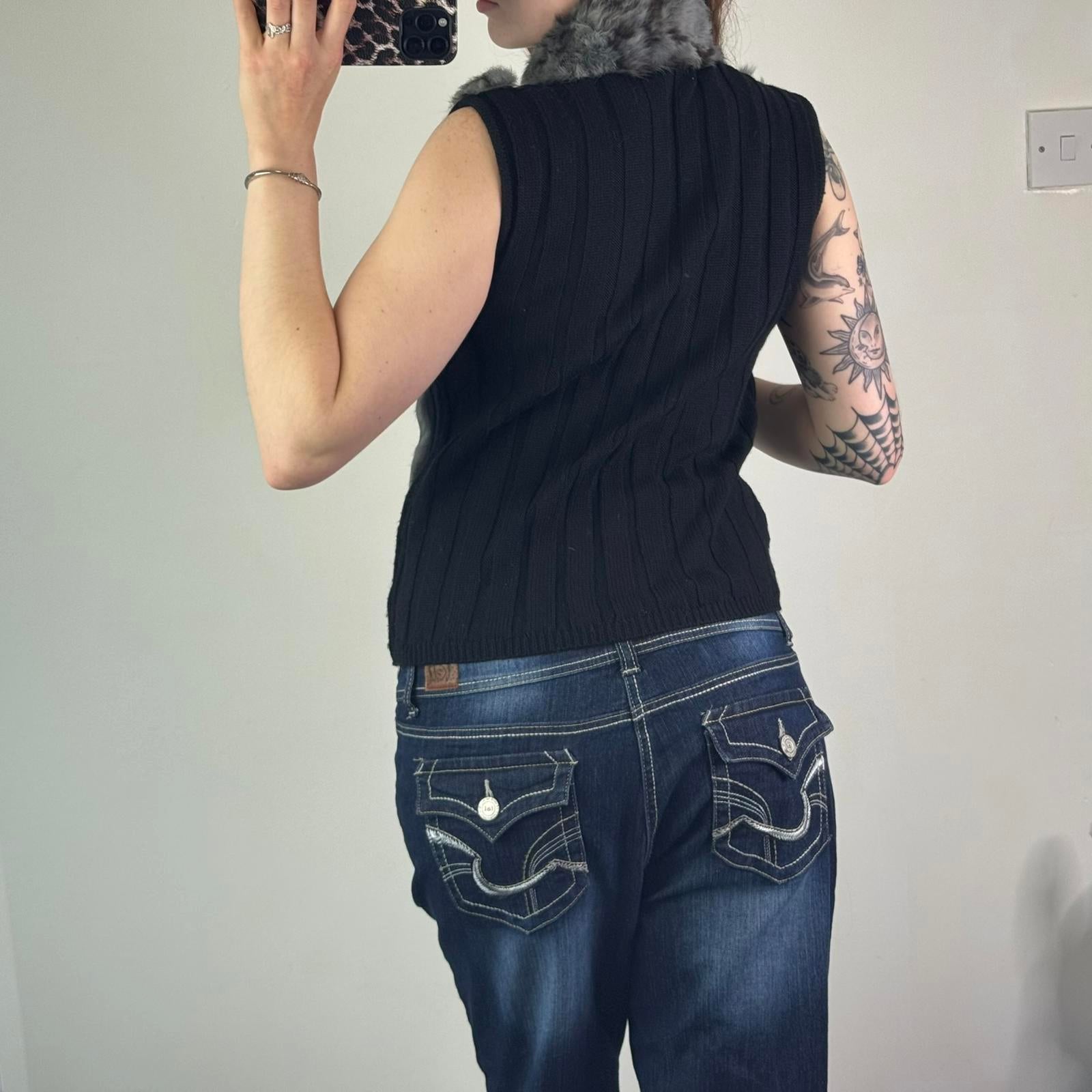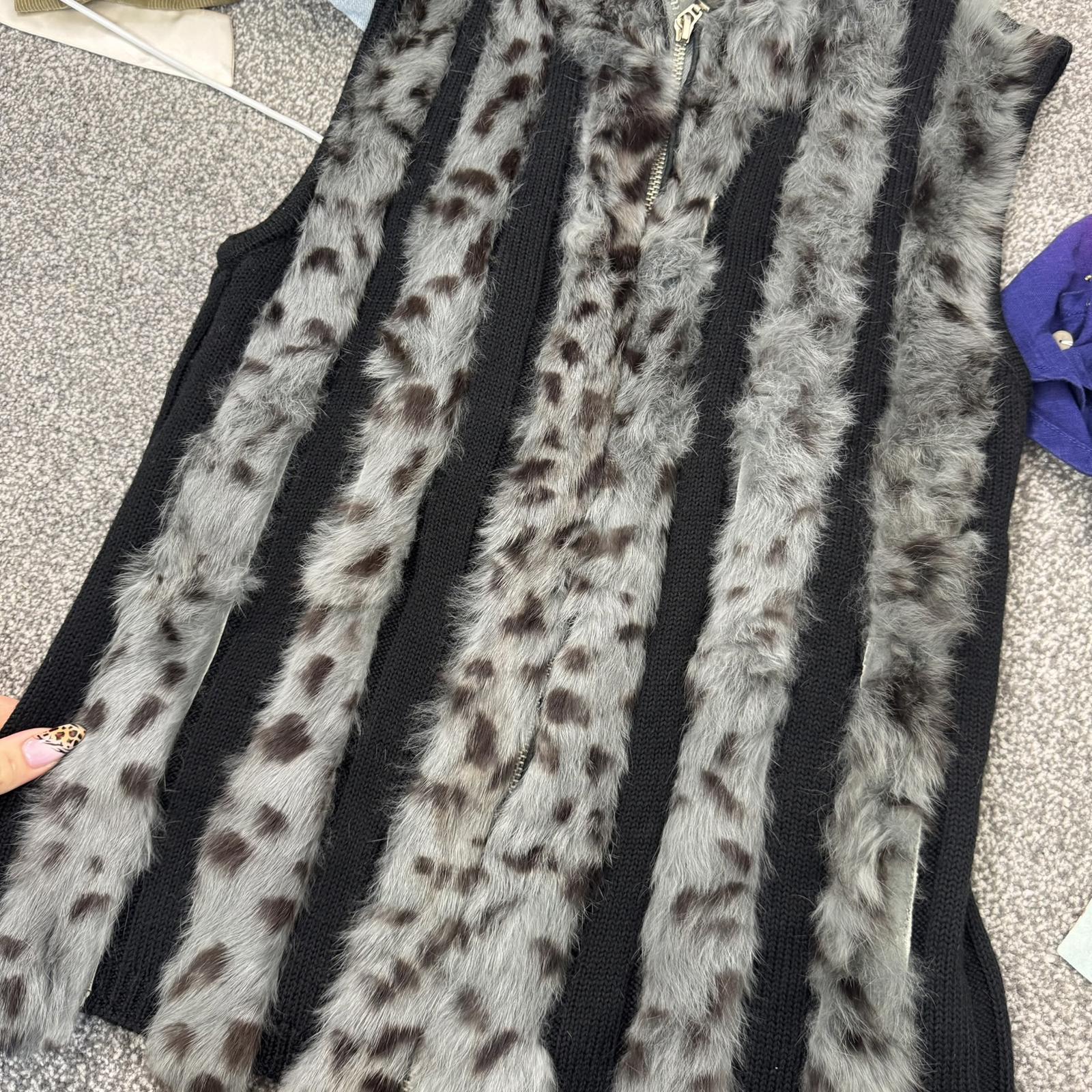 Y2K vintage genuine fur stripe knit sleeveless jacket zip up gilet polka dot