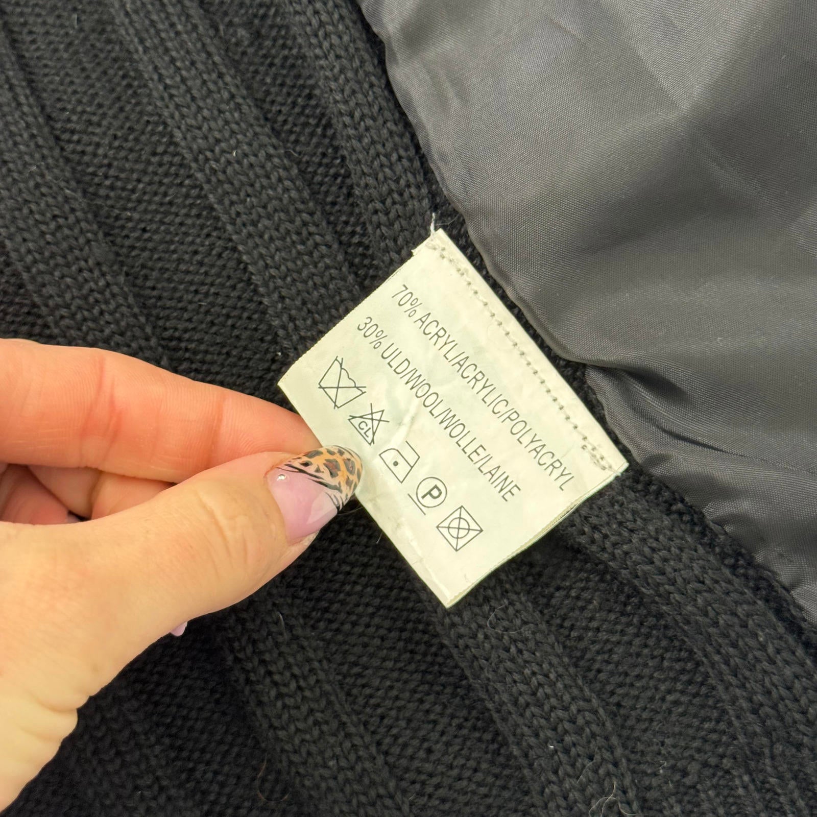 Black chunky knit, grey and brown spot fur stripes, high neck