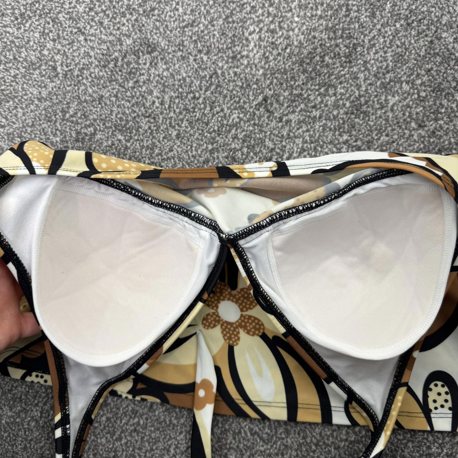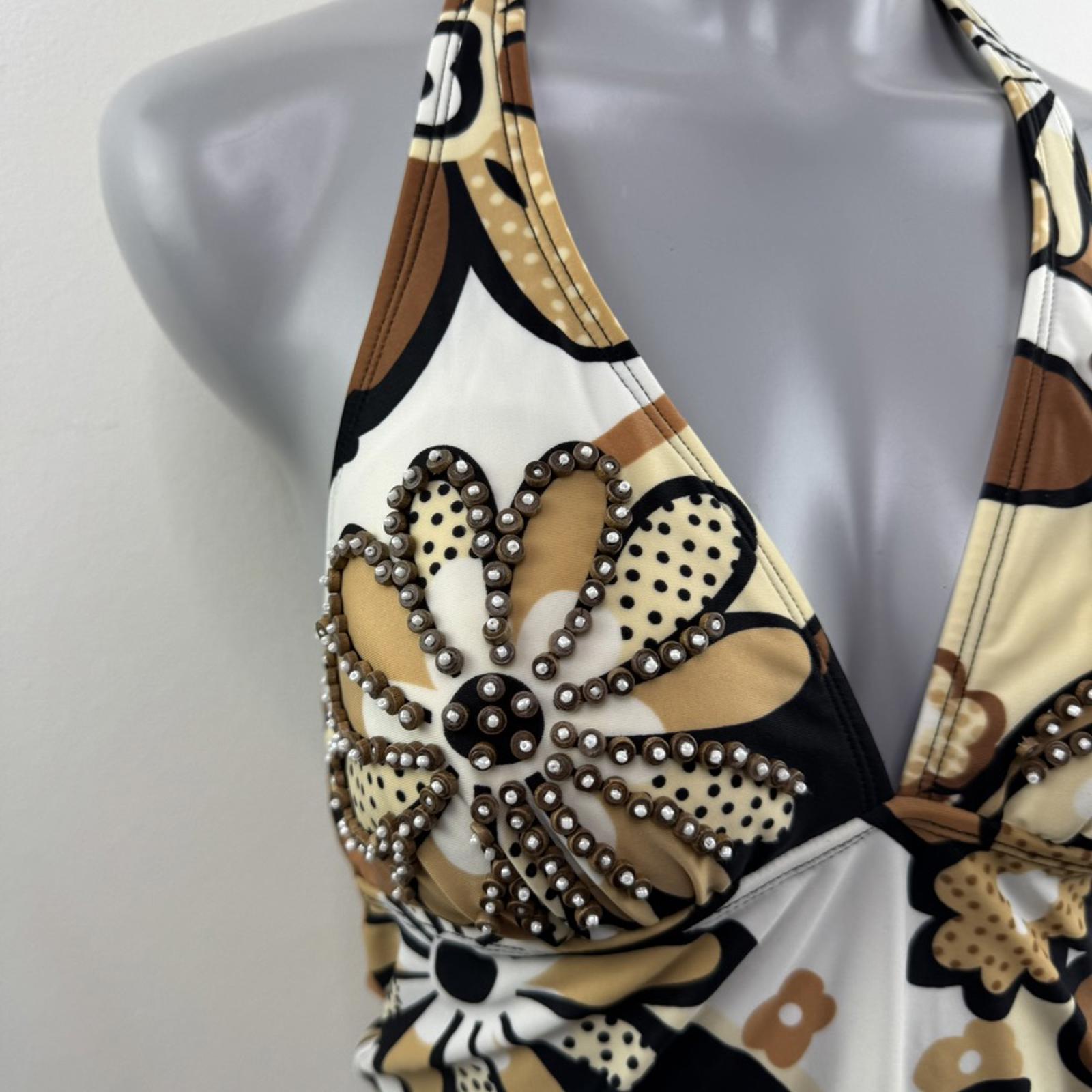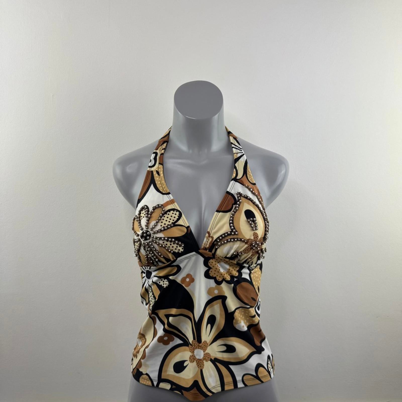 Y2K vintage halter neck swimwear top v neck padded bust beaded floral pattern