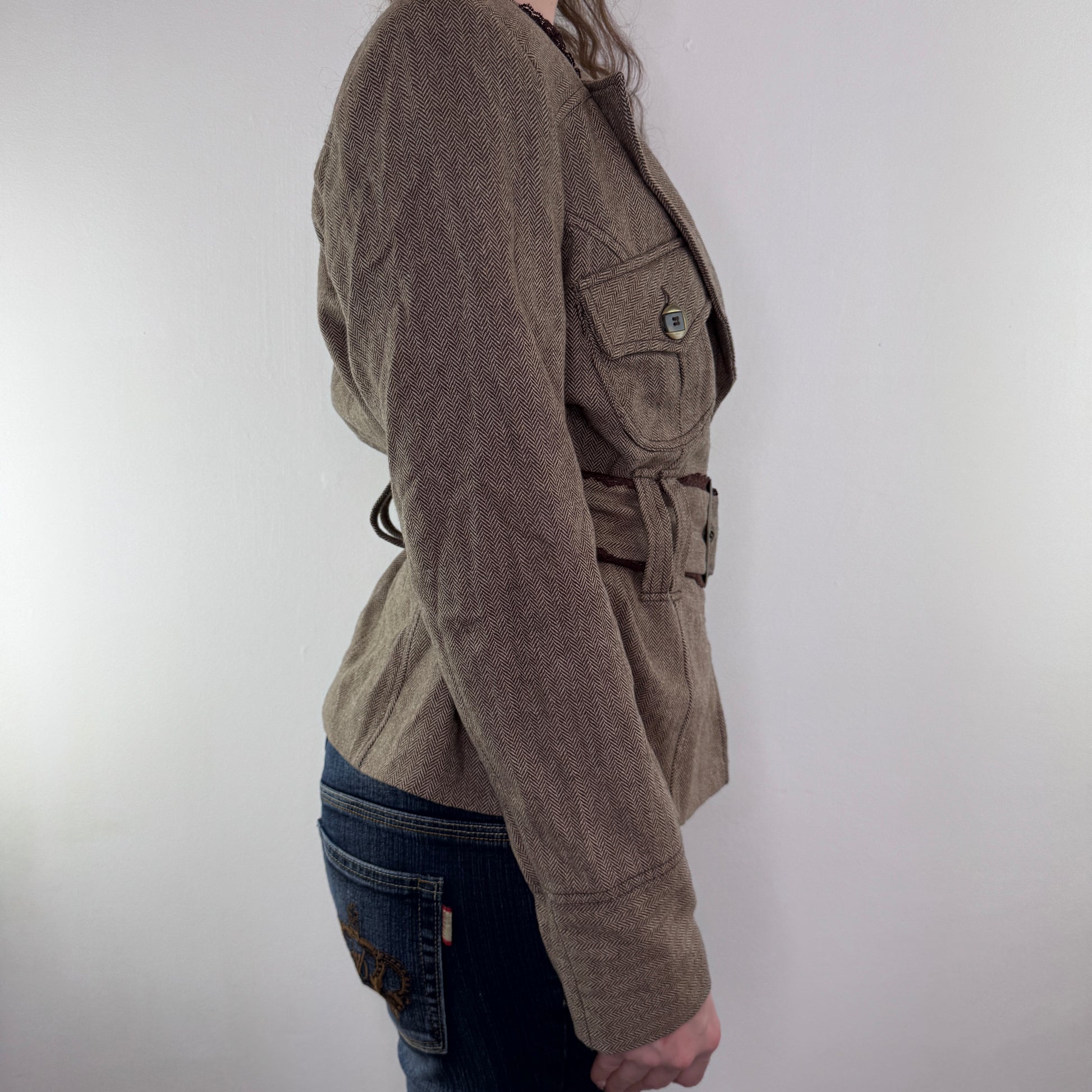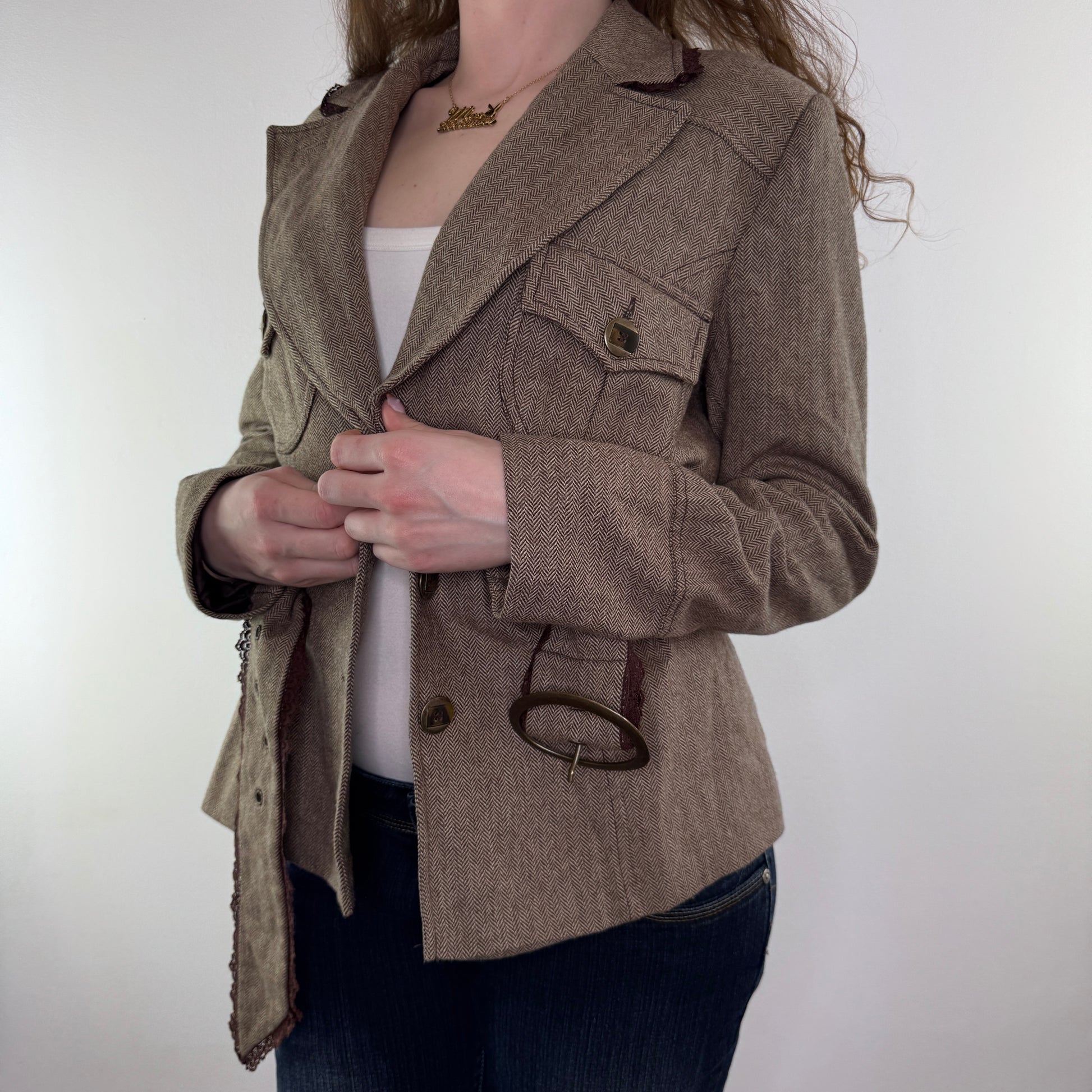 Y2K vintage herringbone lace trim tweed jacket with belt
