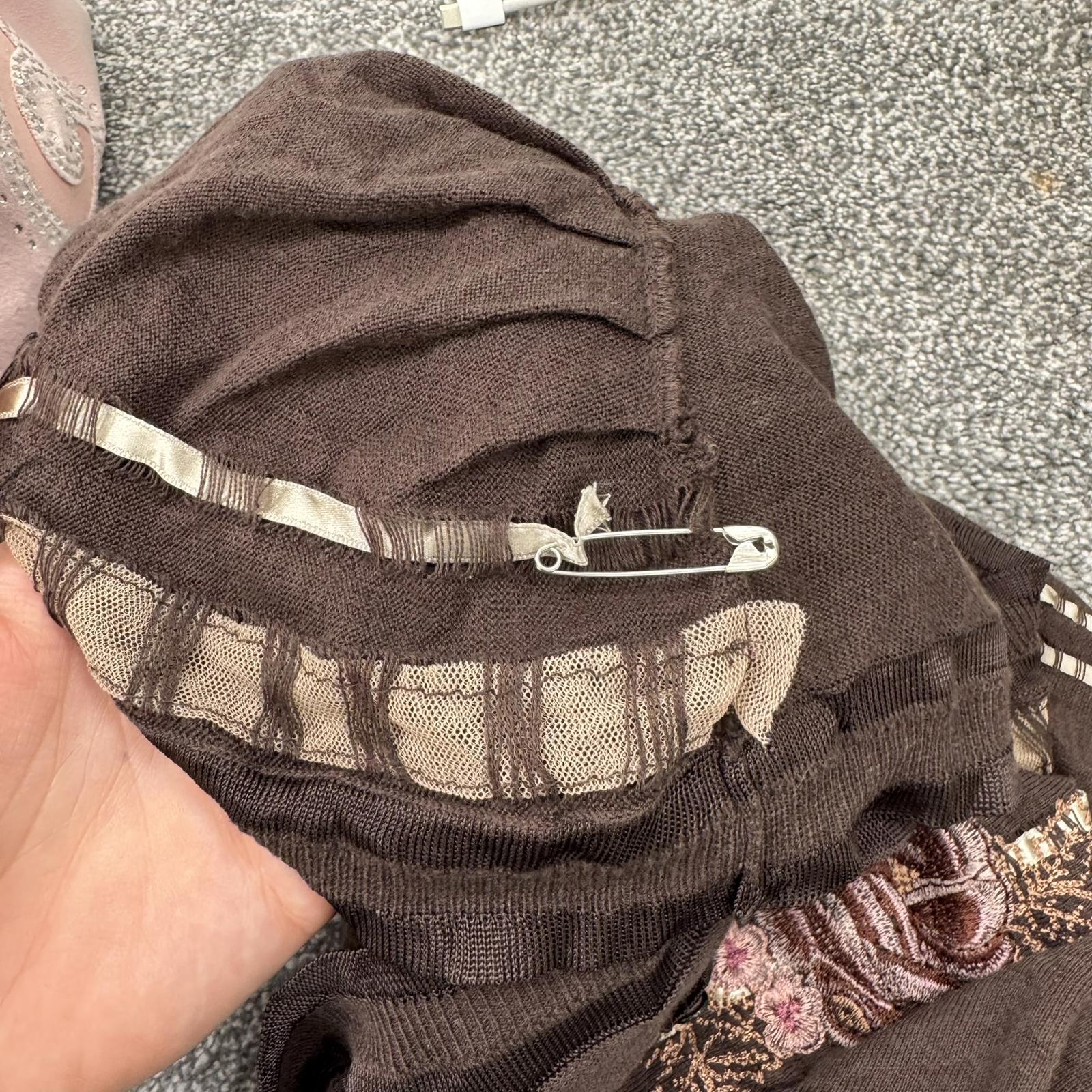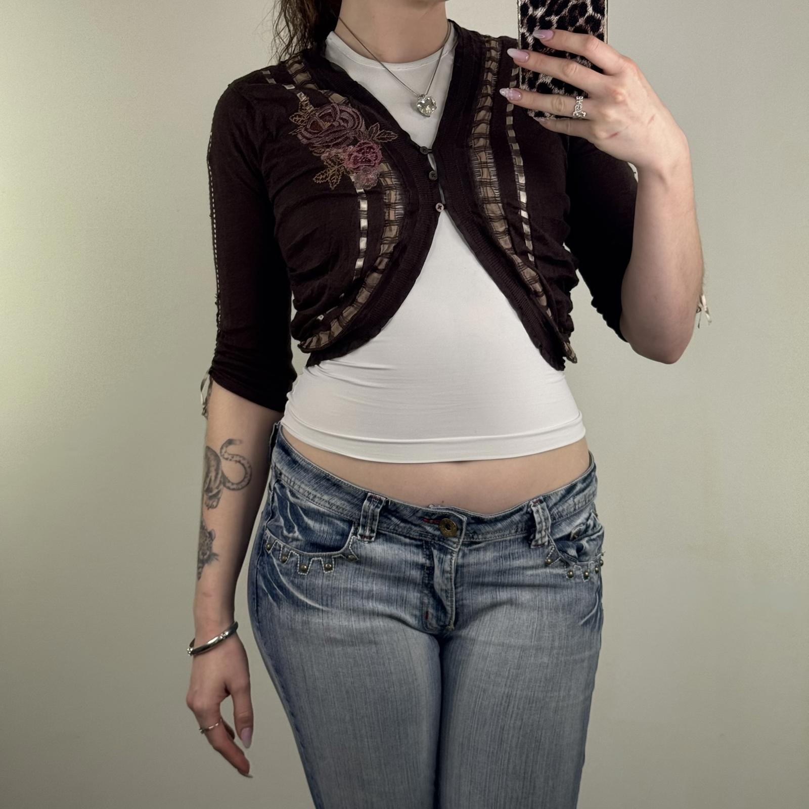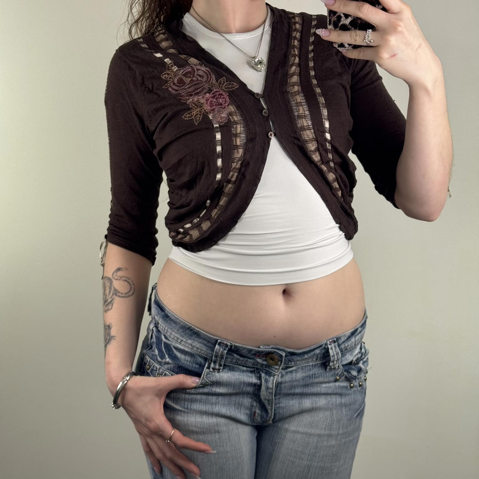 Y2K vintage Karen Millen cropped cardigan 3/4 sleeve ribbon floral embroidered