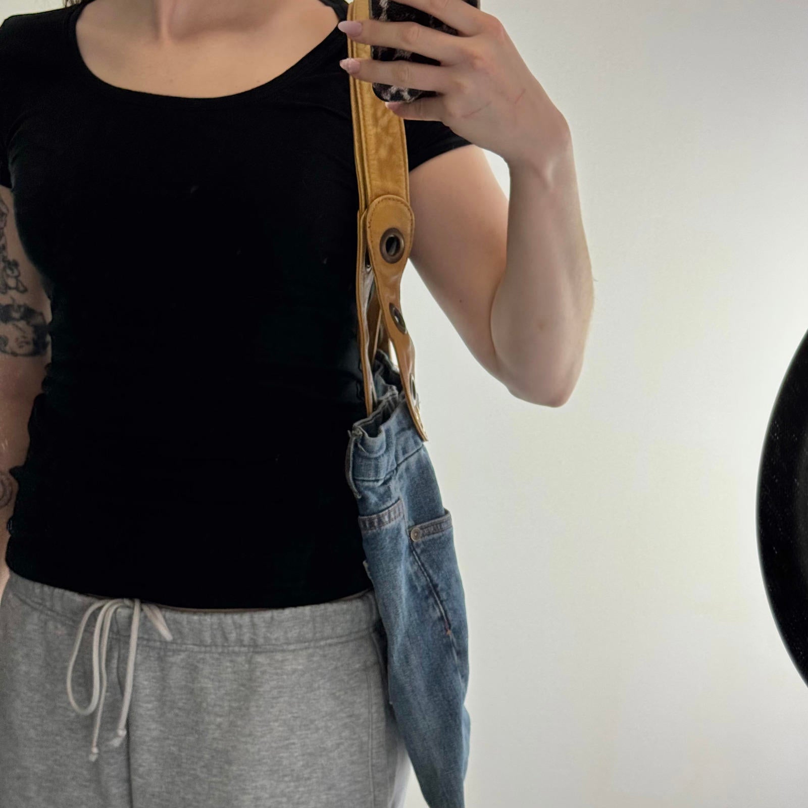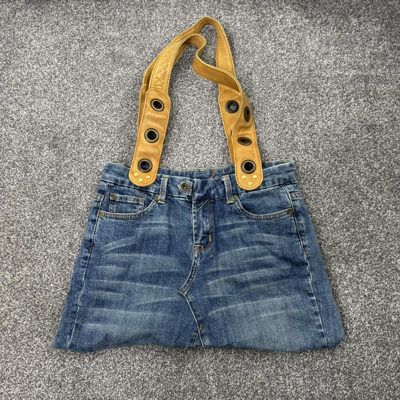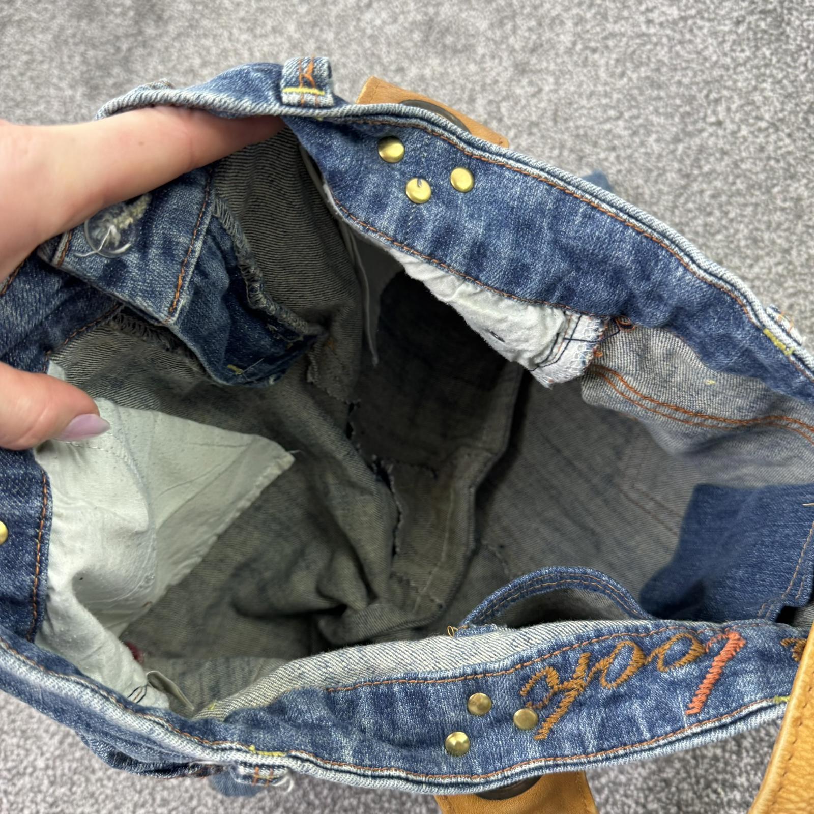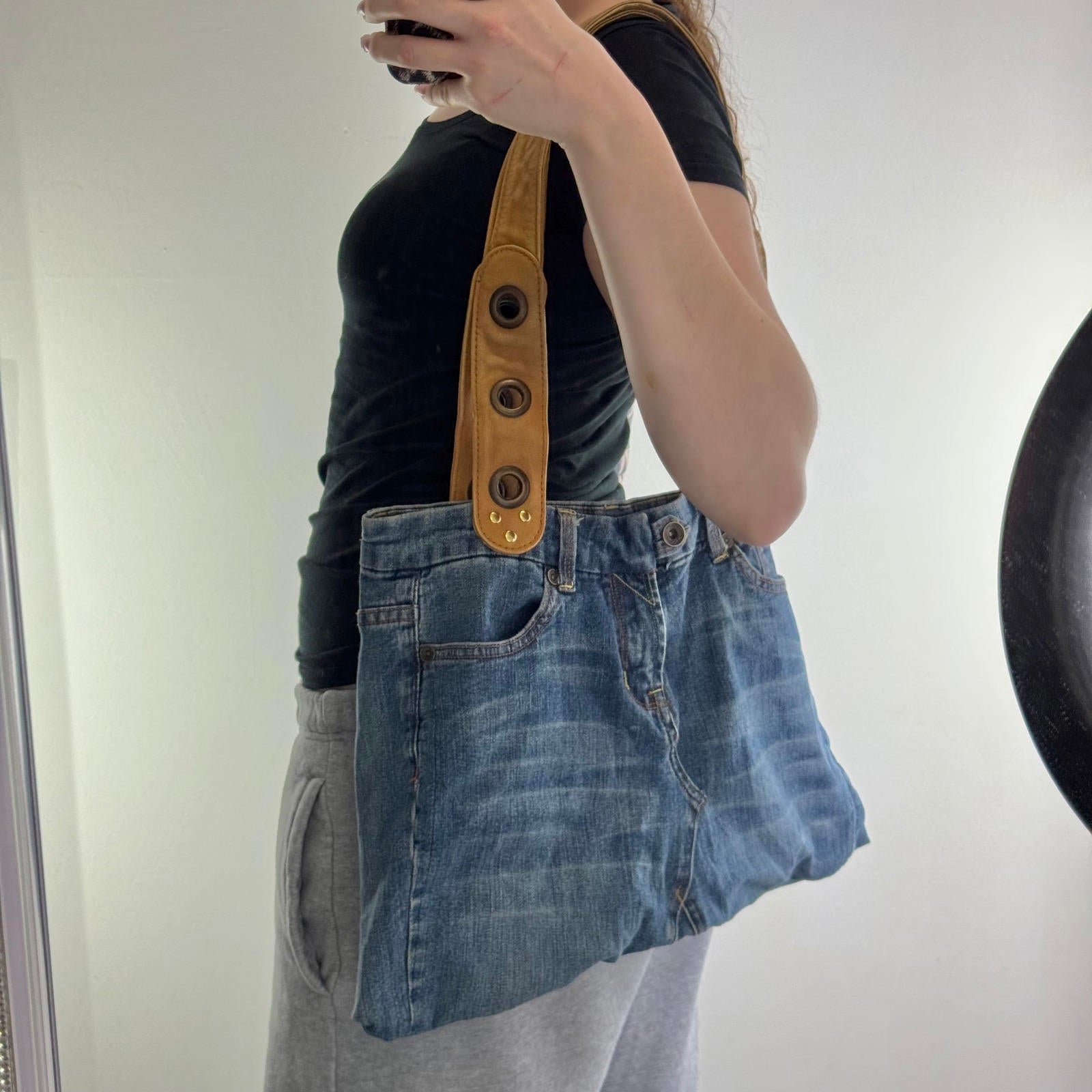 Y2K vintage large reworked denim shoulder bag leather straps grommet blue brown