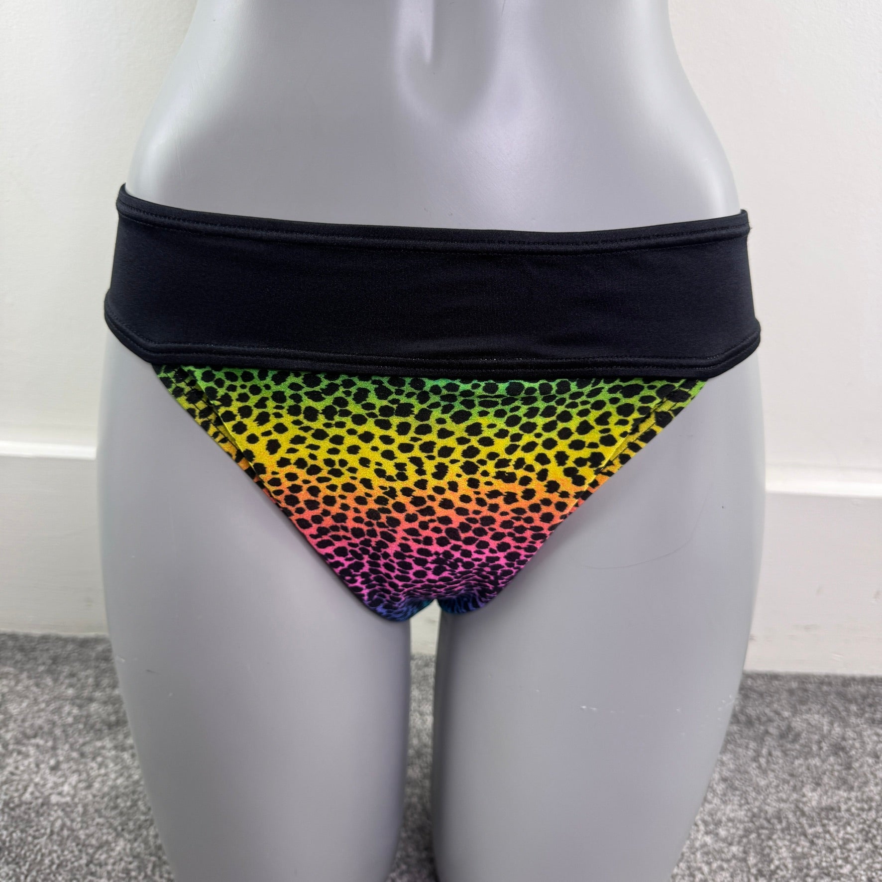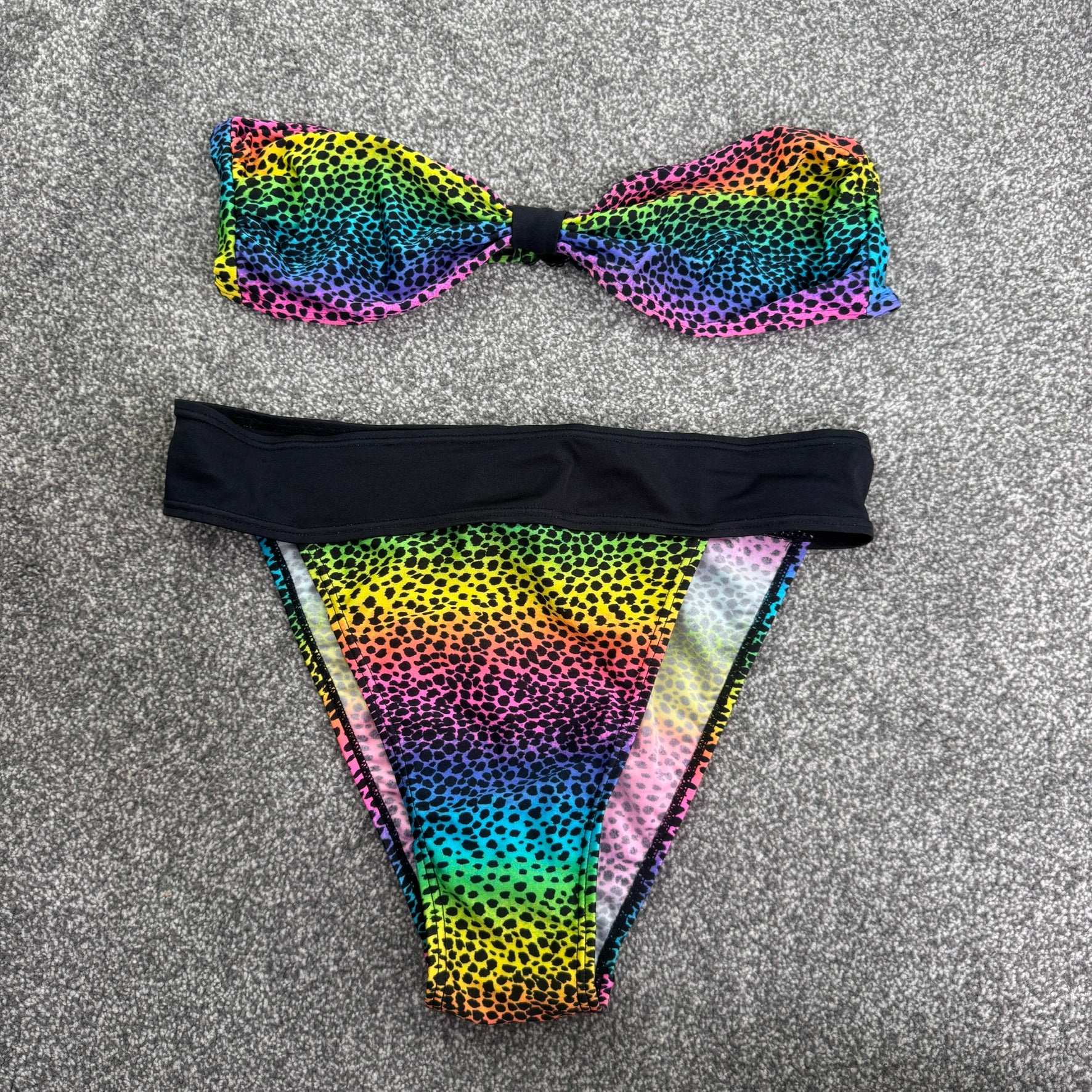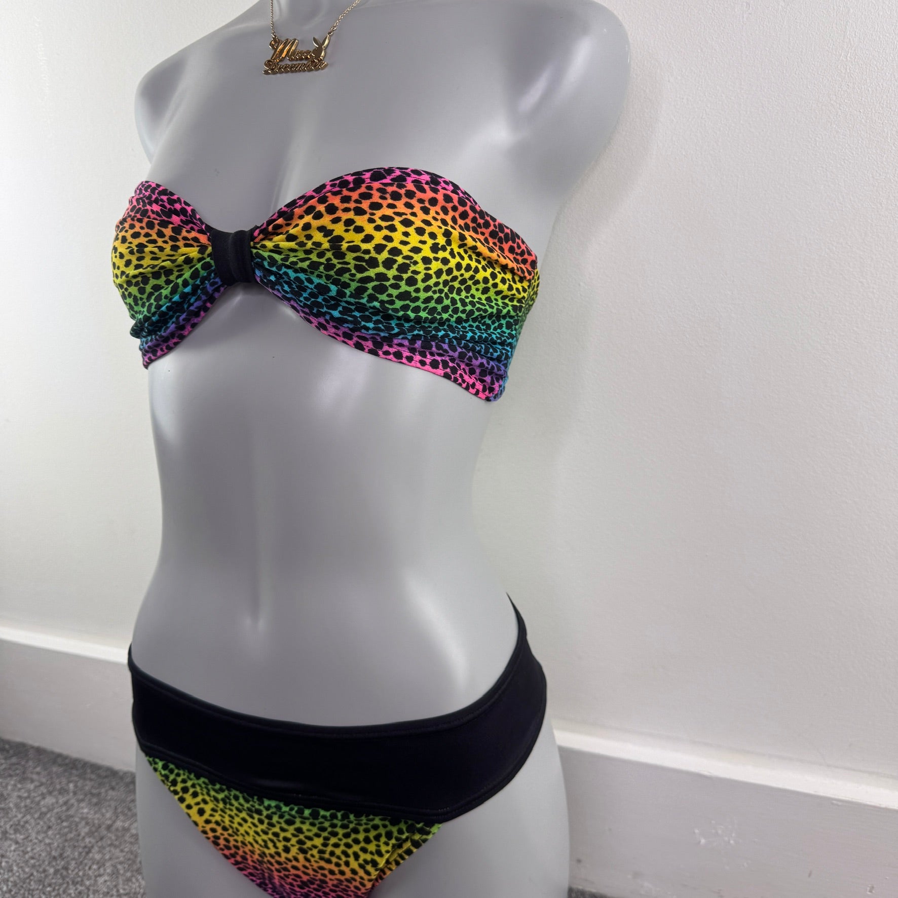 Strapless, no padding, high rise bottoms, ruched bust, ombre multi colour, thick waistband
