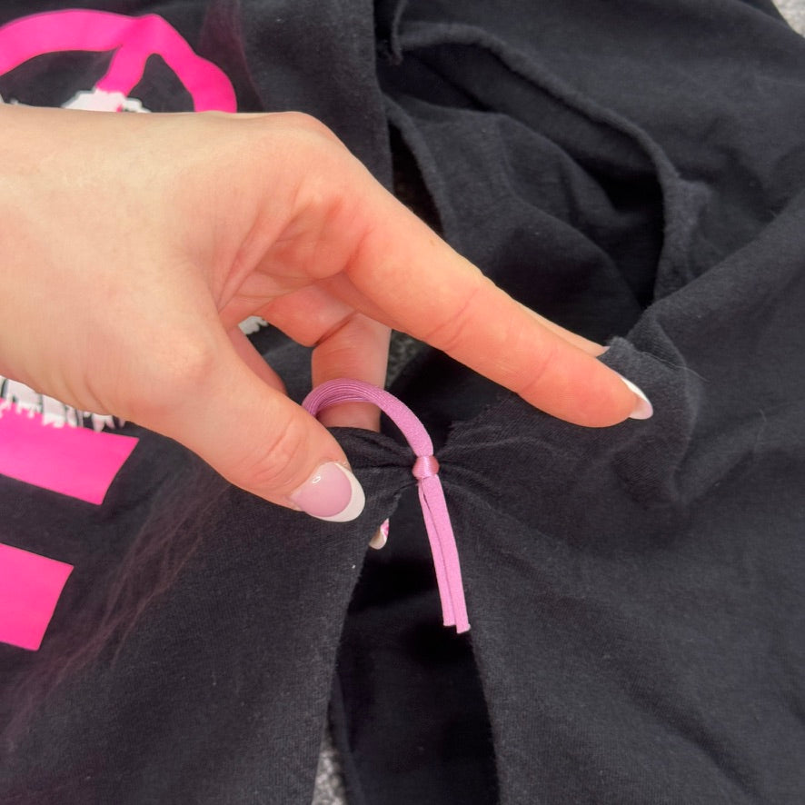 Reworked, cut out sides tied with pink knots, neon pink love text with kiss and peace sign, high neck, baggy slouchy tank
