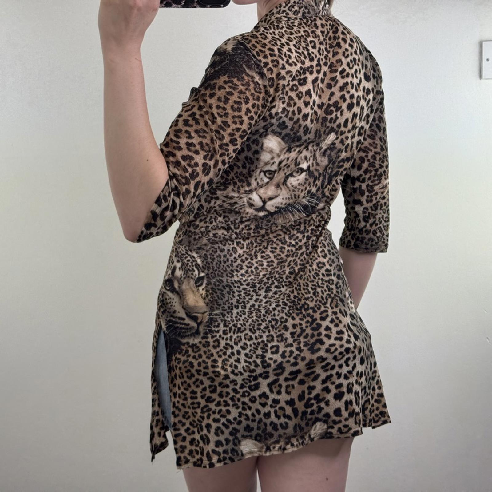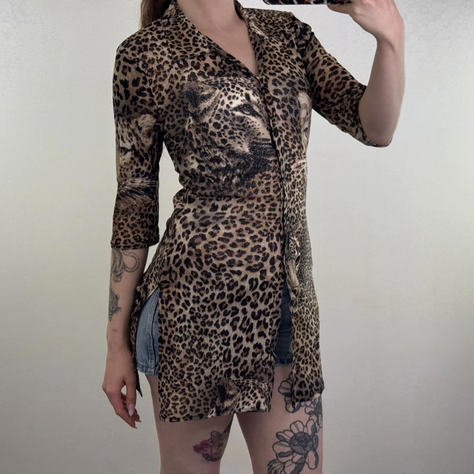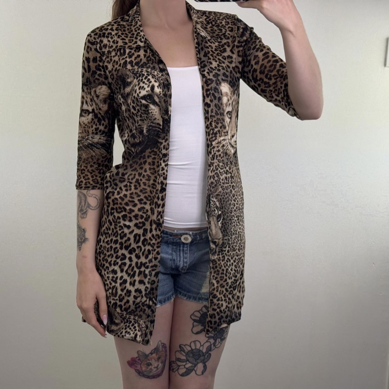 Y2K vintage mesh leopard print button up half sleeve cardigan long length v neck