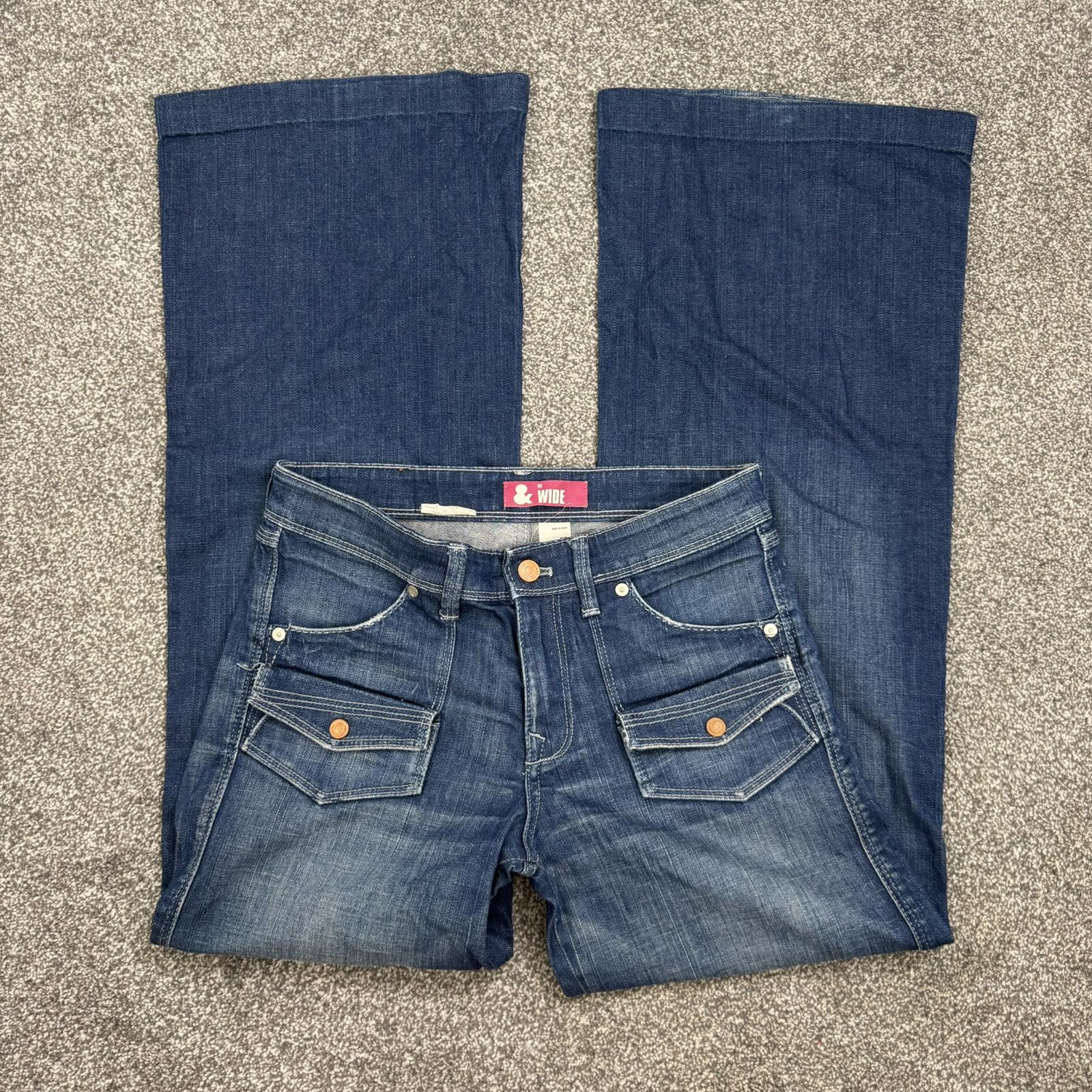 Y2K vintage mid rise wide leg denim jeans stretchy mid blue wash cargo baggy