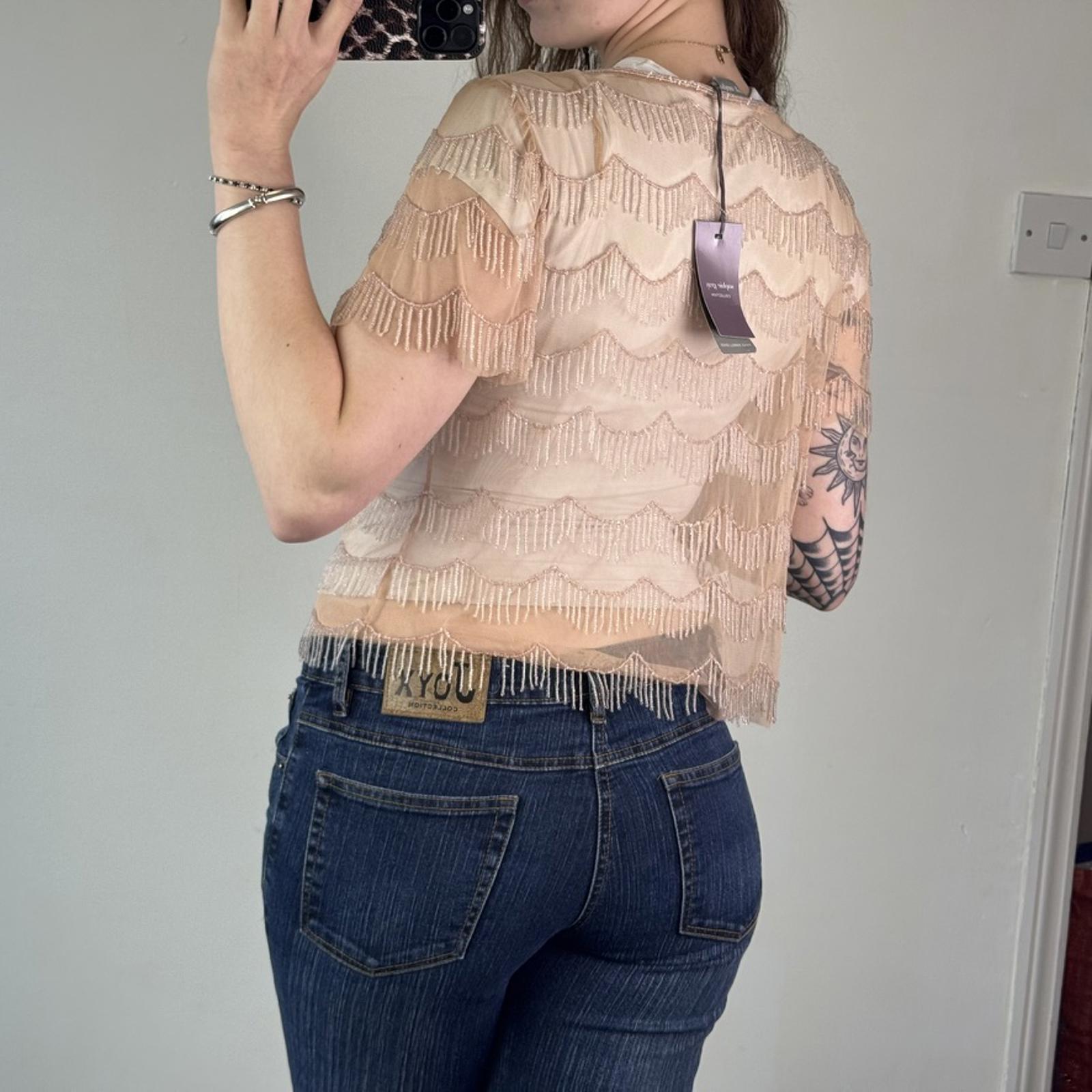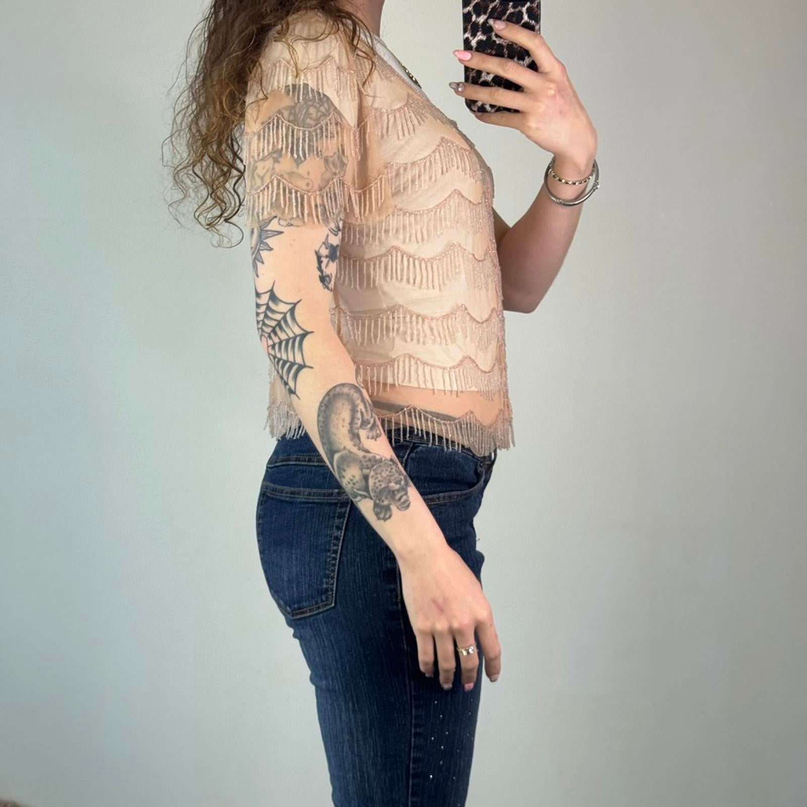 Round scoop neck, peach pale dusty pink colour, scallop pattern embellished beads, short length, sheer, cute for festivals/ summer/ layering, boho