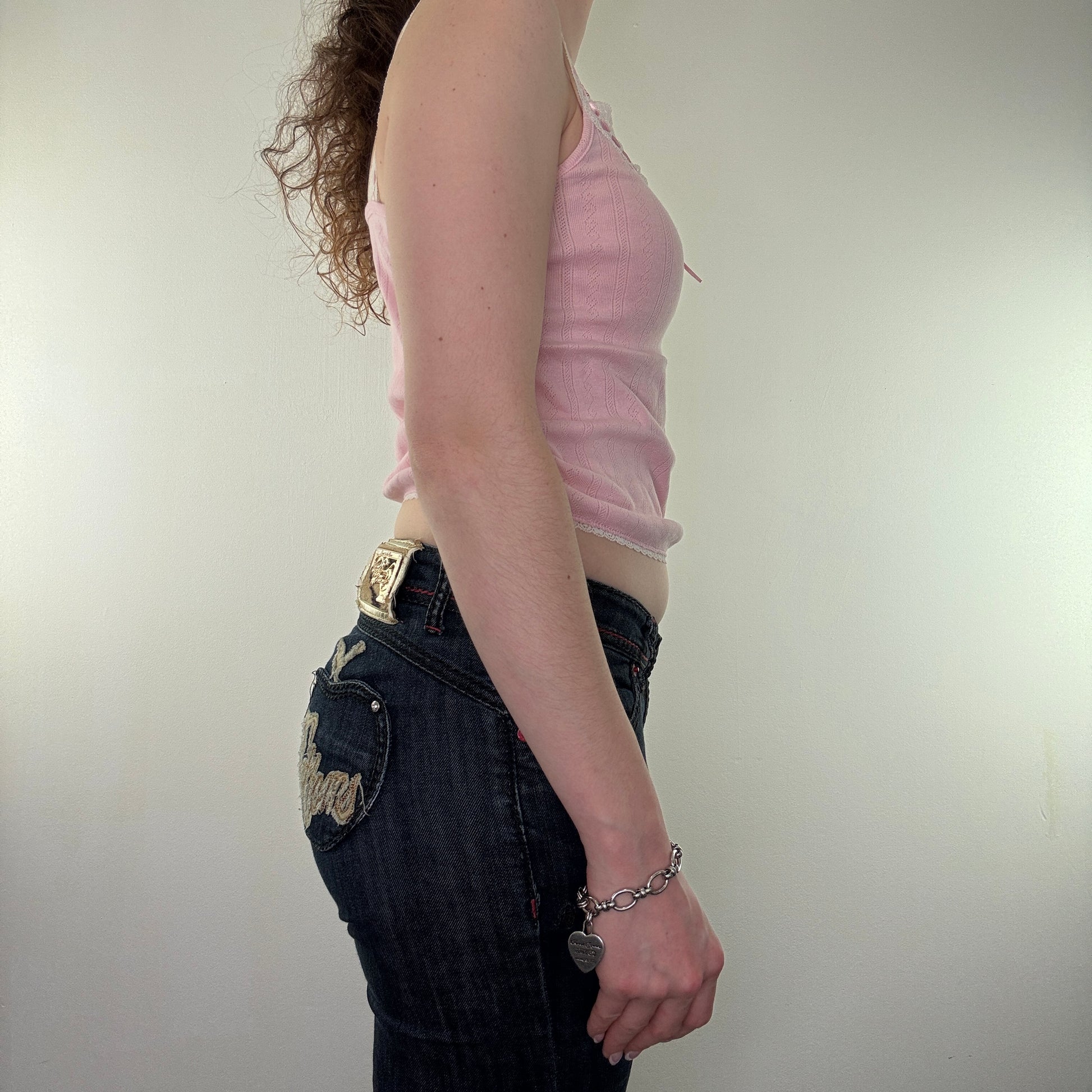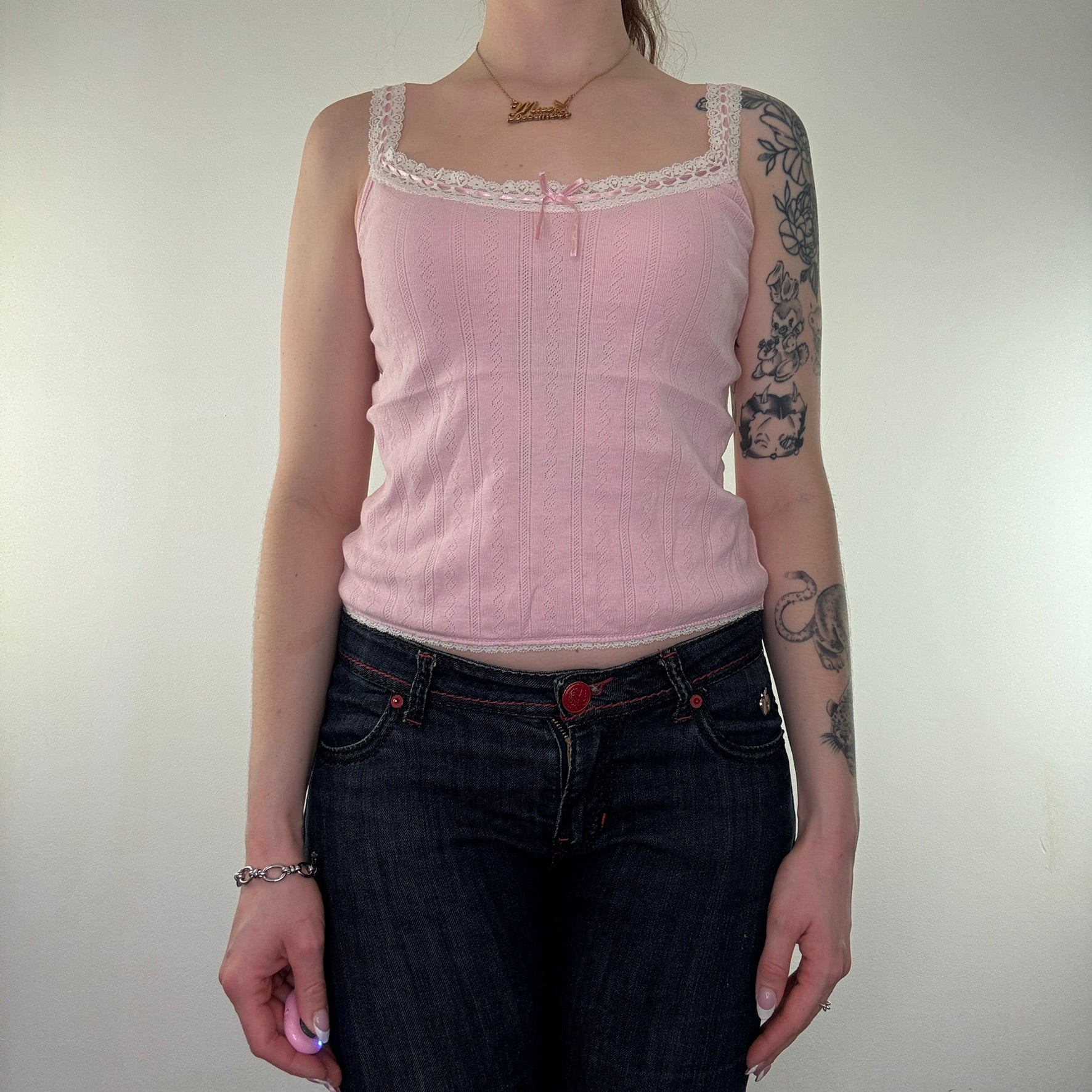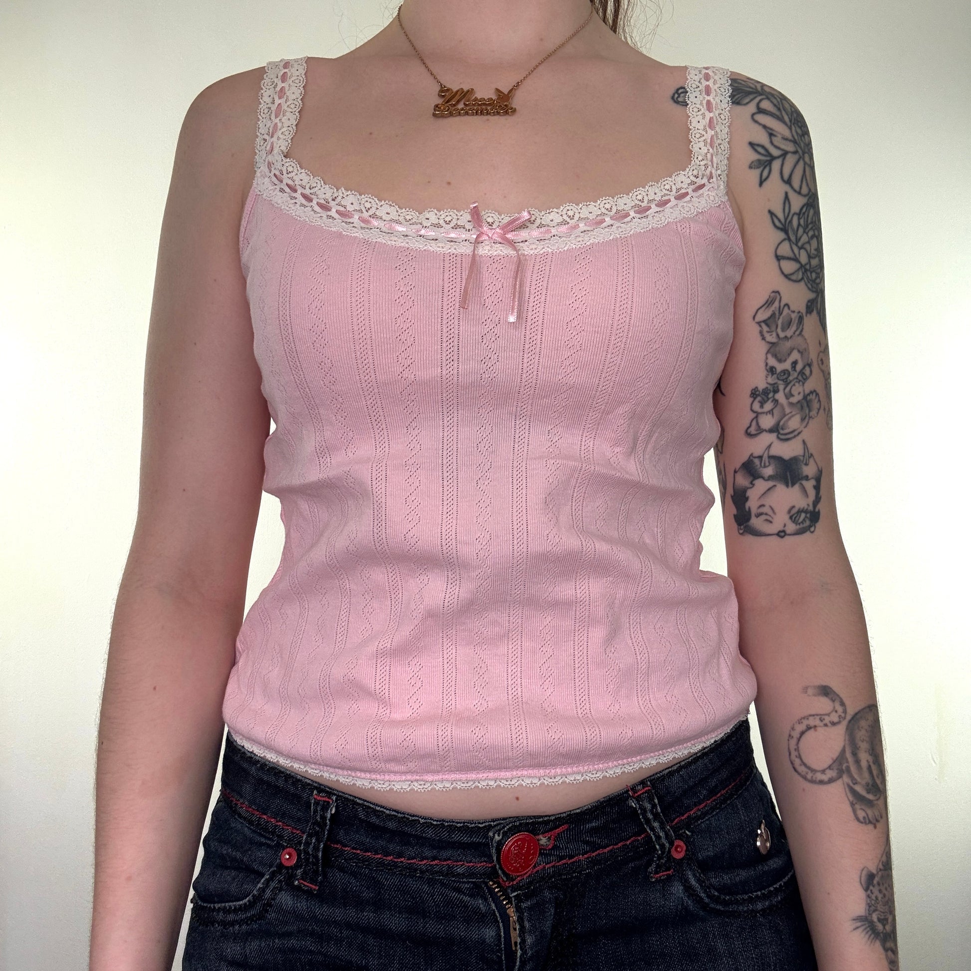 Coquette style, round neck, baby pink bow, white lace trim bust and straps, shorter length slightly cropped baby tee style, stretchy material