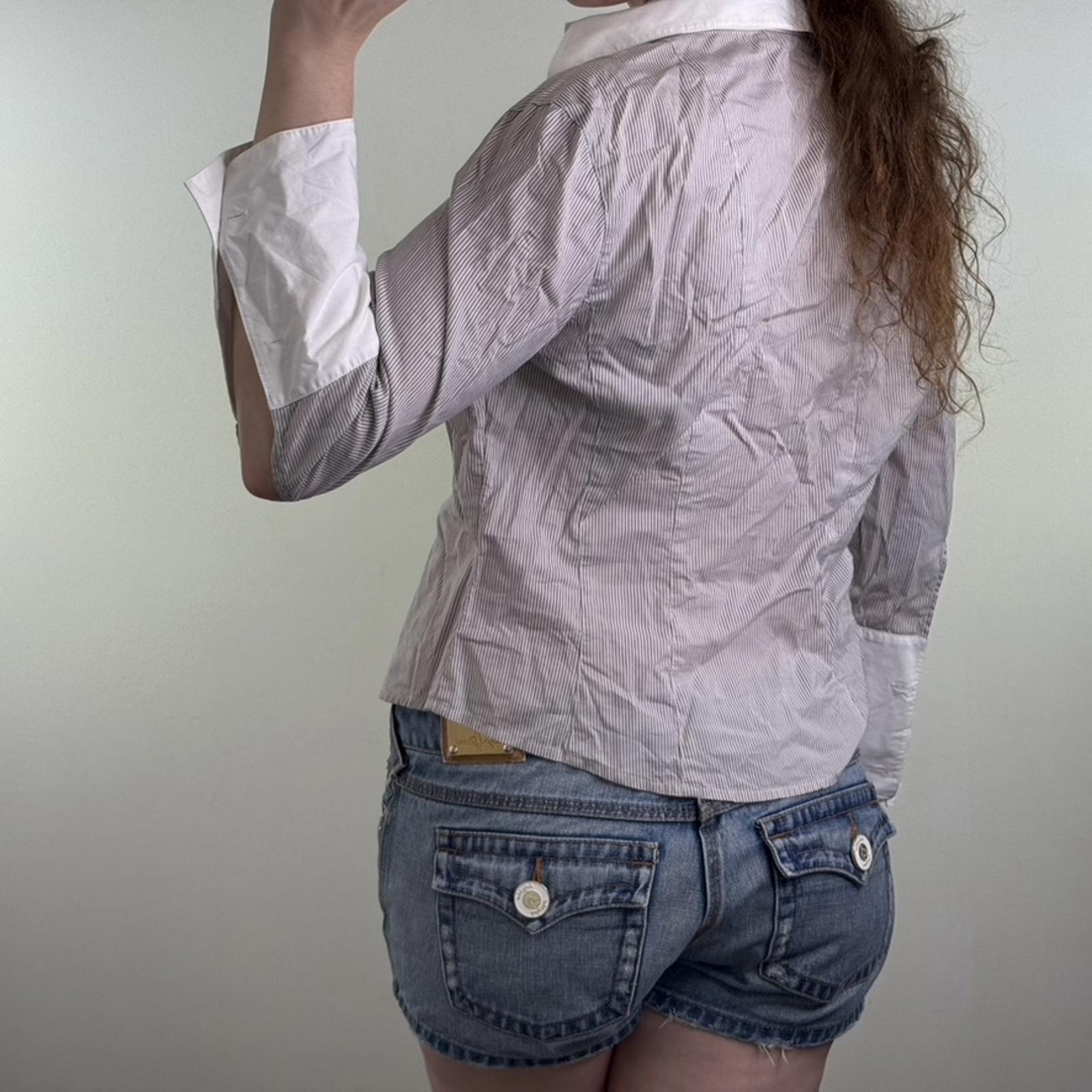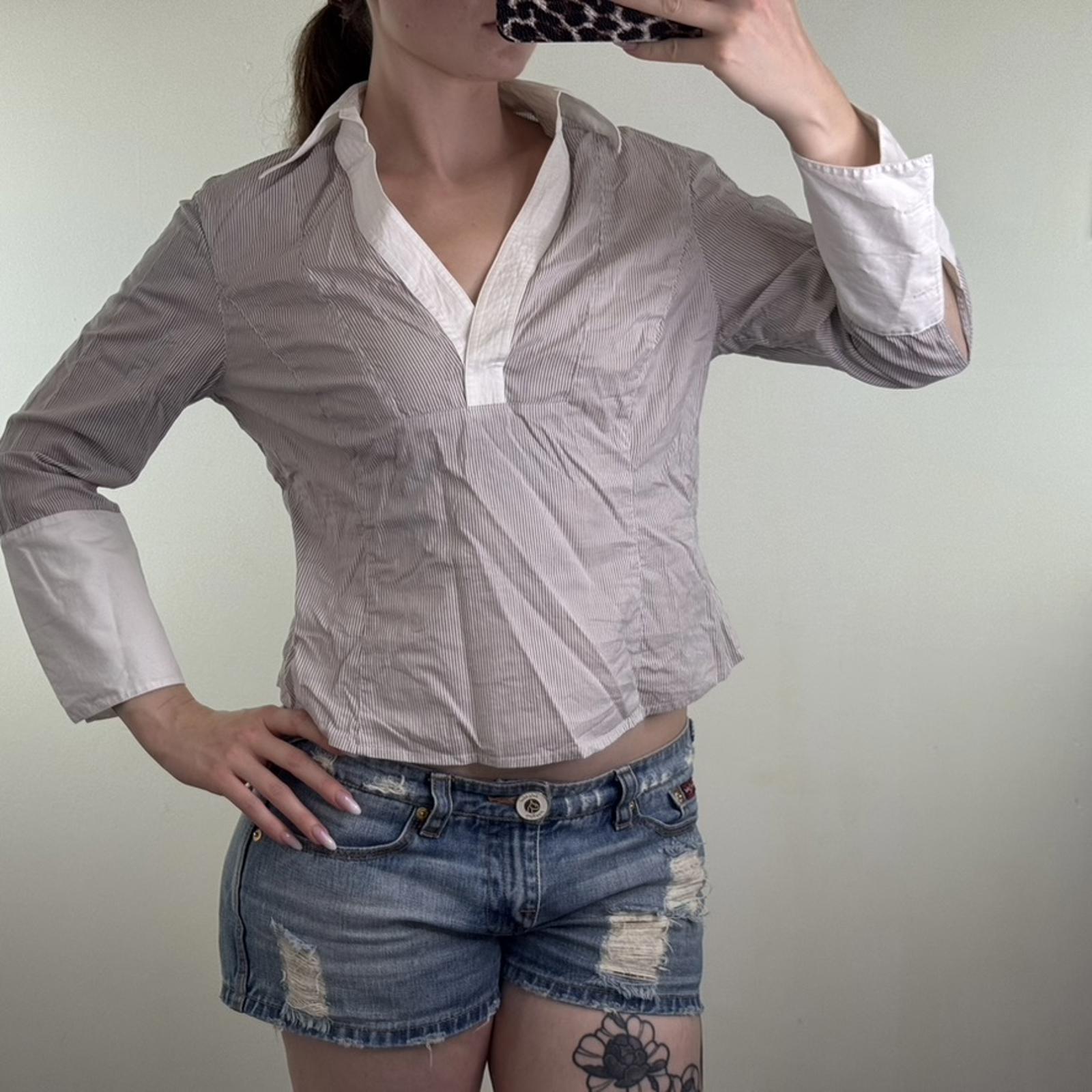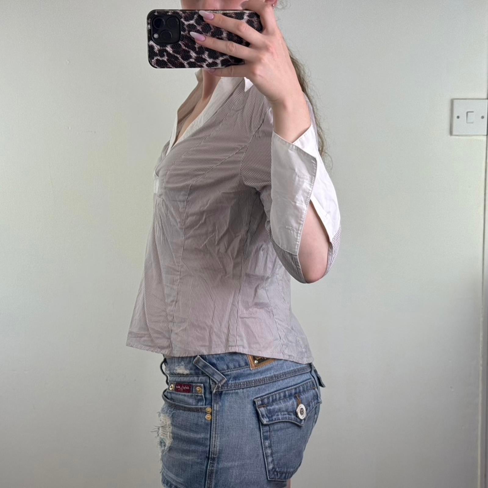 Y2K vintage pinstripe blouse long sleeve shirt white grey striped v neck office