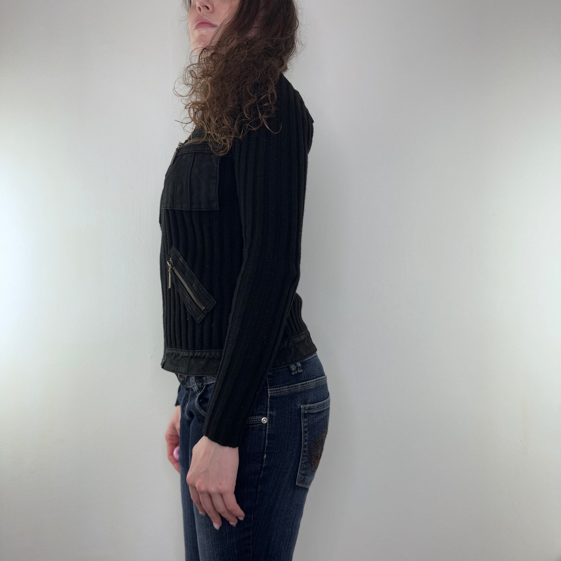 Cargo pockets, faded black suede, bronze zips, full zip up, high neck, stretchy knitted