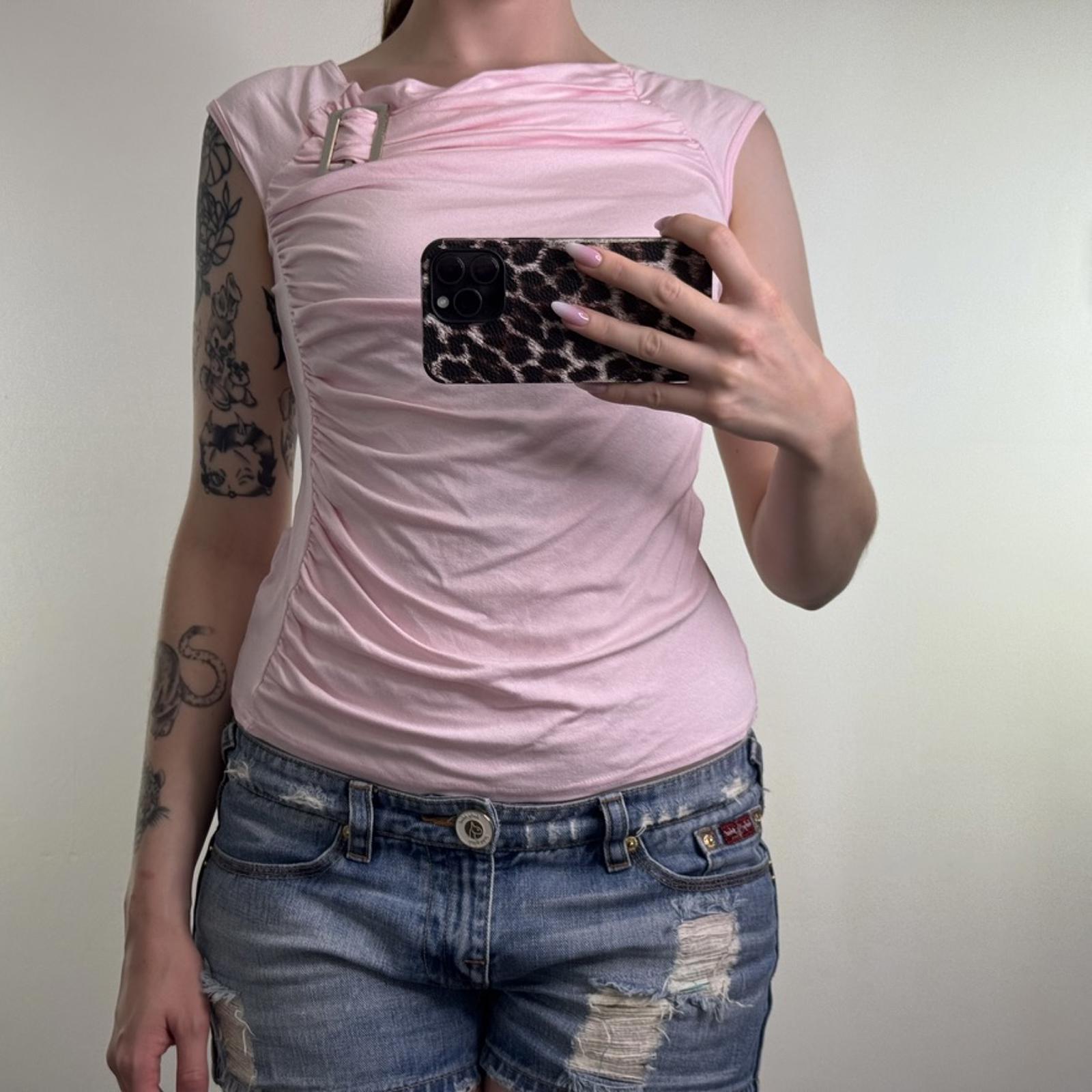 Y2K vintage ruched tank top buckle baby pink stretchy cowl neck