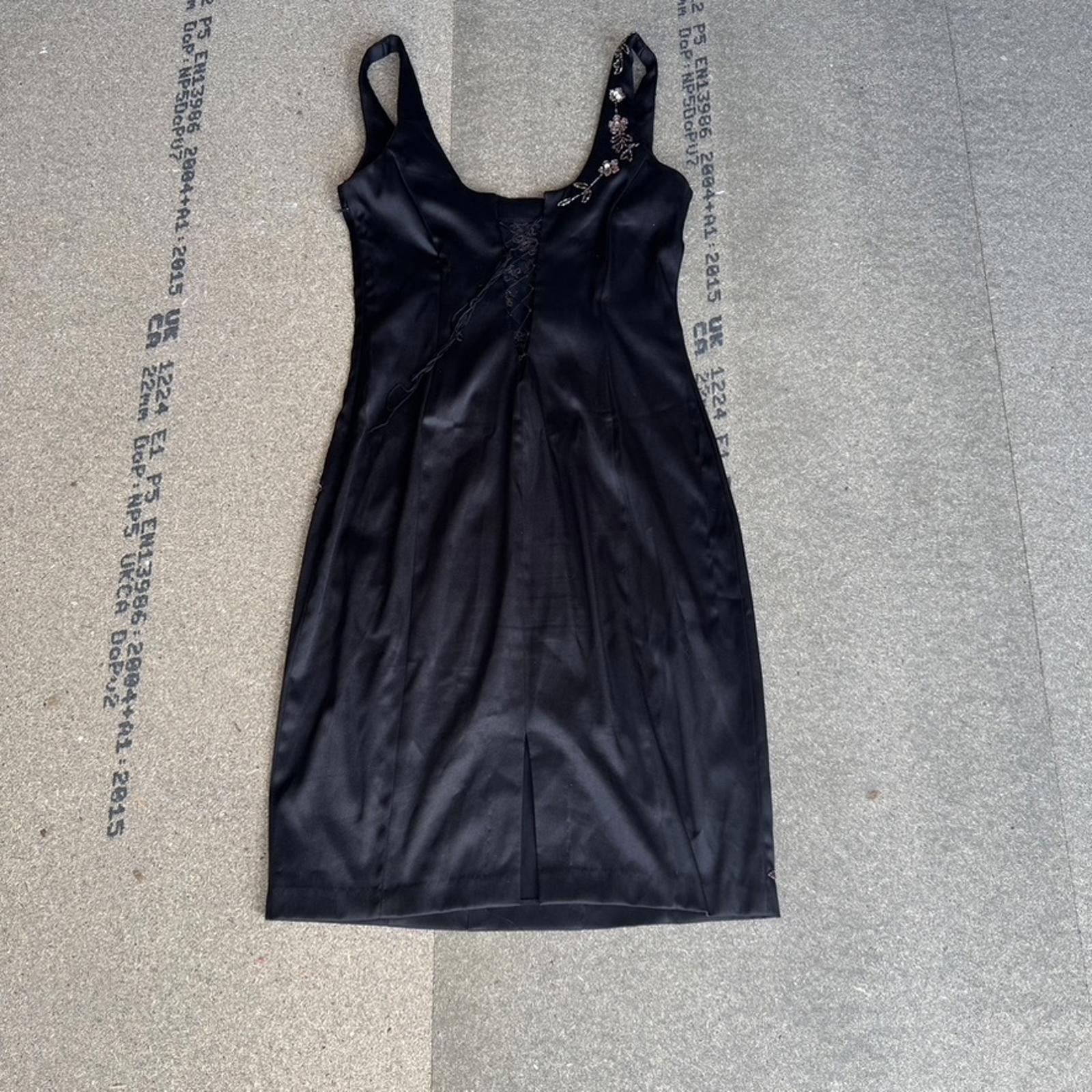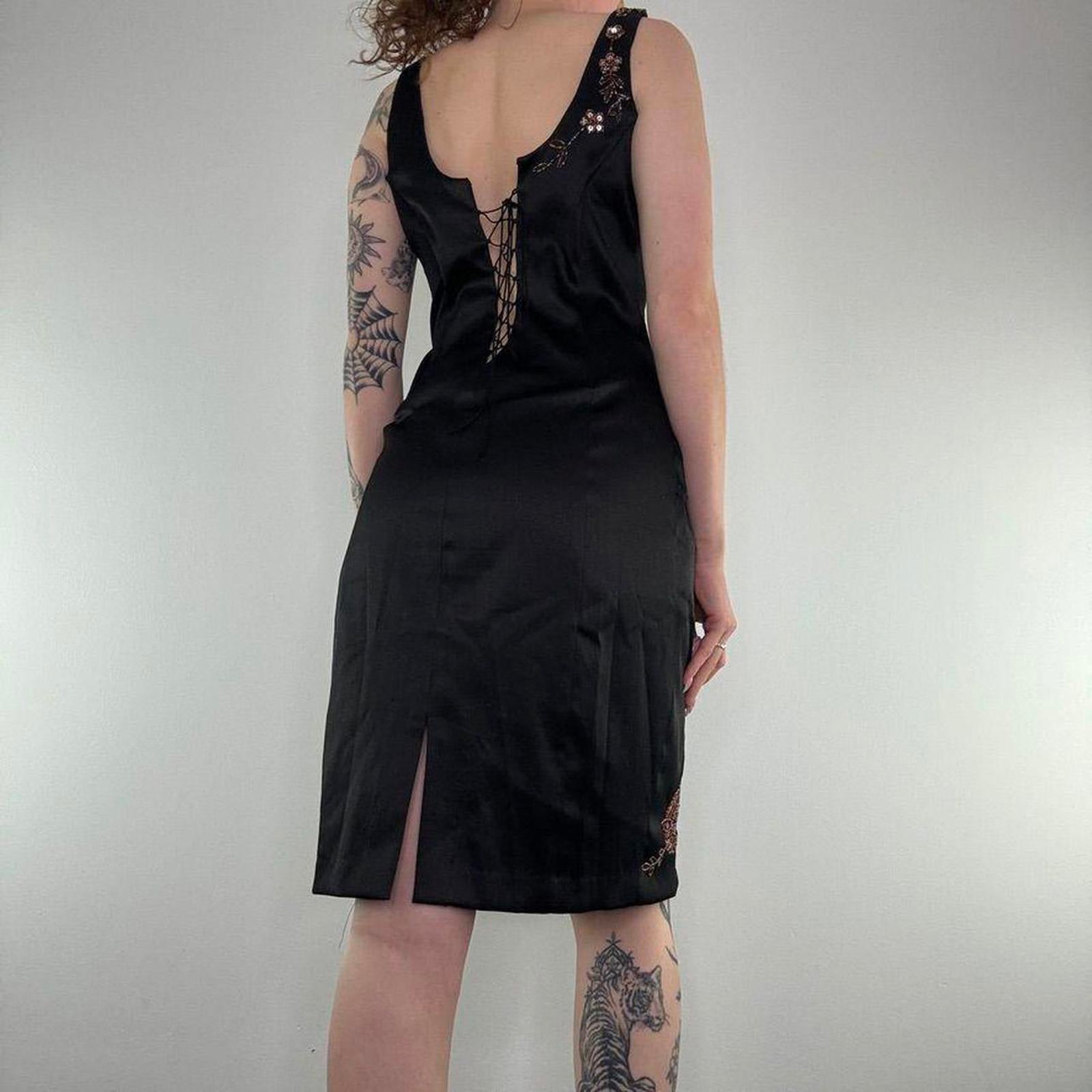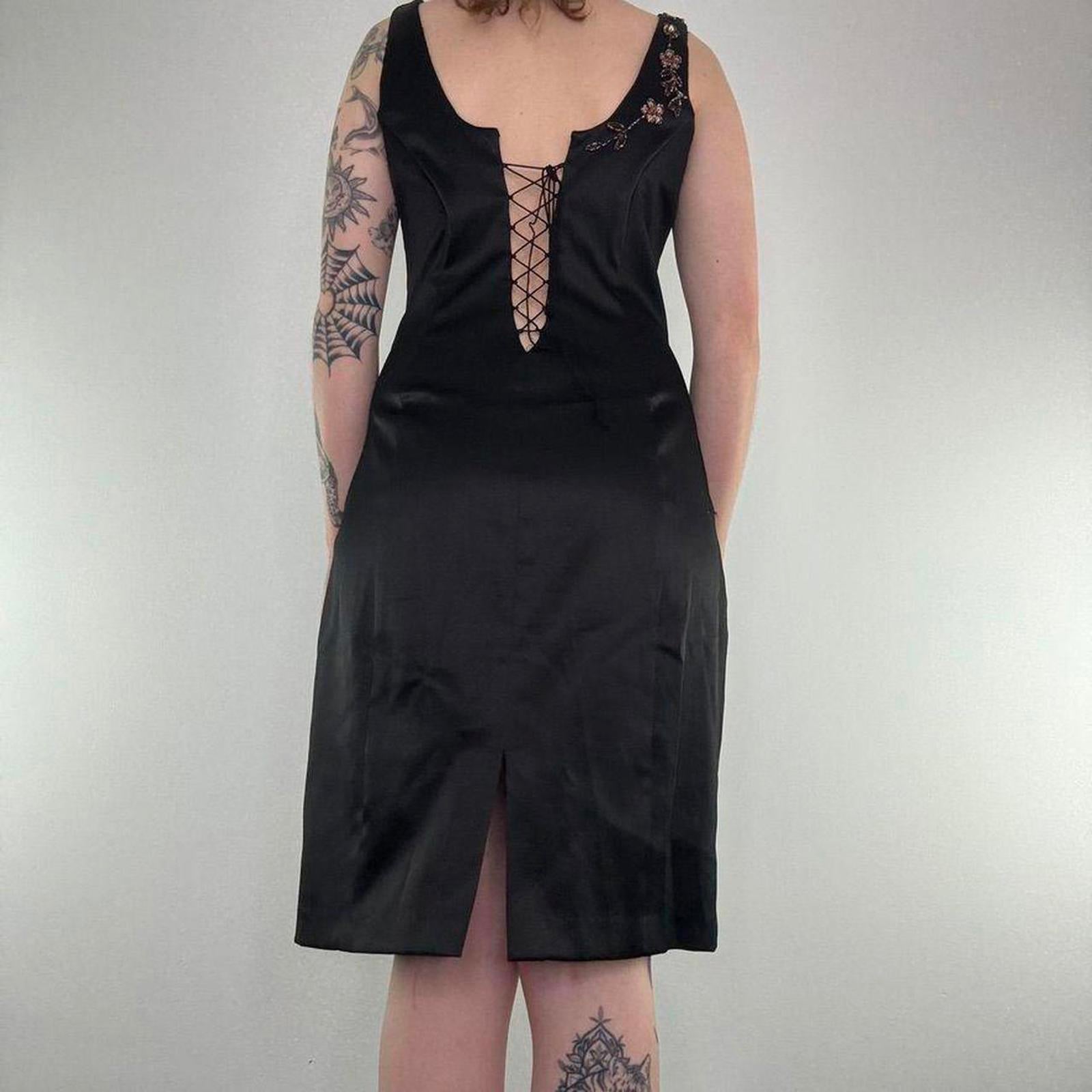 Y2K vintage satin style floral embroidered lace up midi dress fitted round neck