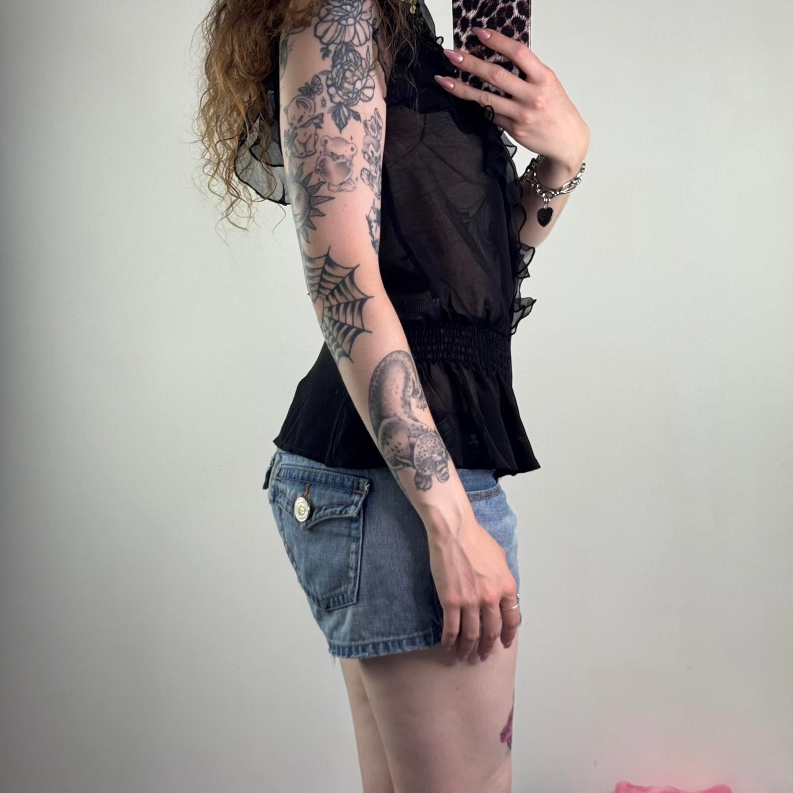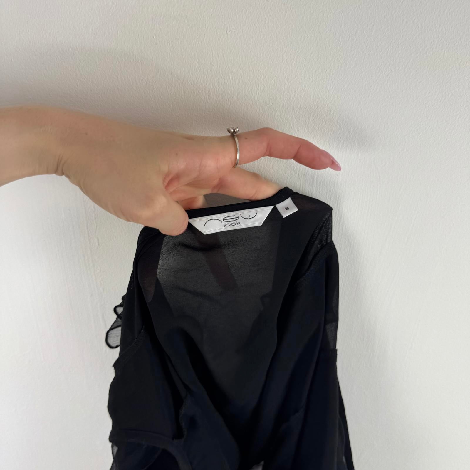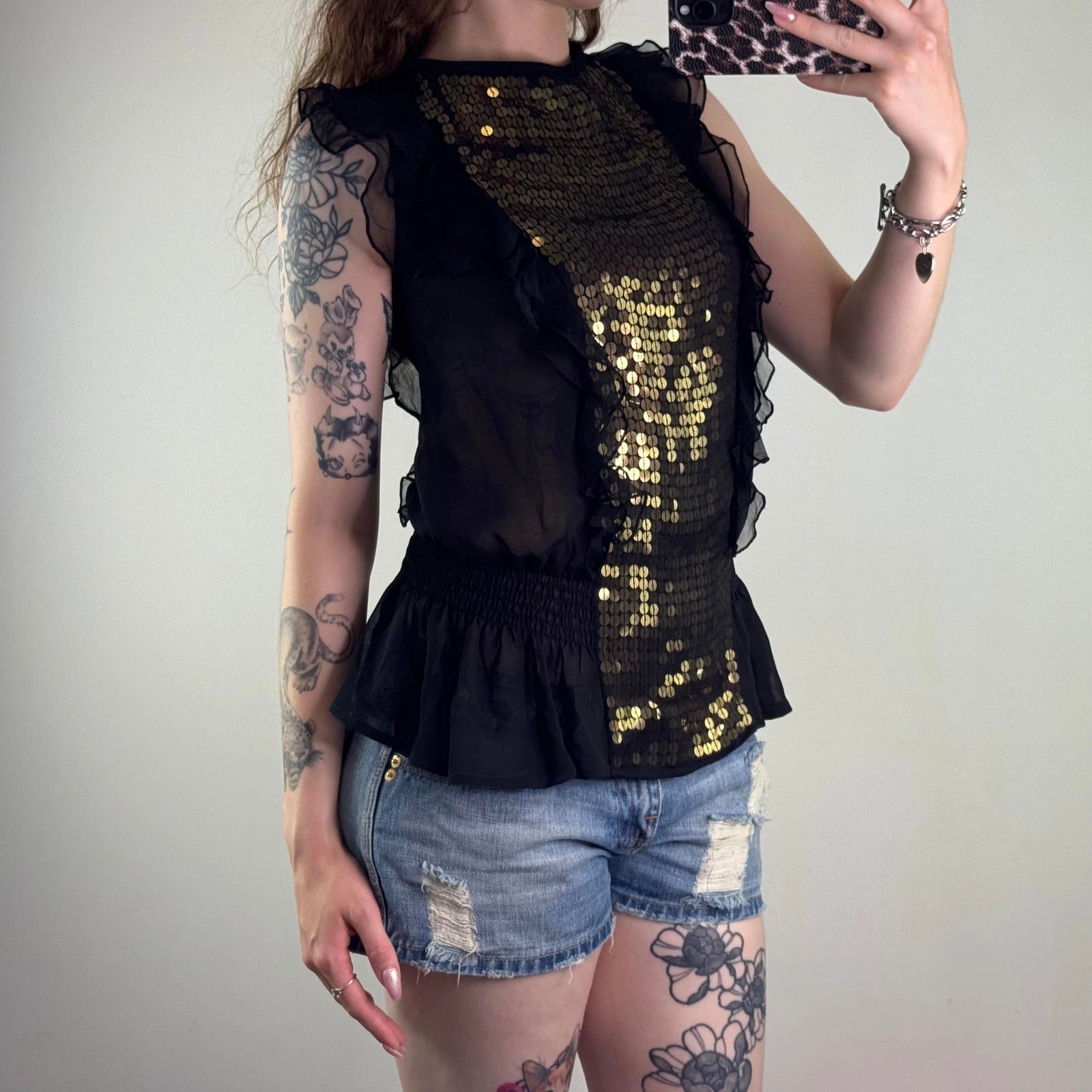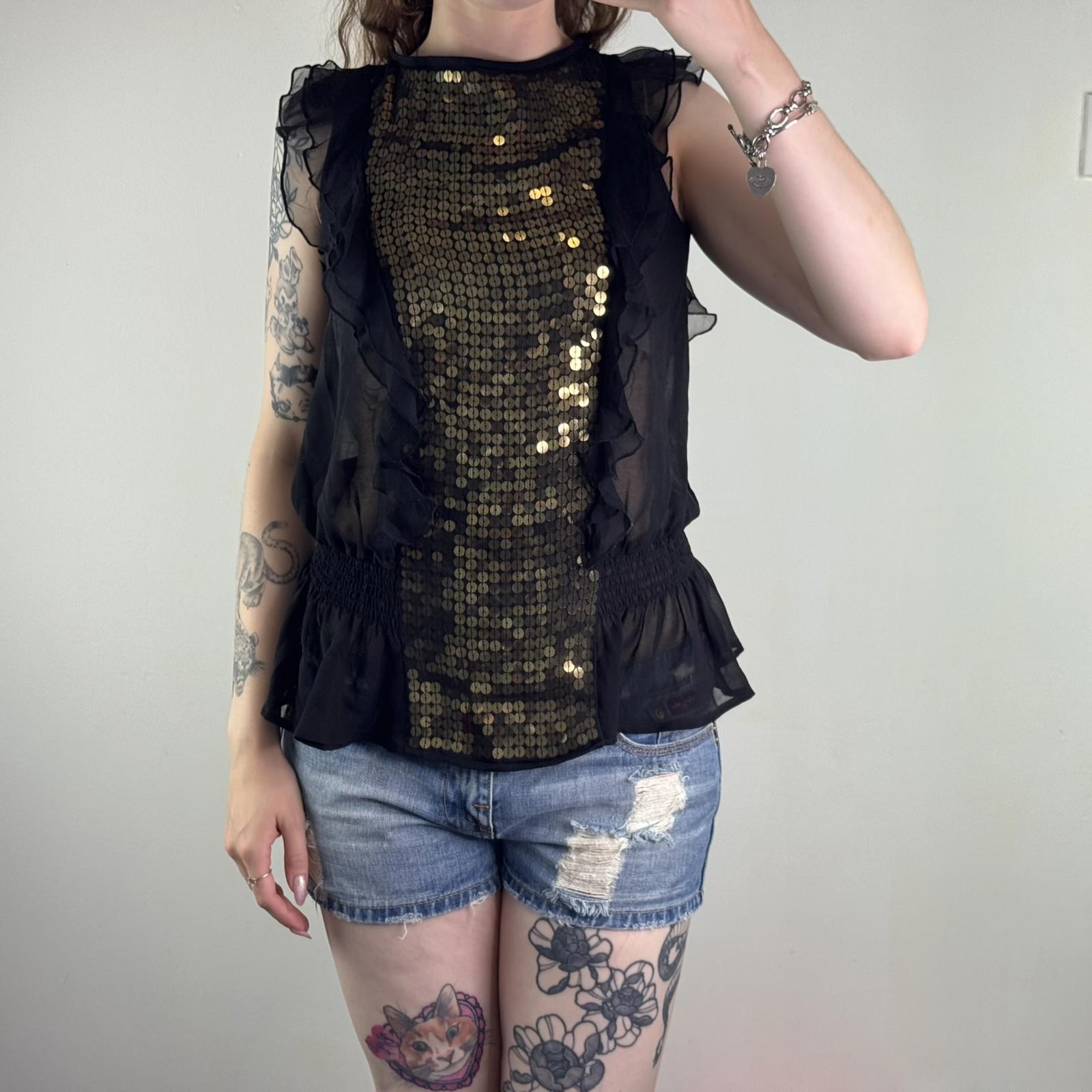 Y2K vintage sheer sequin top frill gold embellished open back bow black party