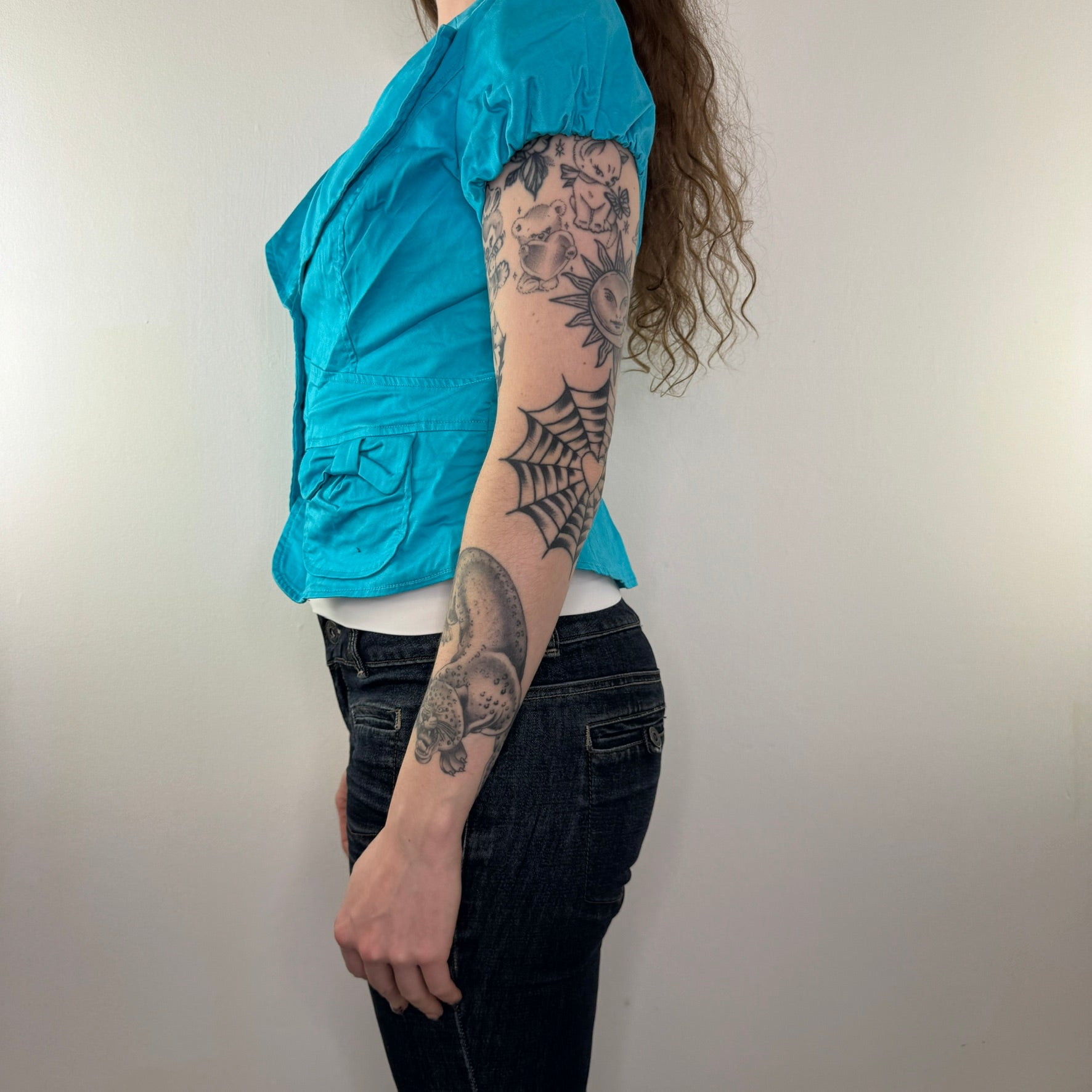 Puff sleeve, collar, bow pockets, polka dot buttons, fitted cinched look