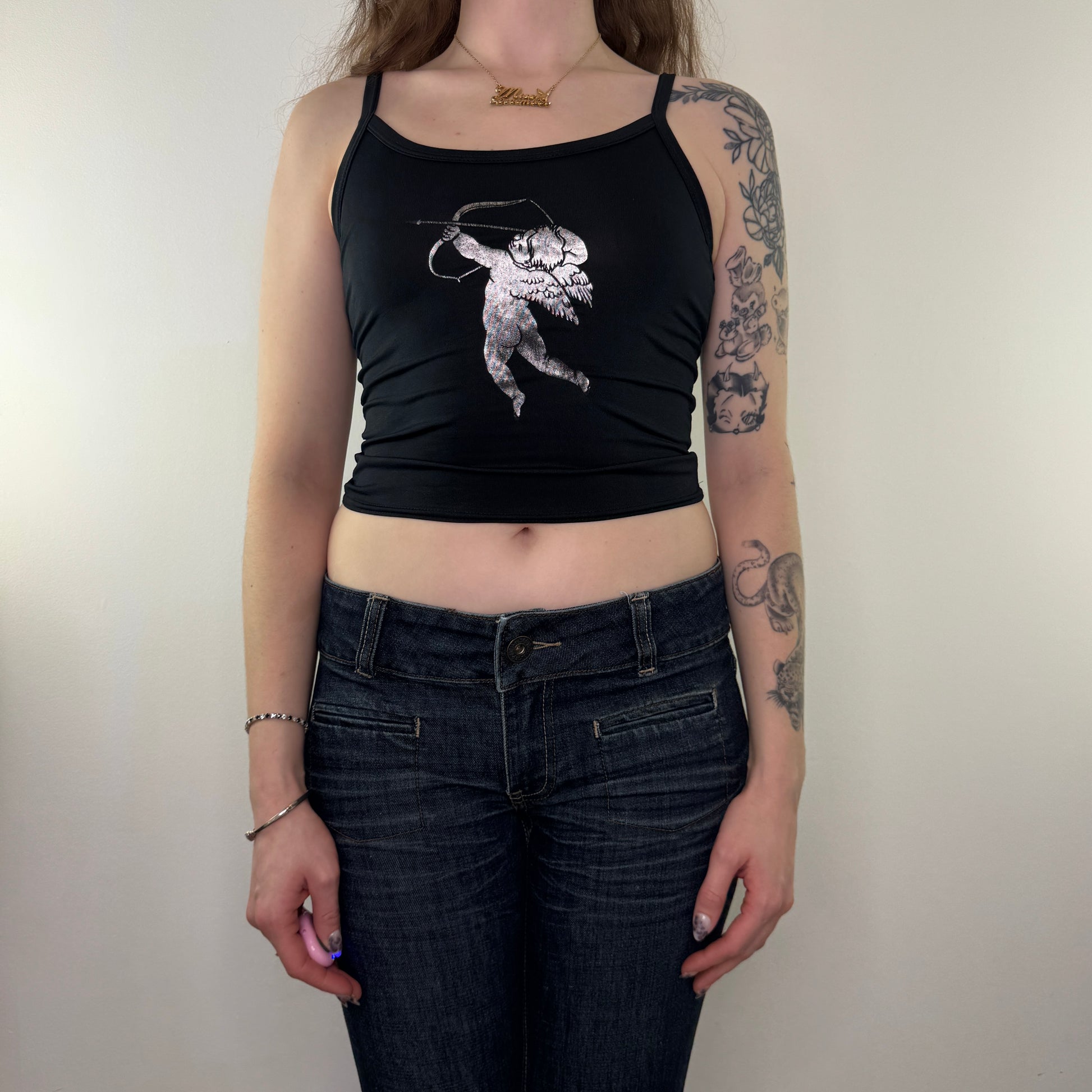 Cherub angel shiny metallic graphic print, strappy top, fitted cinched look