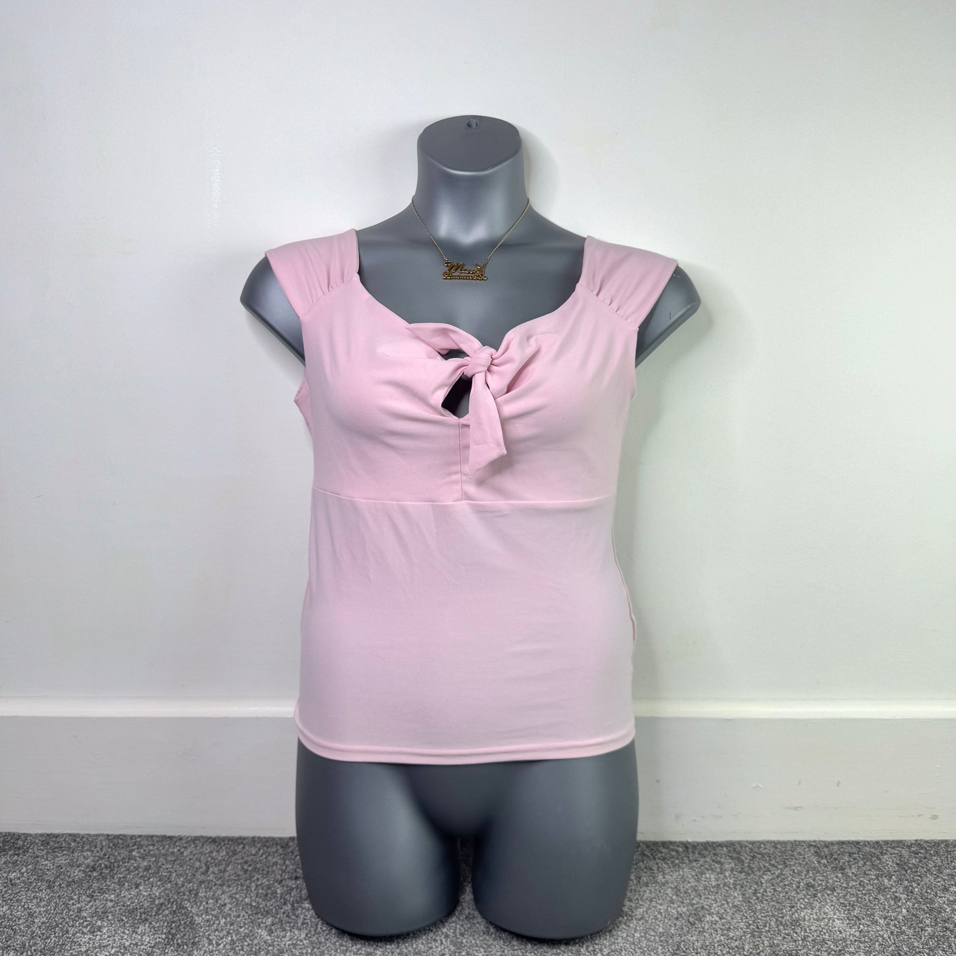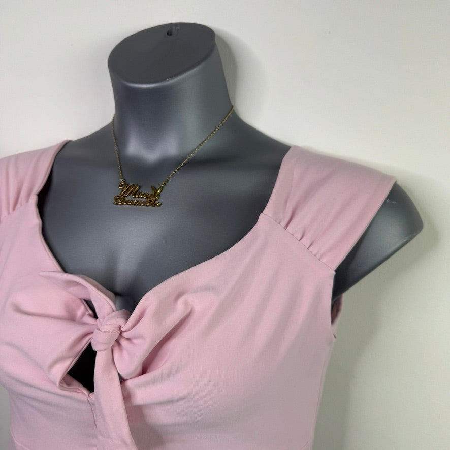Ruched cap sleeve, round neck, stretchy material, tie knot bust, baby light pink