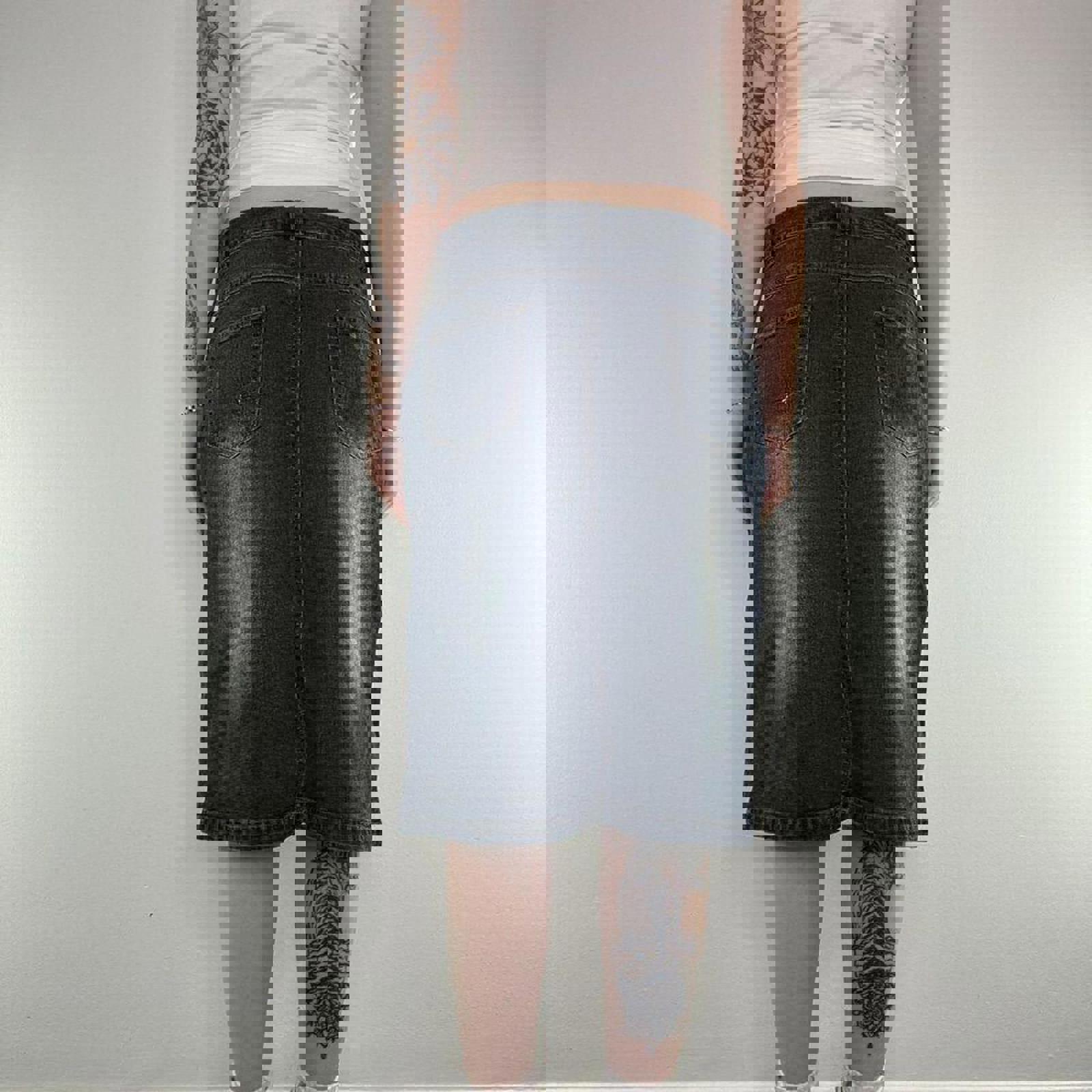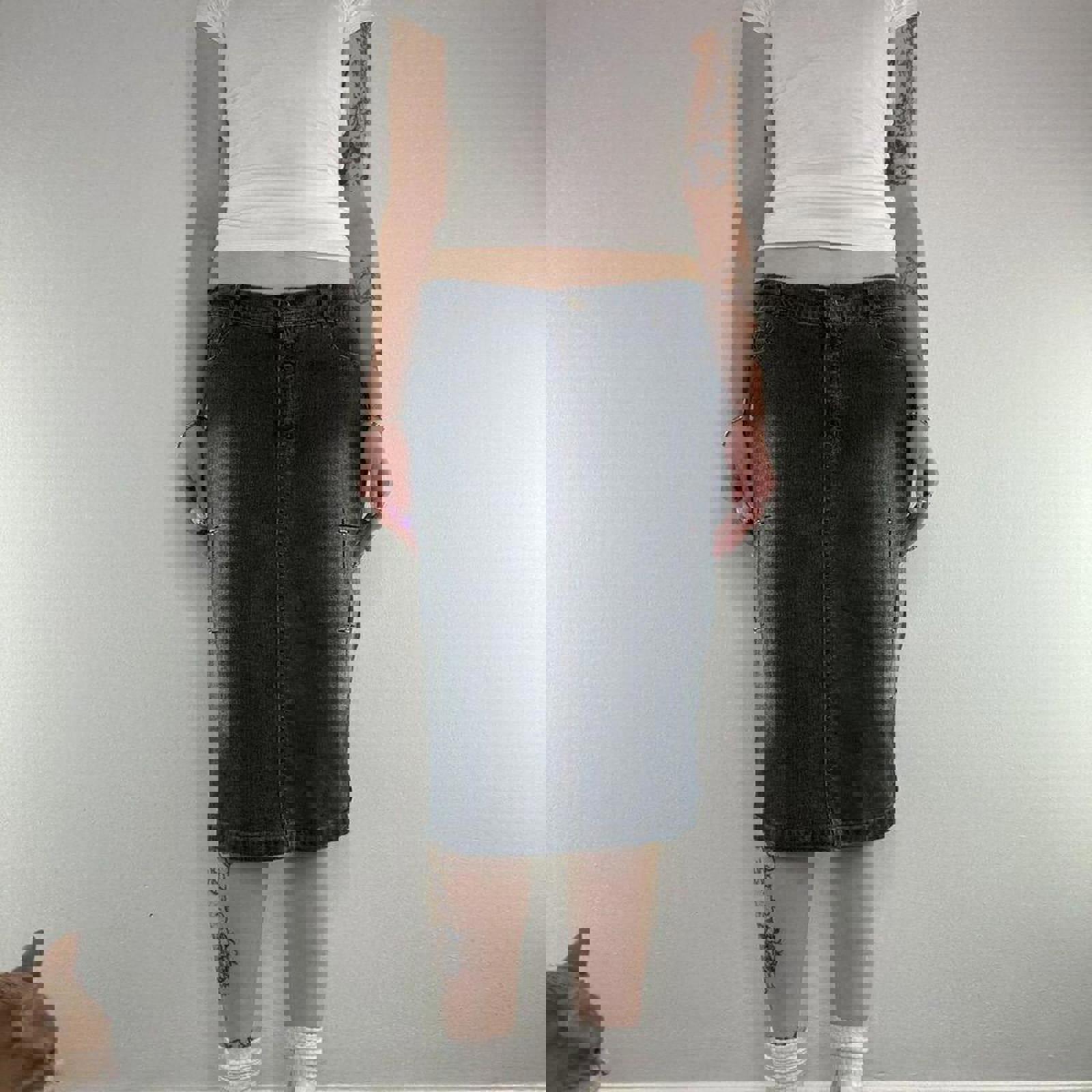 Knee length, sparkle embroidery on front and back pocket with rhinestone embellishments, dark navy blue faded archive distressed wash, can be worn low or mid rise, a line fit