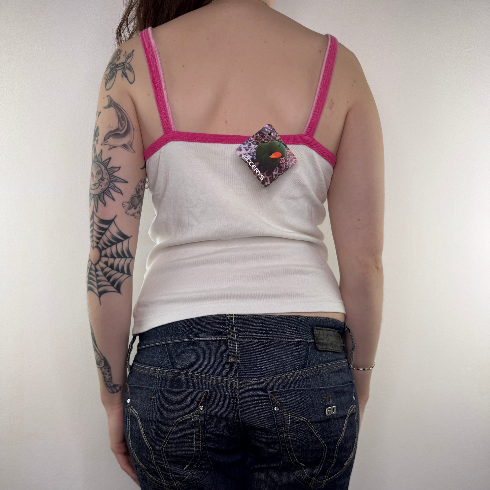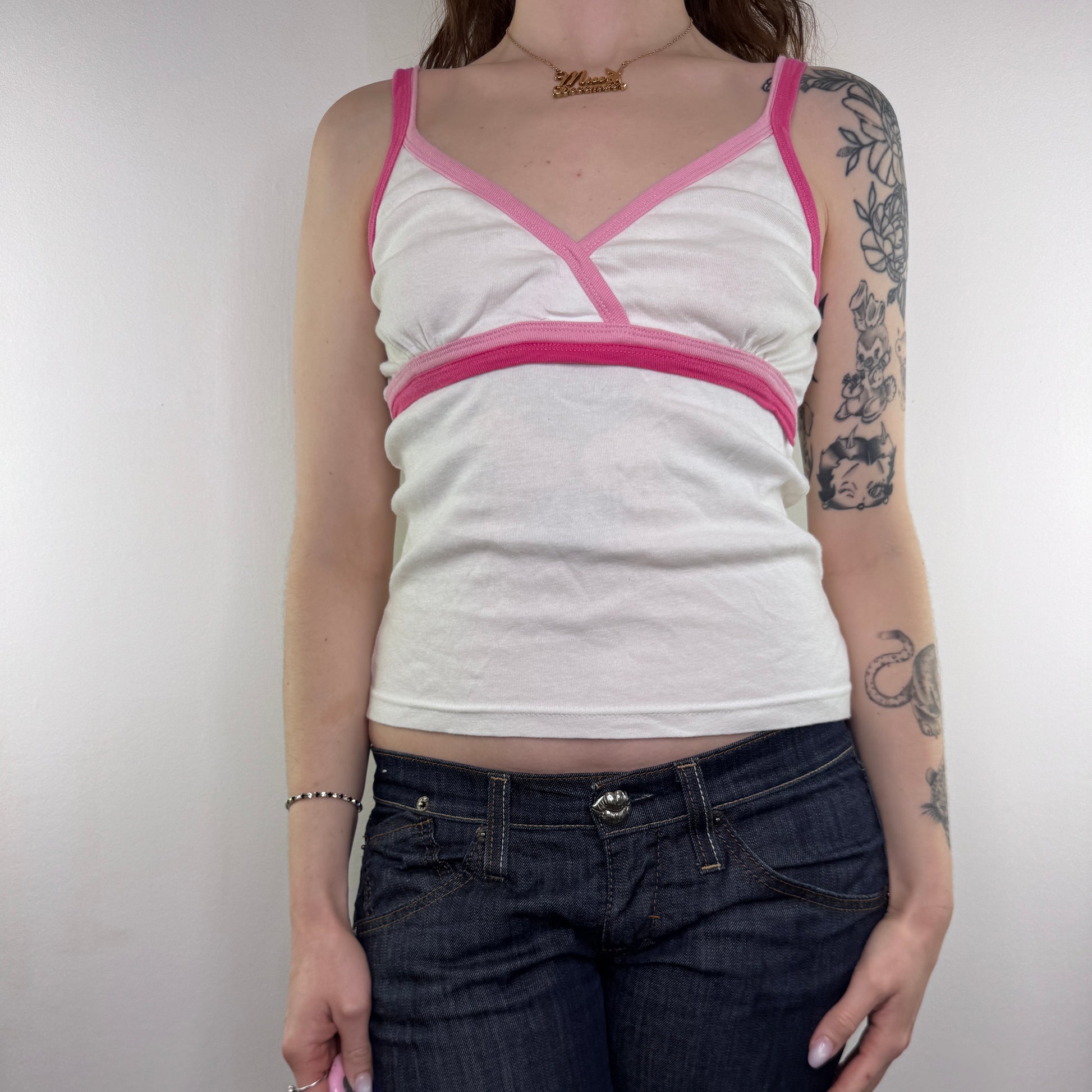 White with baby/ dark pink trim, v neck, ruched bust detail, basic staple summer top