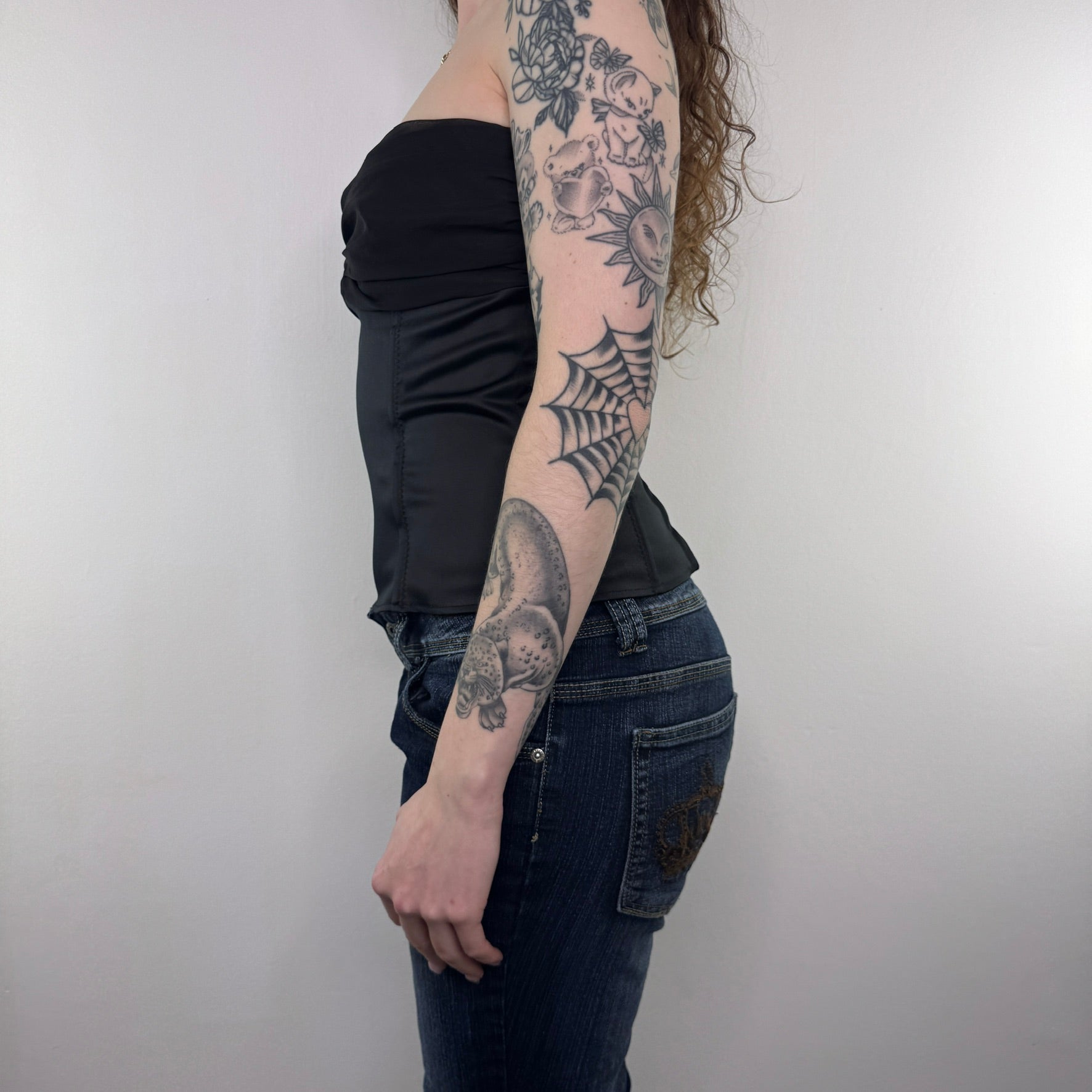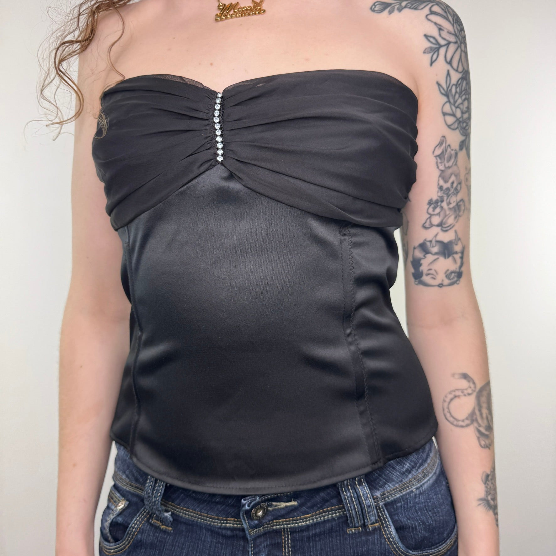 Ruched bust, rhinestones, satin, hook and eye closure, boning structure