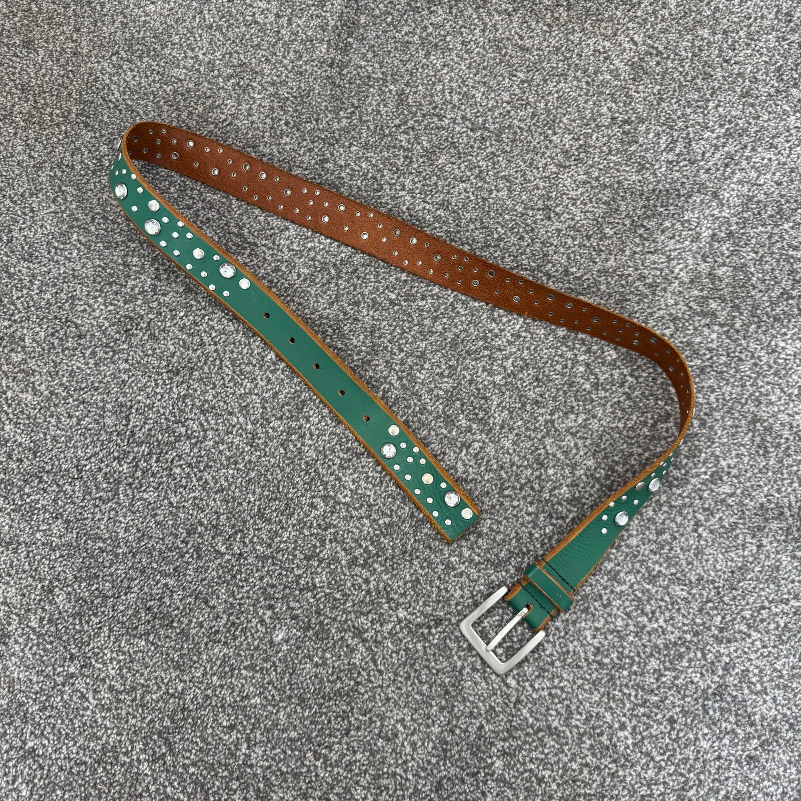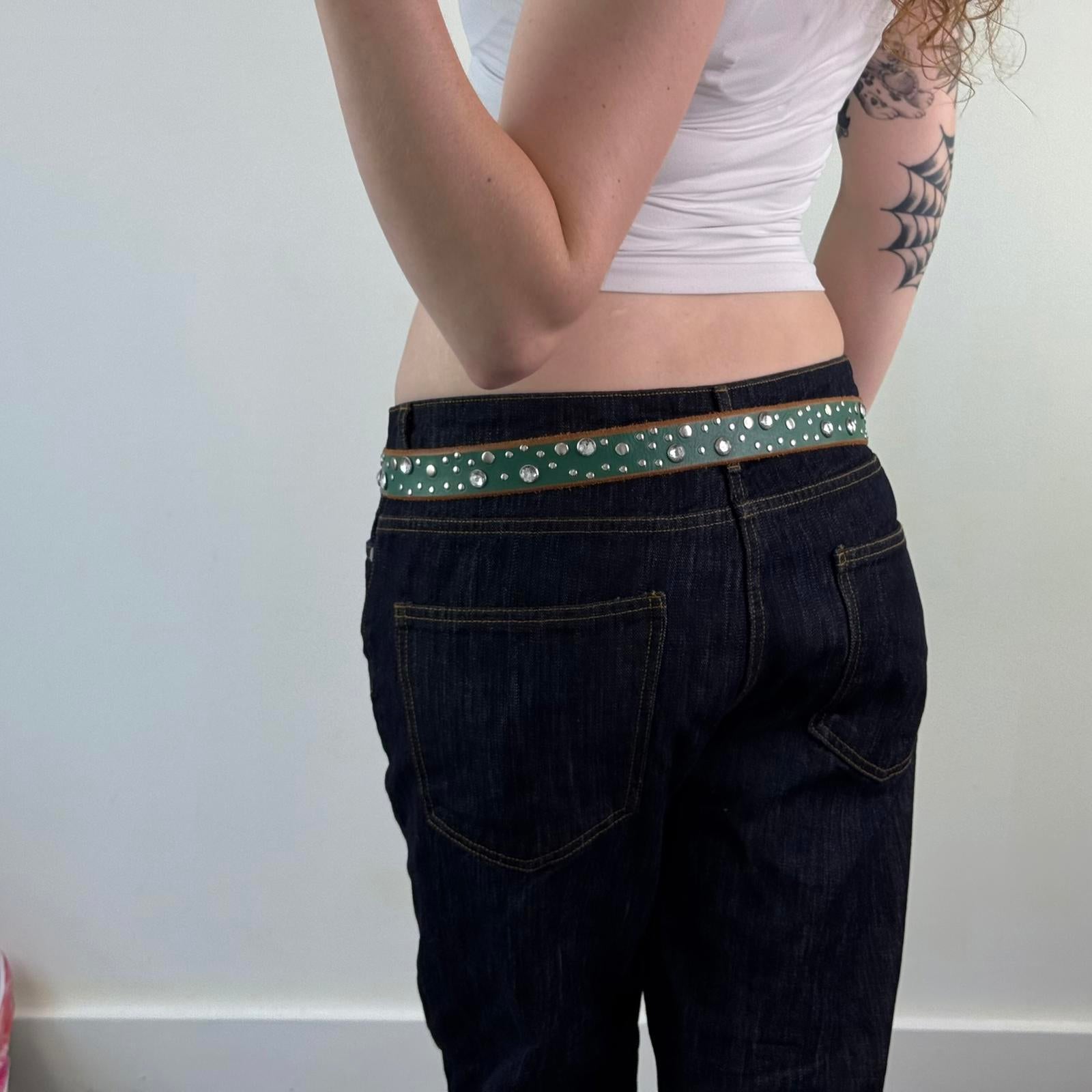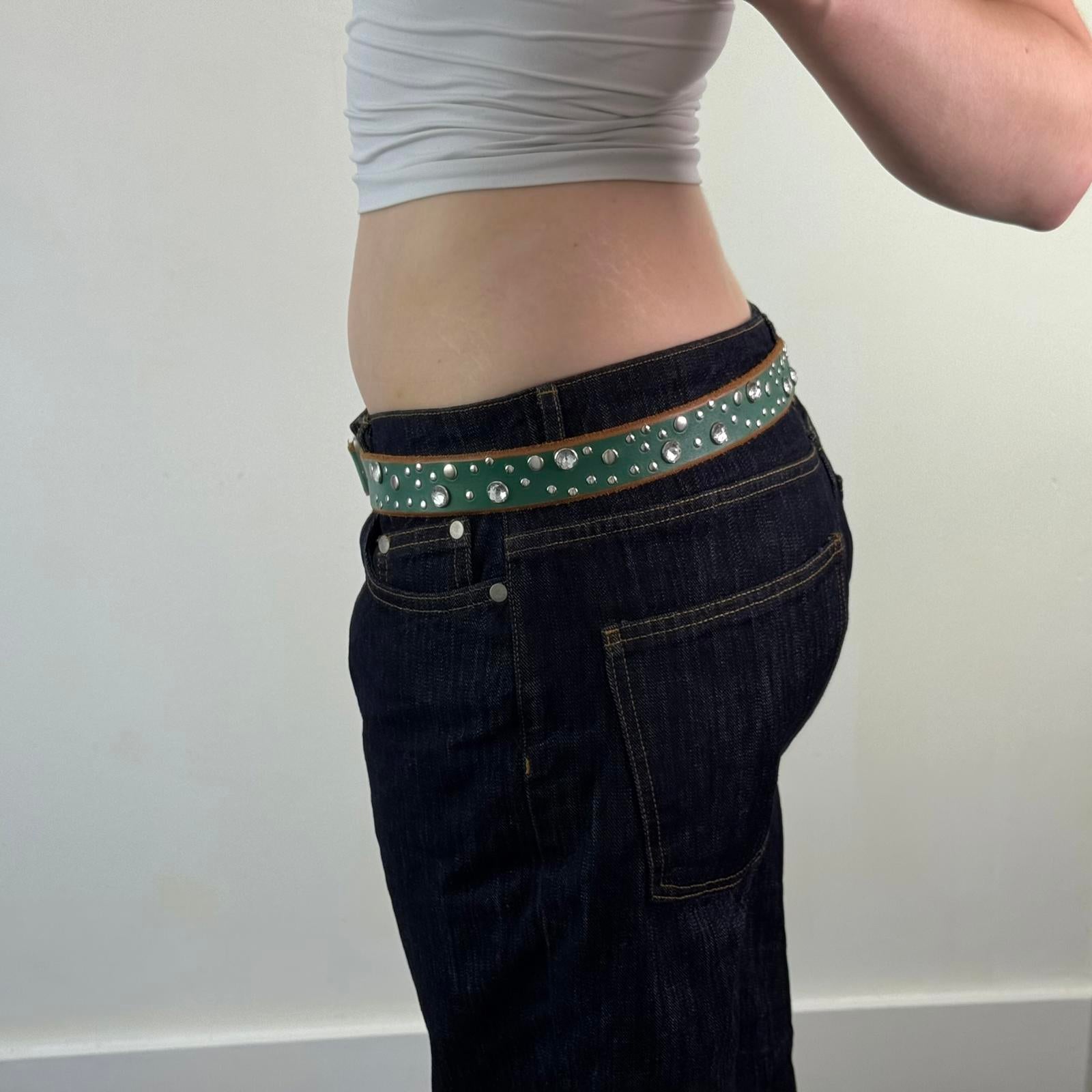 Y2K vintage studded rhinestone belt faux leather green silver embellished