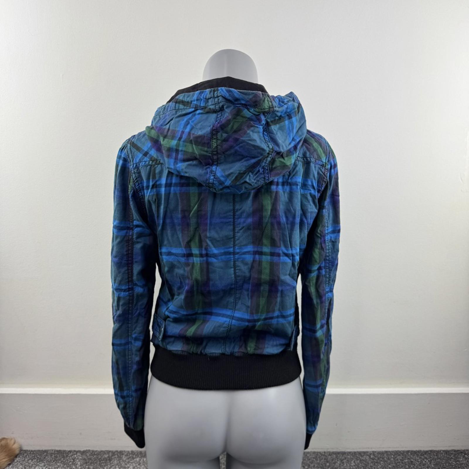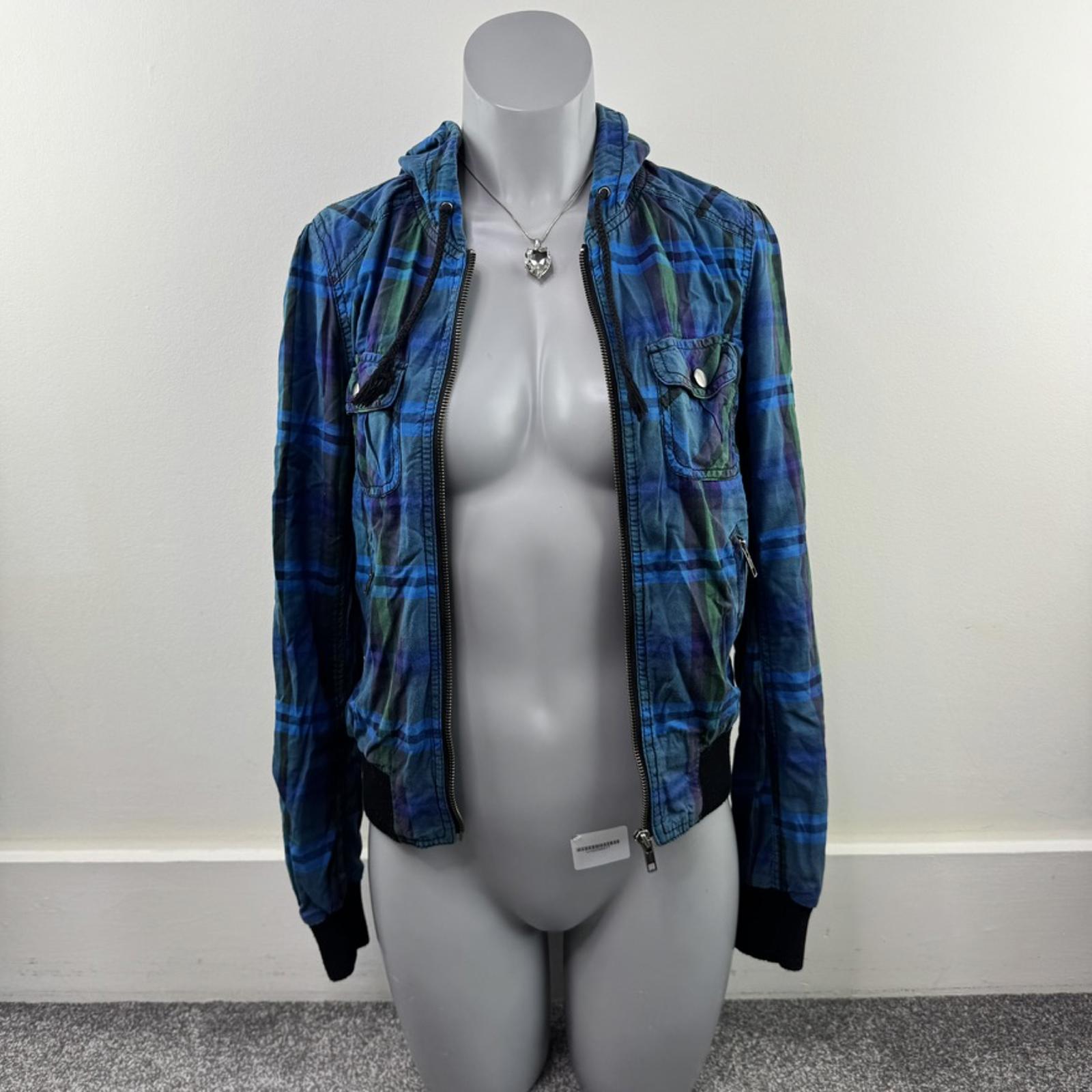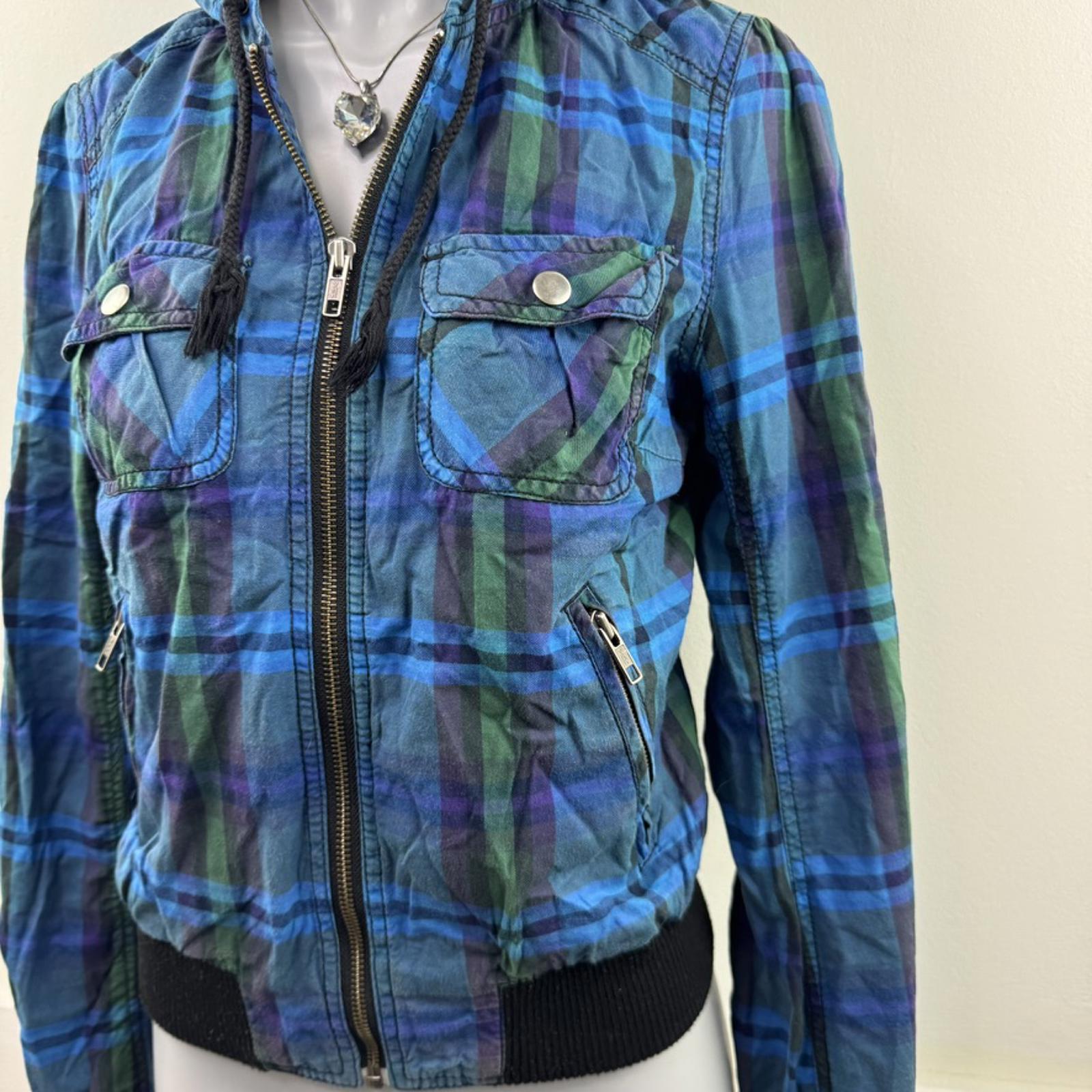 Y2K vintage tartan check zip up bomber jacket lightweight with hood plaid blue
