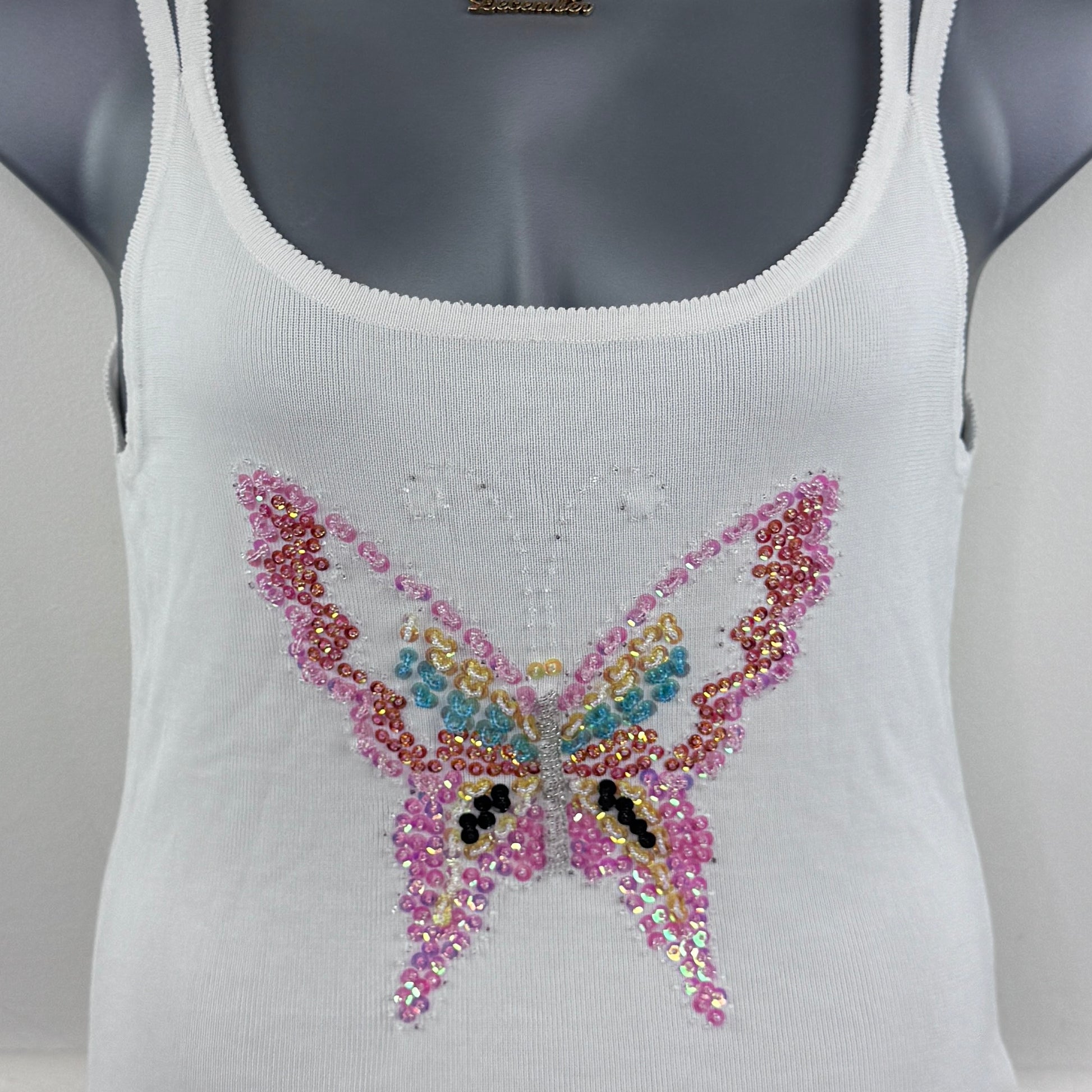 Double strap, strappy top, pink multi sequin butterfly, round neckline, stretchy material, plus size