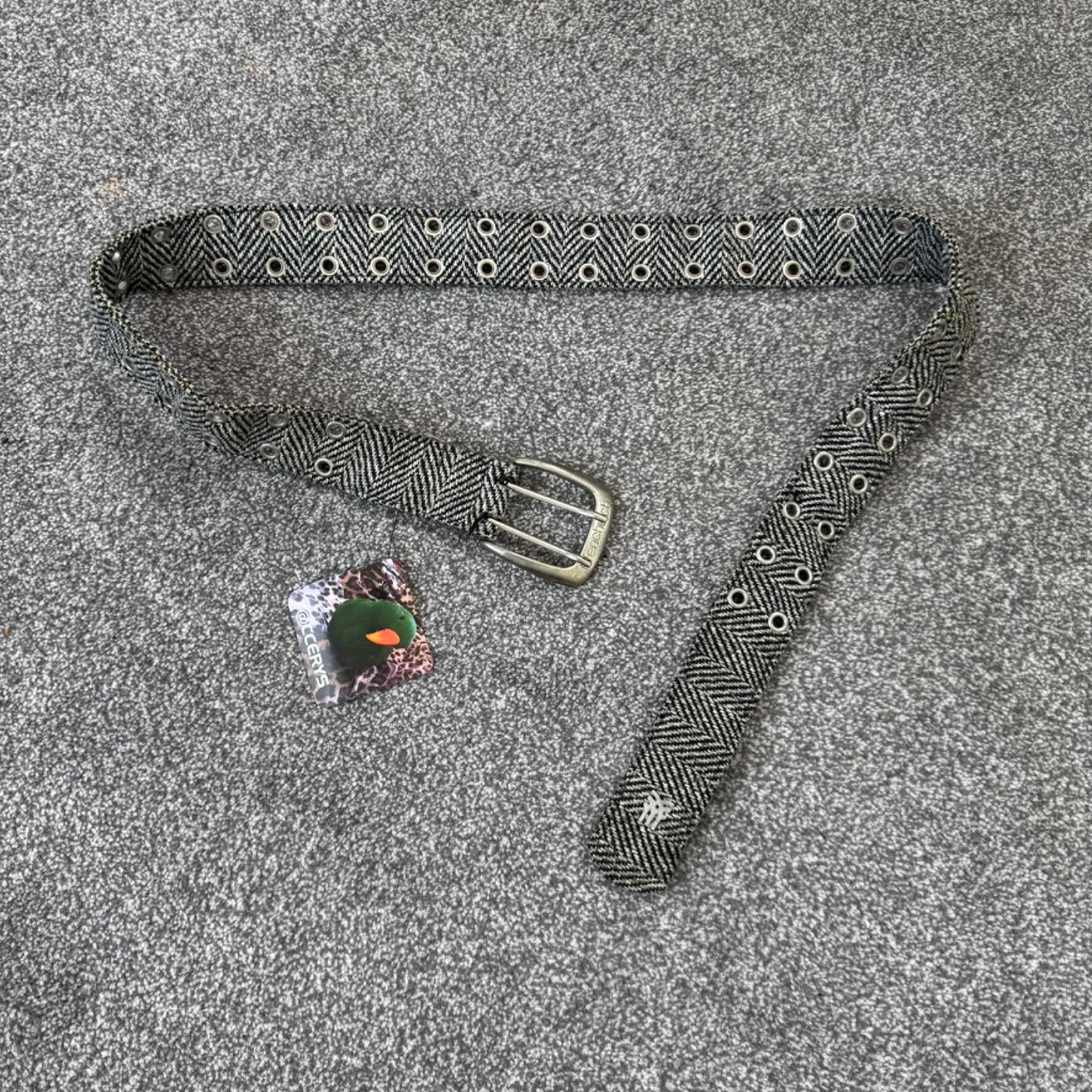 Y2K vintage tweed grey black white pattern belt grommet silver square buckle