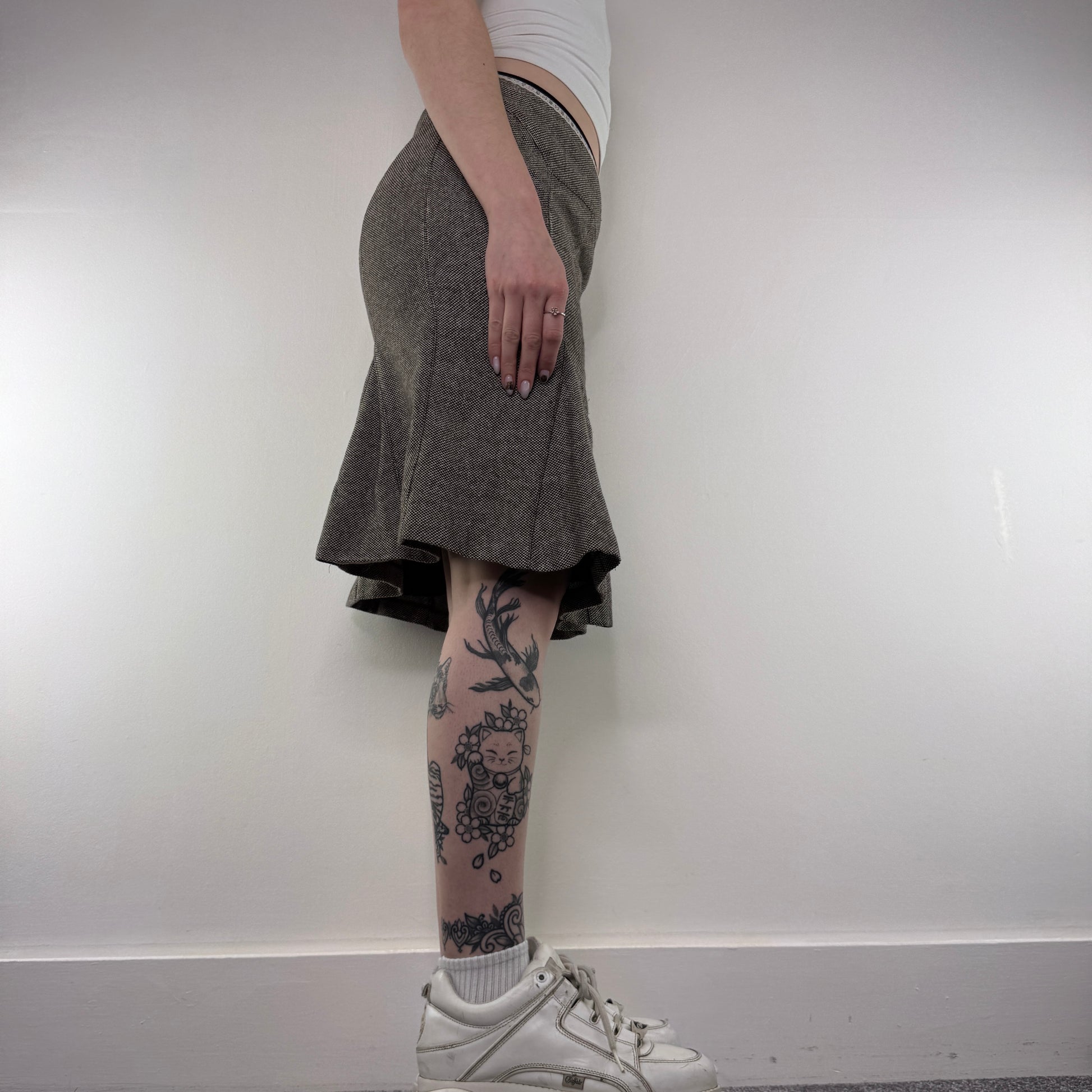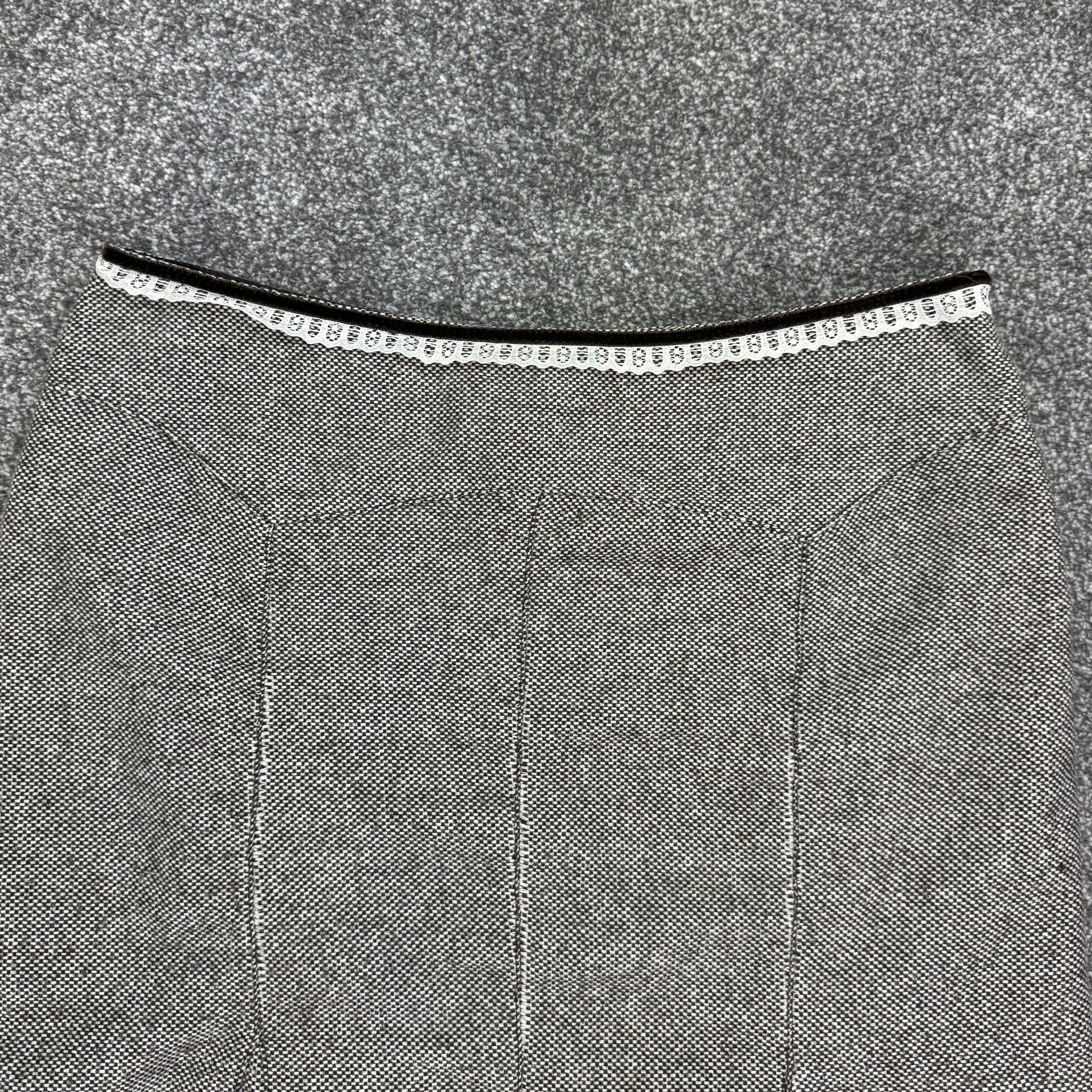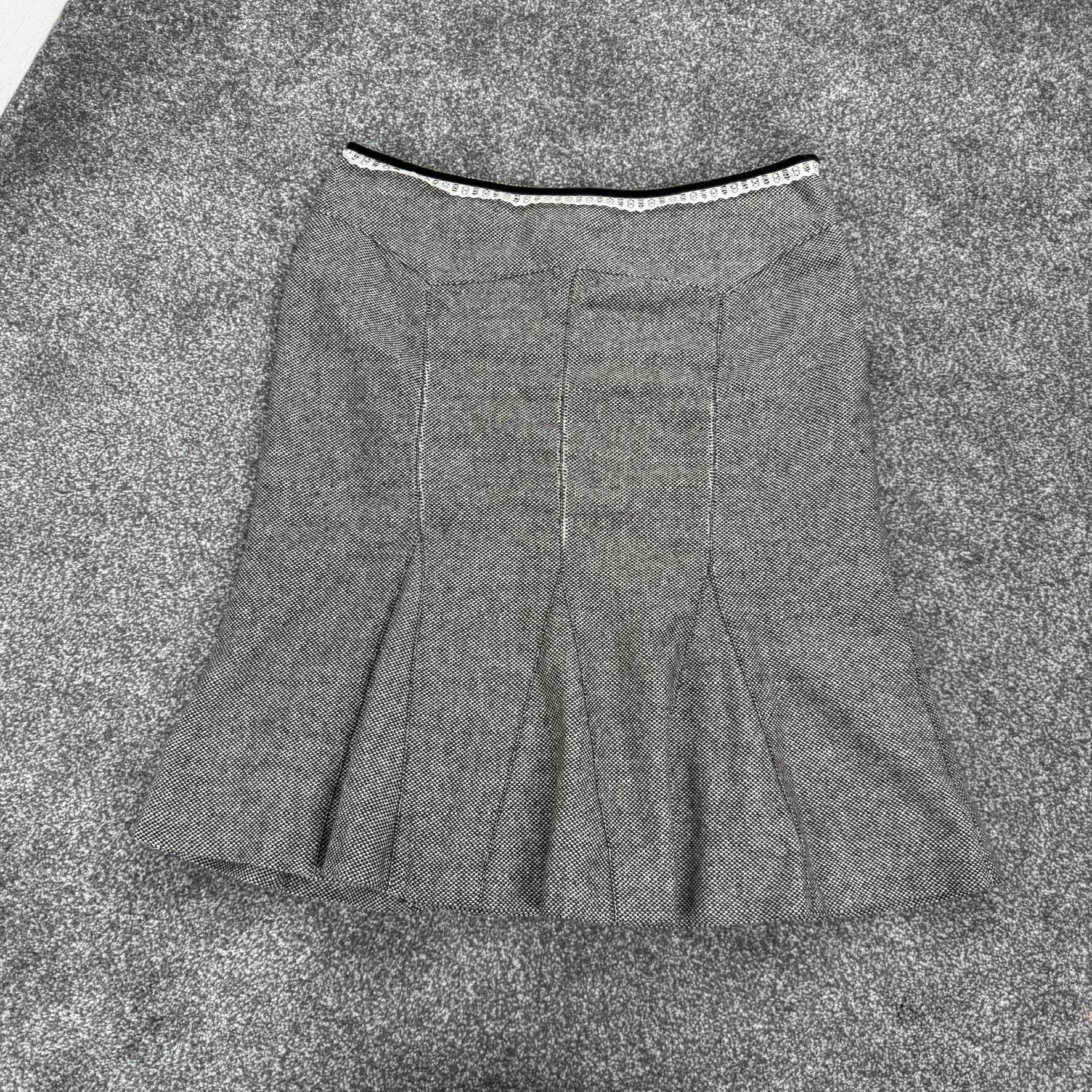 A-line floaty hem, white lace trim waistband, knee length, academia office siren