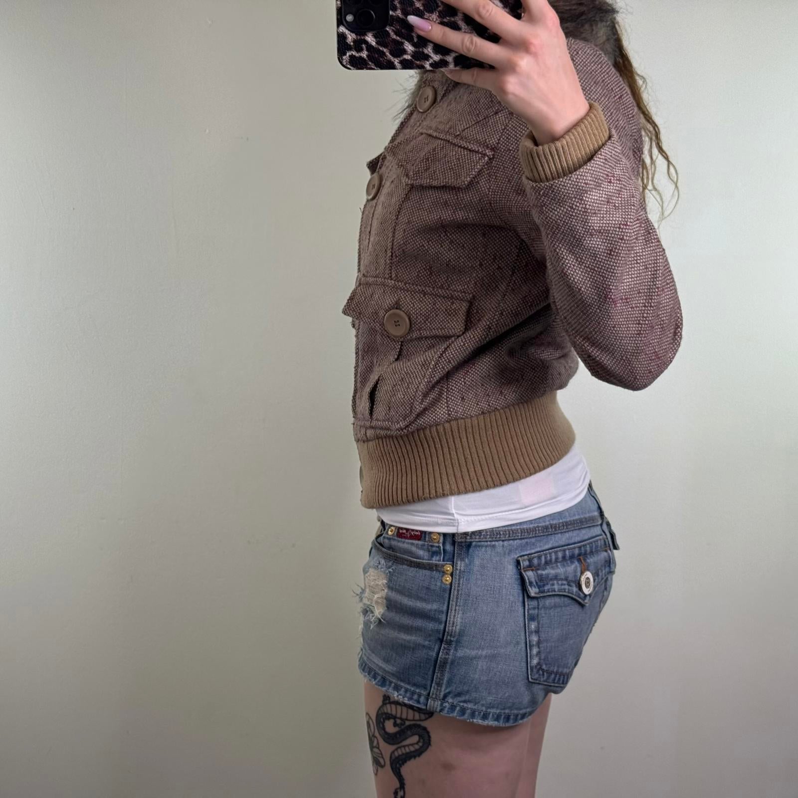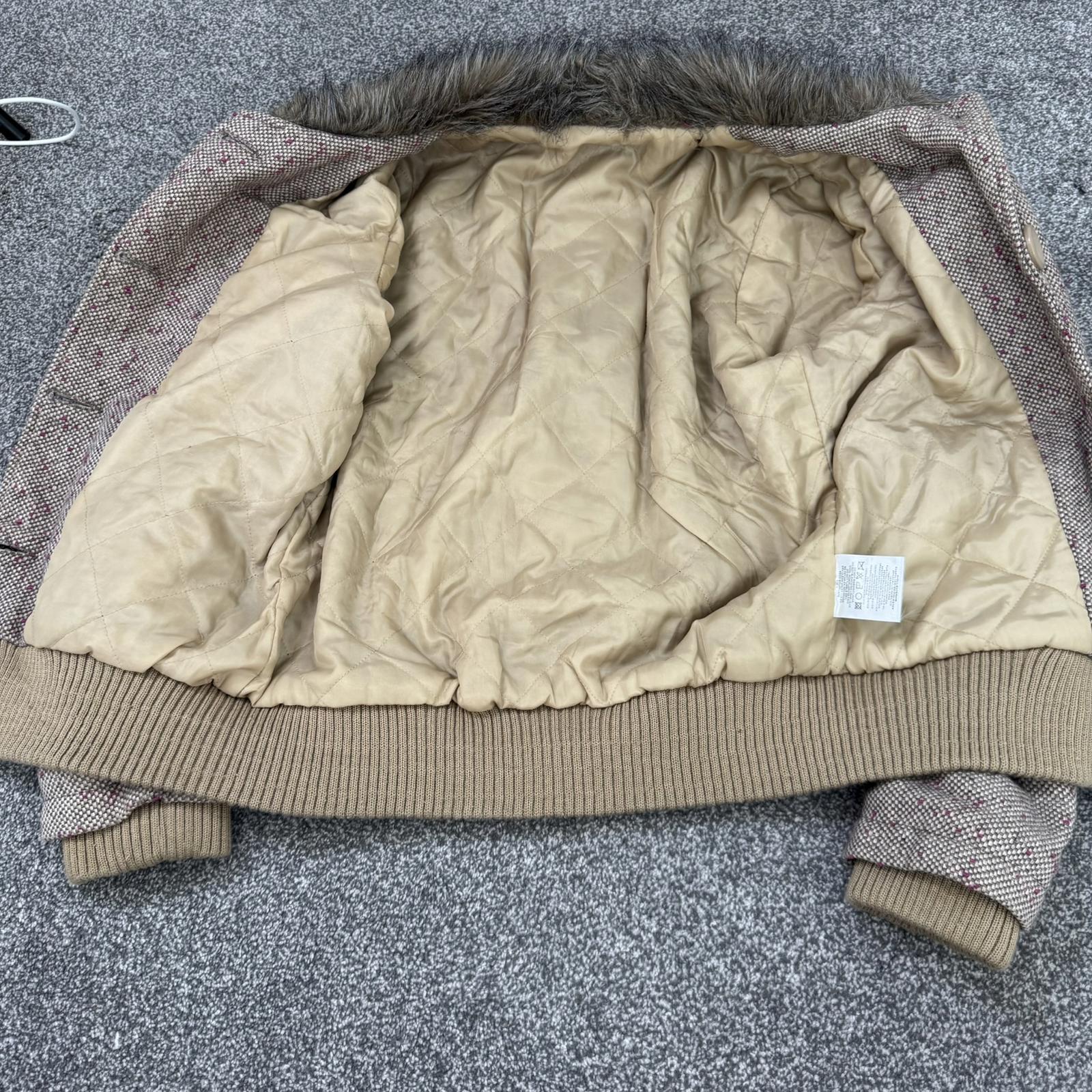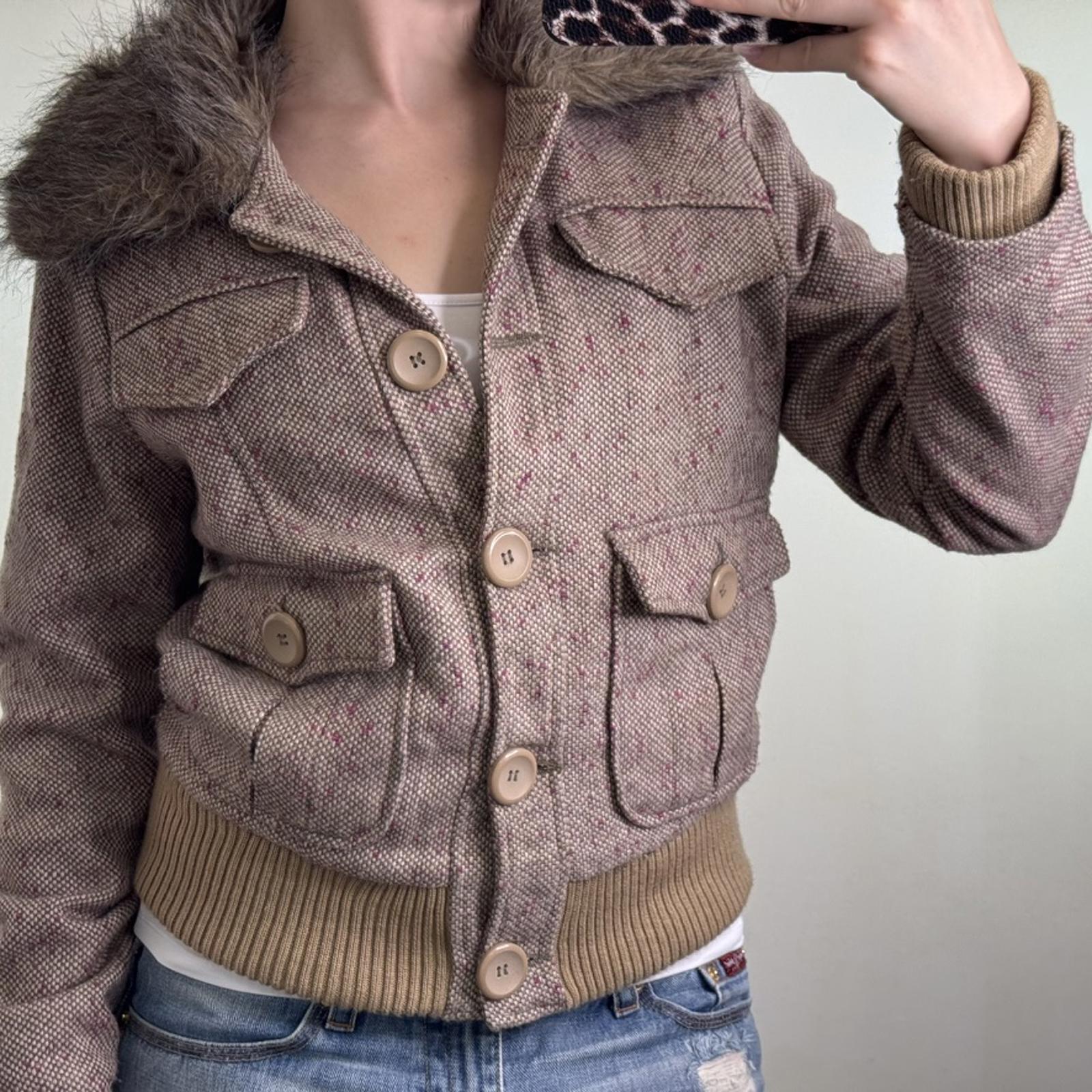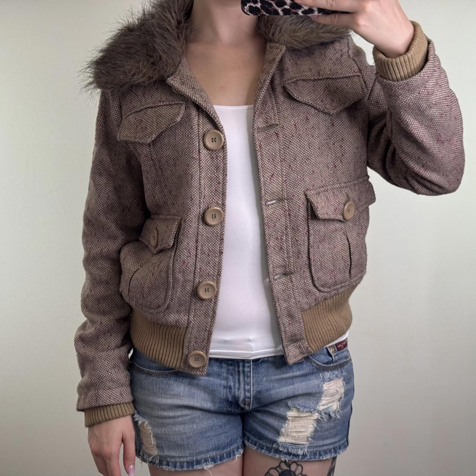 Y2K vintage tweed wool blend button up coat winter jacket faux fur trim collar