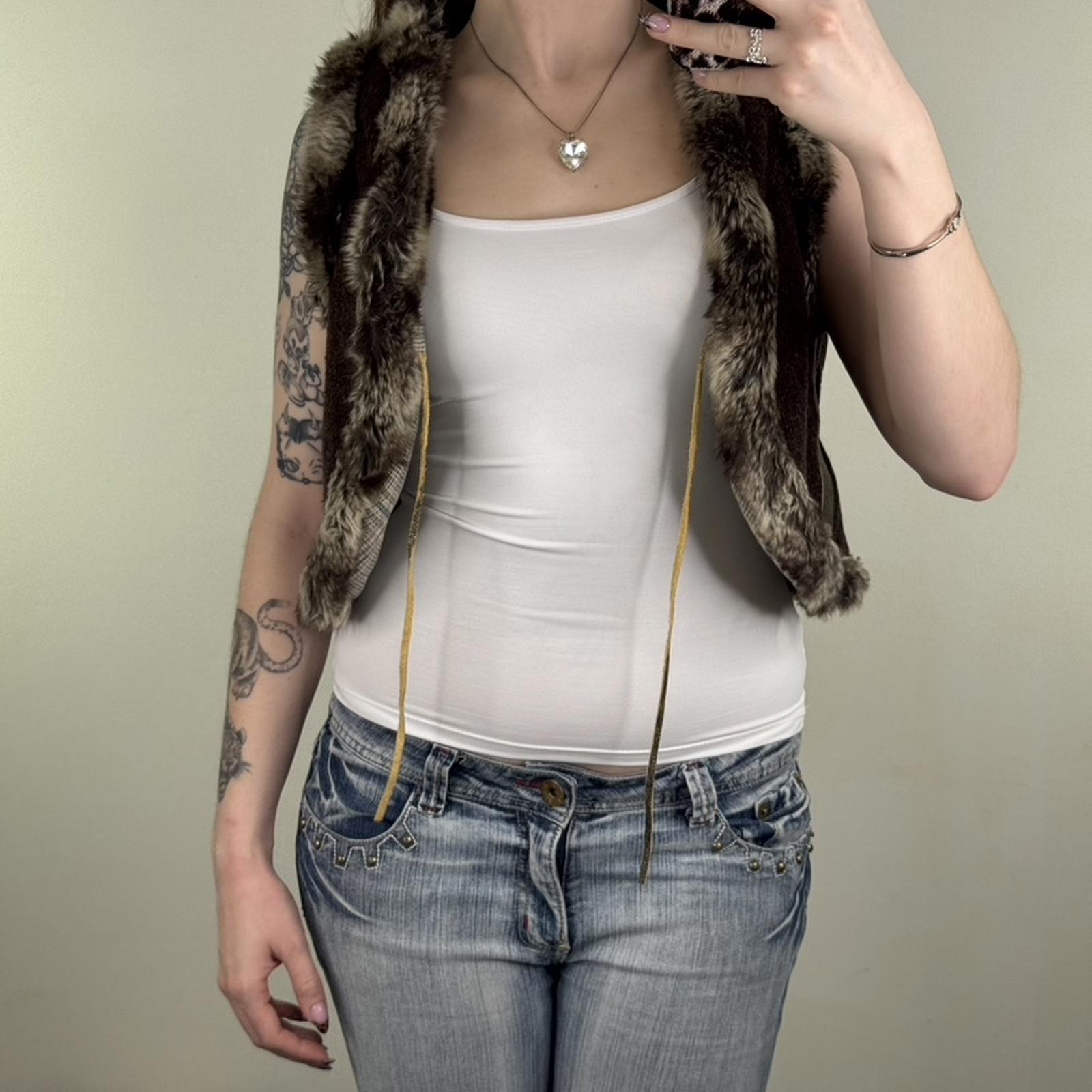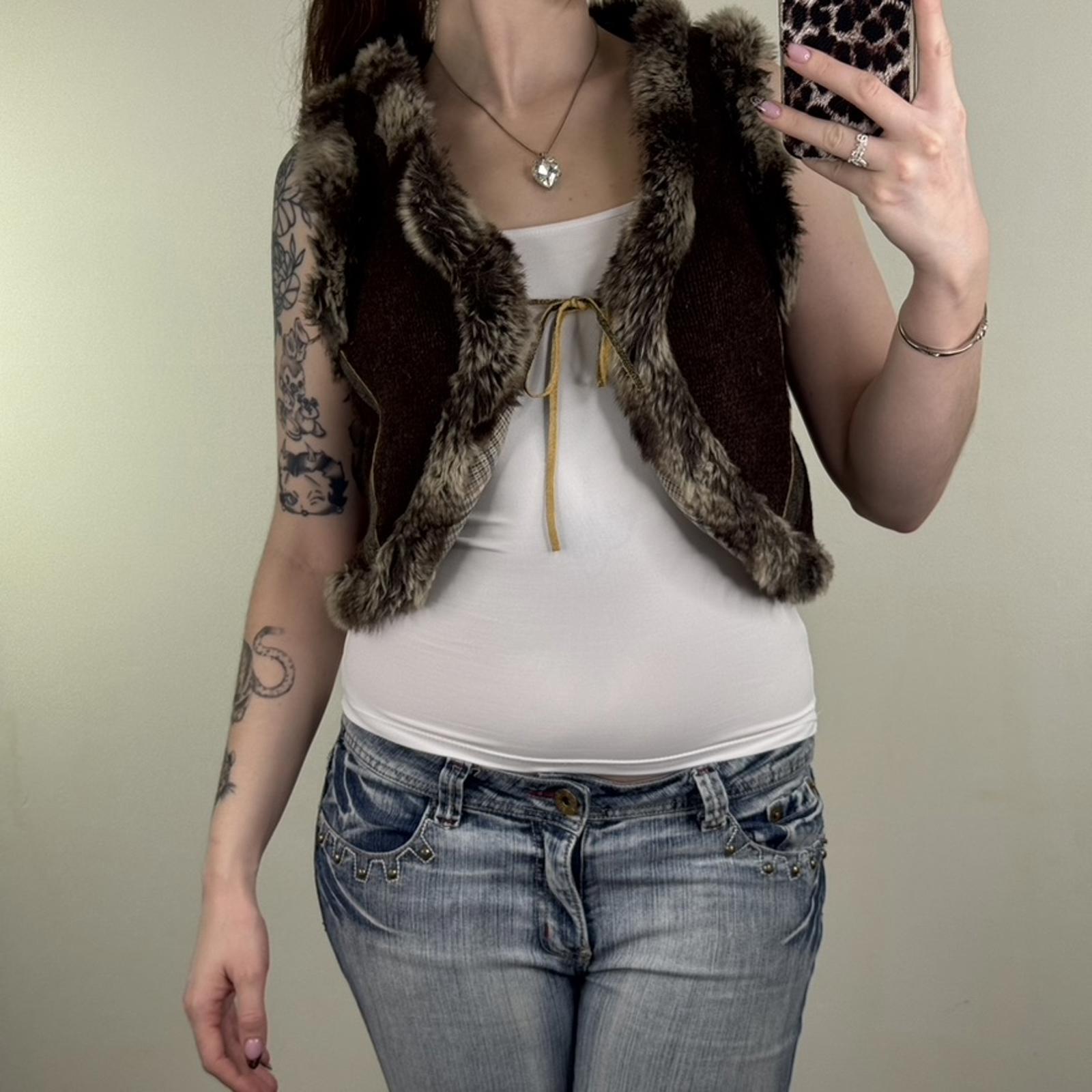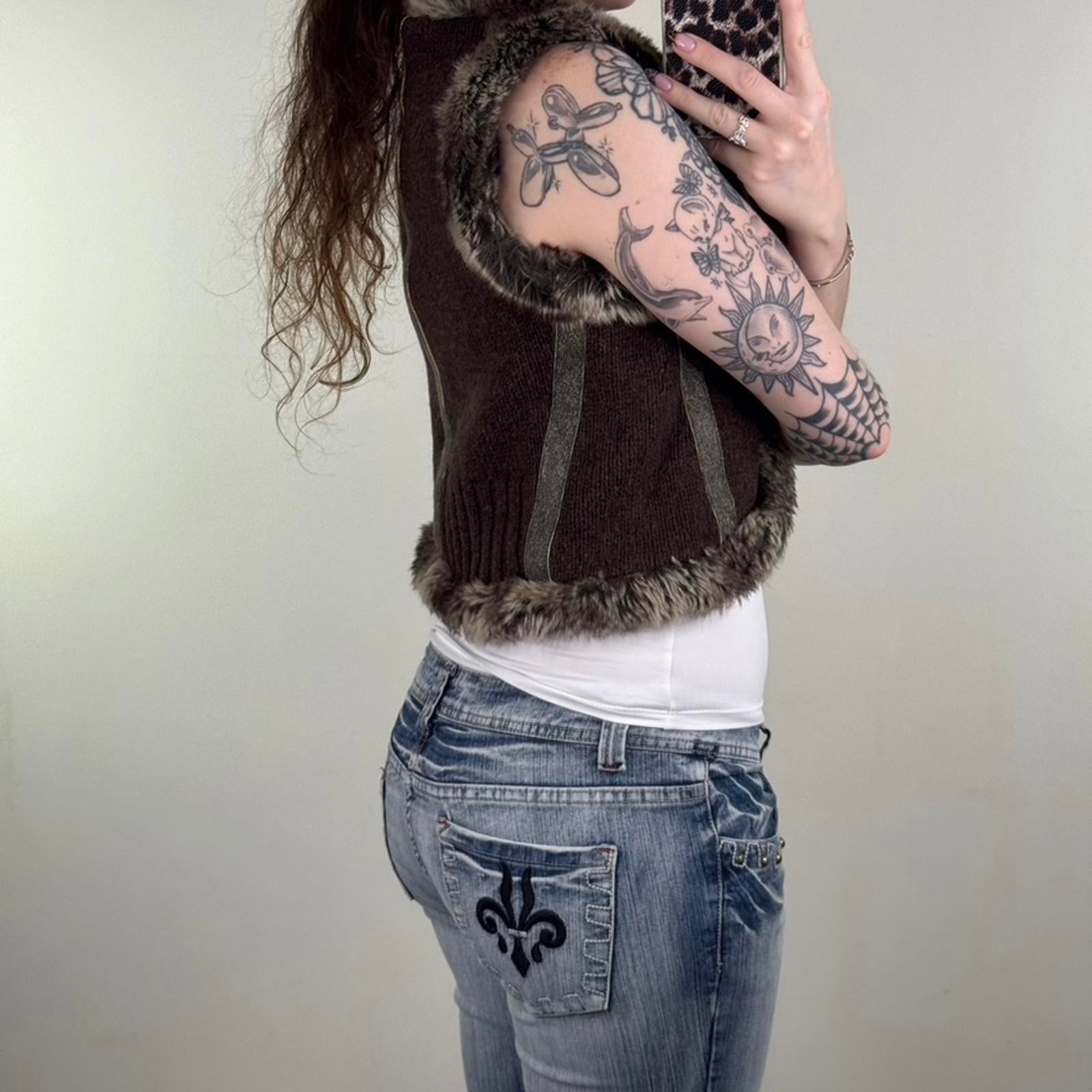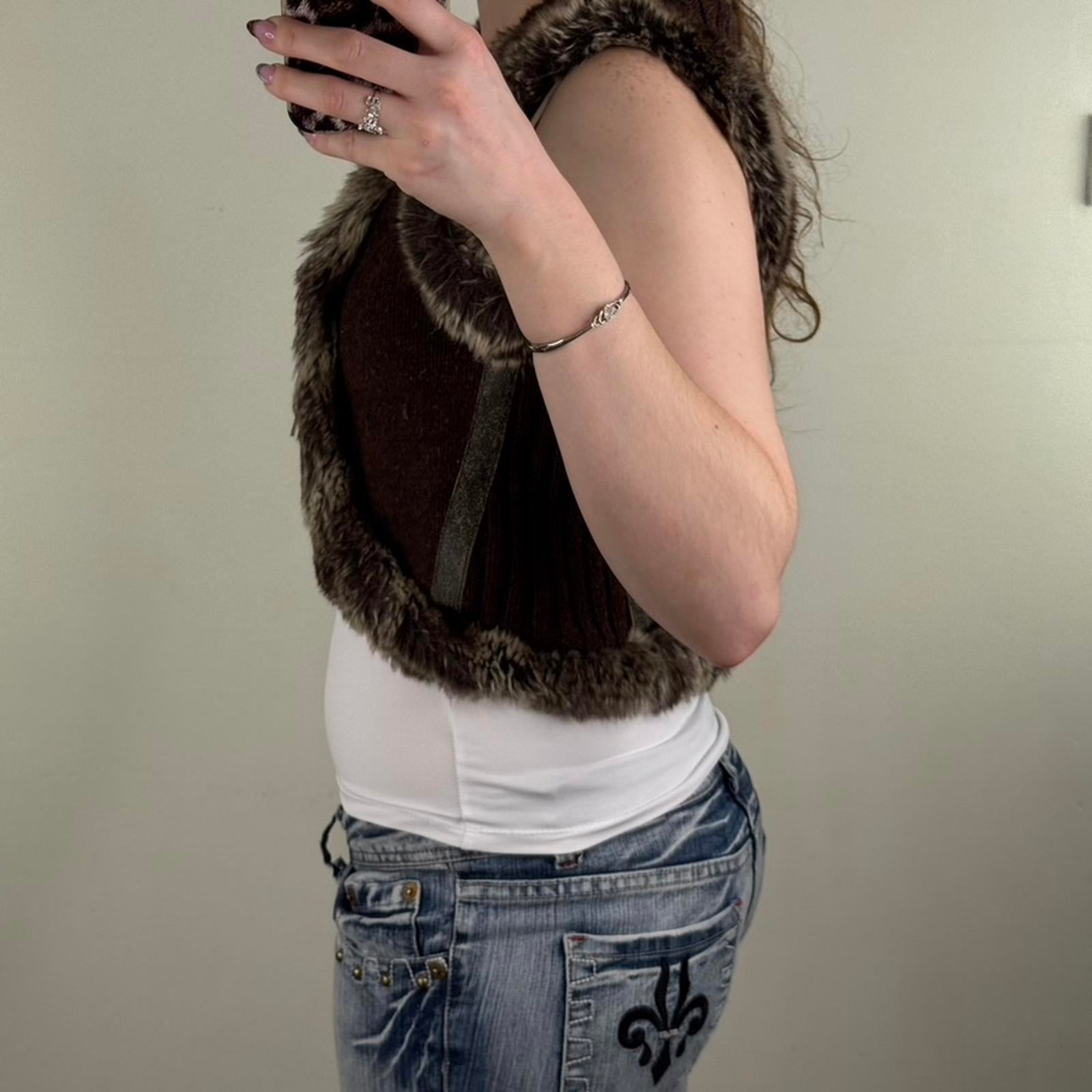 Y2K vintage wool blend gilet faux fur cropped knit open bow front sleeveless